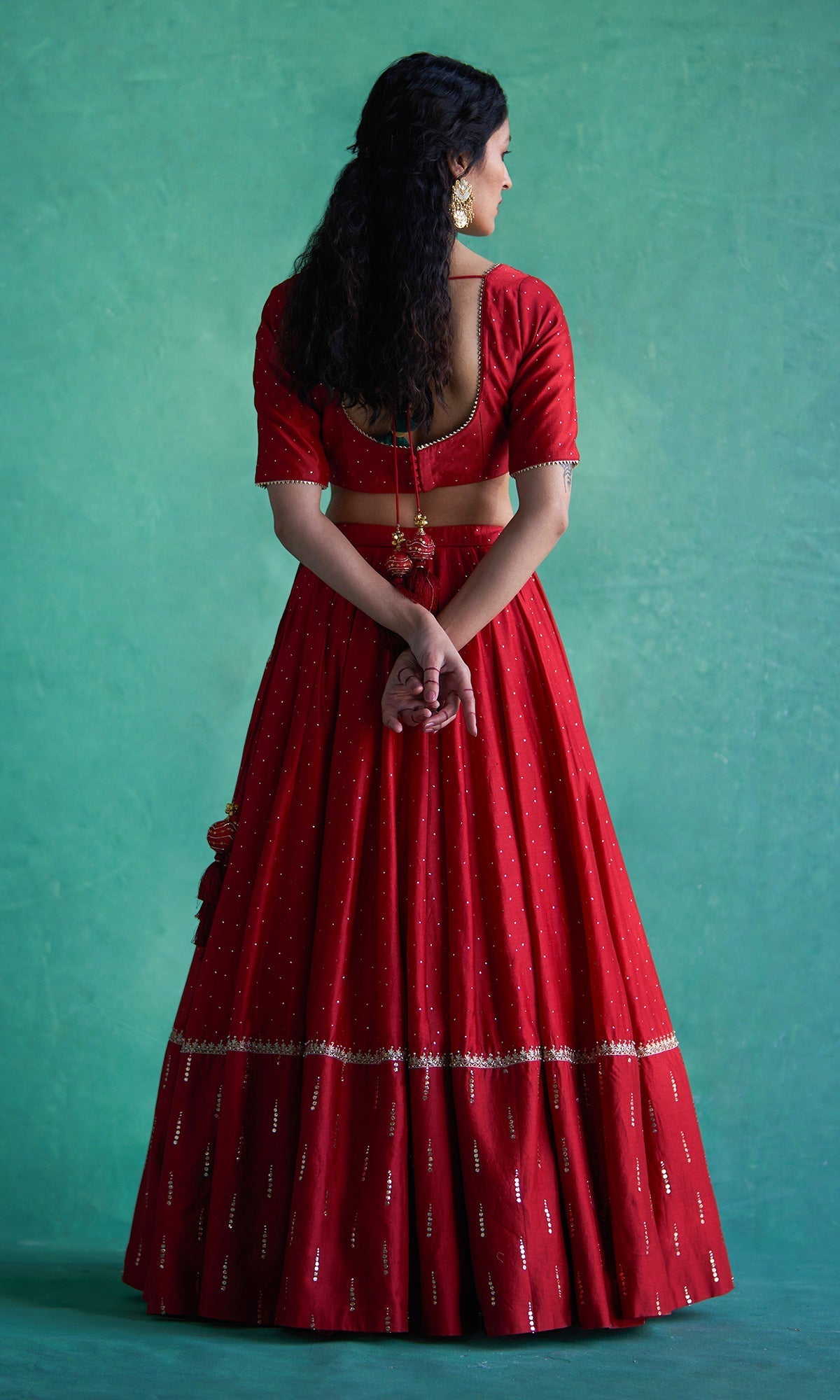 This set includes solid red mukaish lehenga with blouse and organza dupatta.Lehenga is lined with mul and cancan. Lehenga is detailed with aari and hand embroidery with side pockets and dori tassels.Blouse is detailed with gota lace and piping. Organza dupatta detailed with hand embroidery .