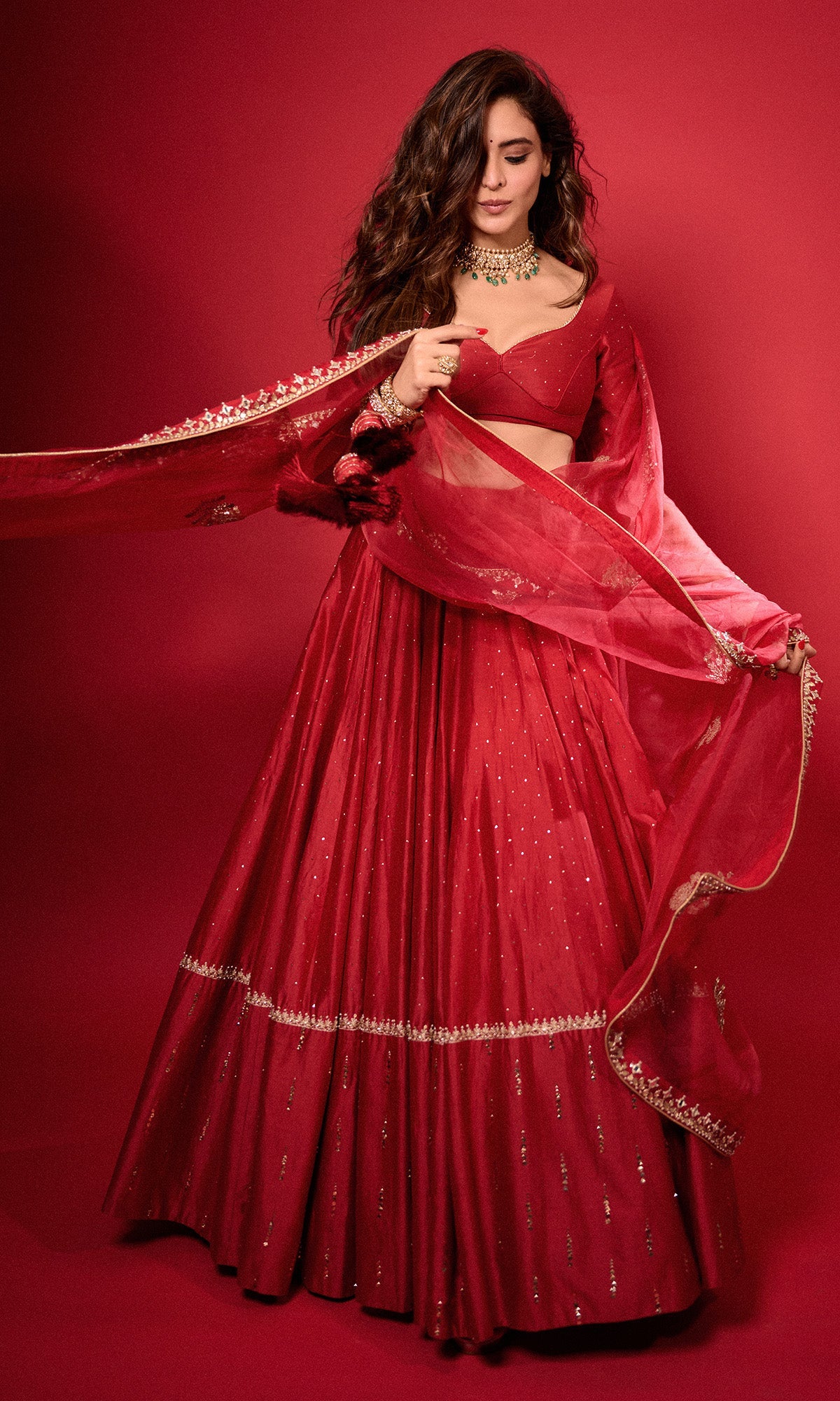 Aamna Sharif in Haseena Red Mukaish Chanderi Lehenga With Choli Cut Blouse And Embroidered Dupatta (Set Of 3)