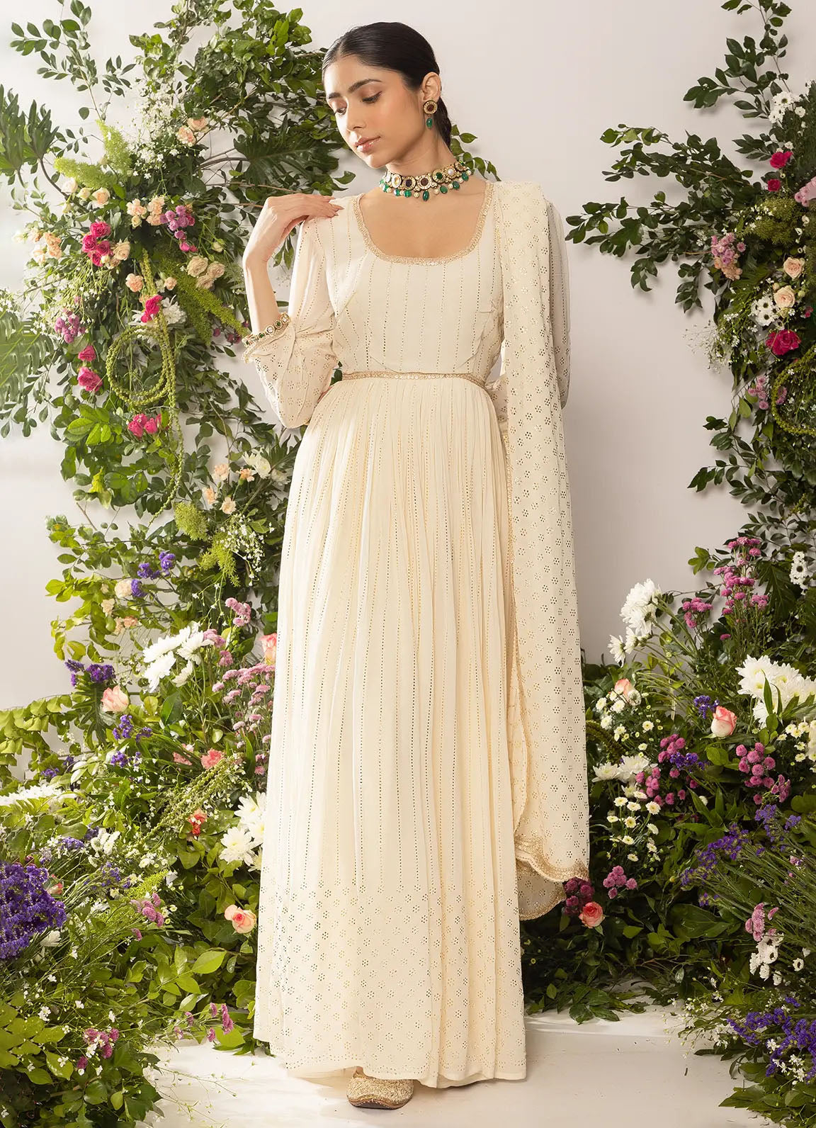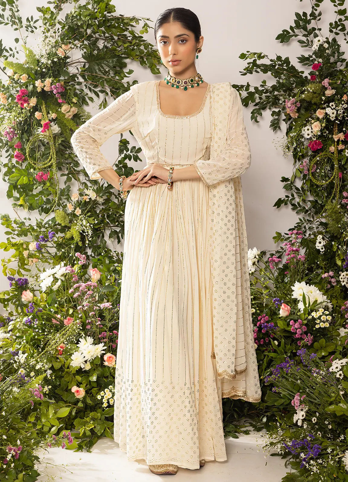 - Bring your style game to perfection with this astoria Ivory Mukaish Work Anarkali with Dupatta.