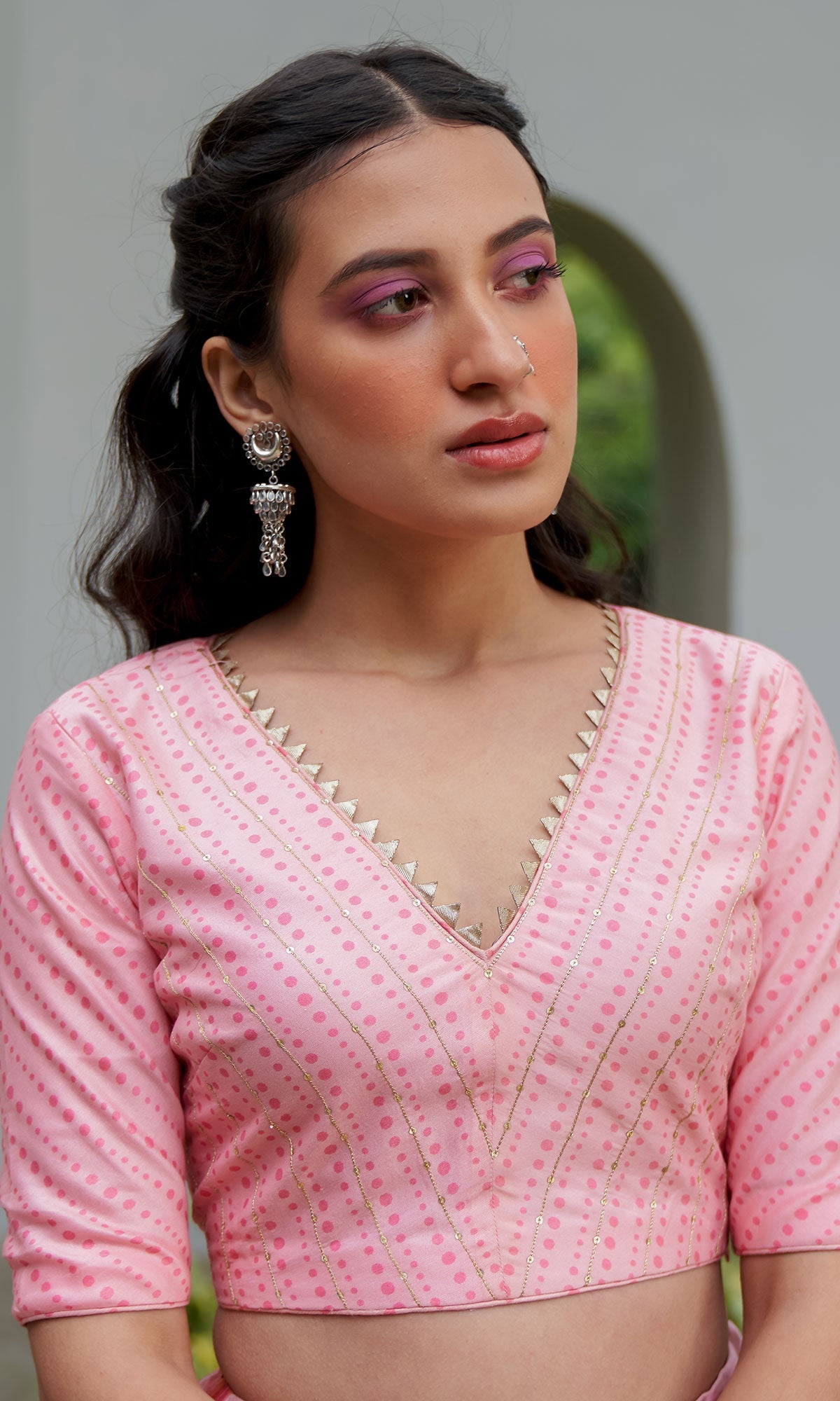 The blouse has sequins & zari embroidery. It is with a lehenga. Dupatta has sequins & mirror work and is finished with scallop border and tassel detailing.