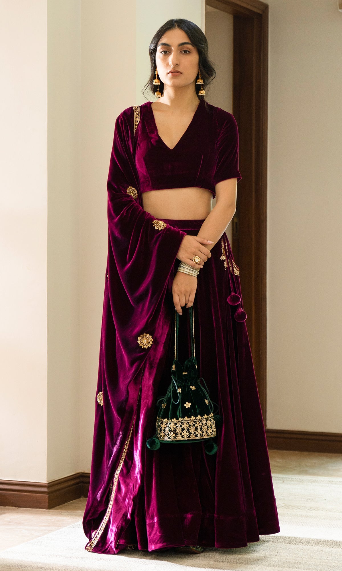 This 3 pc set includes Silk velvet blouse, lehenga and shawl.