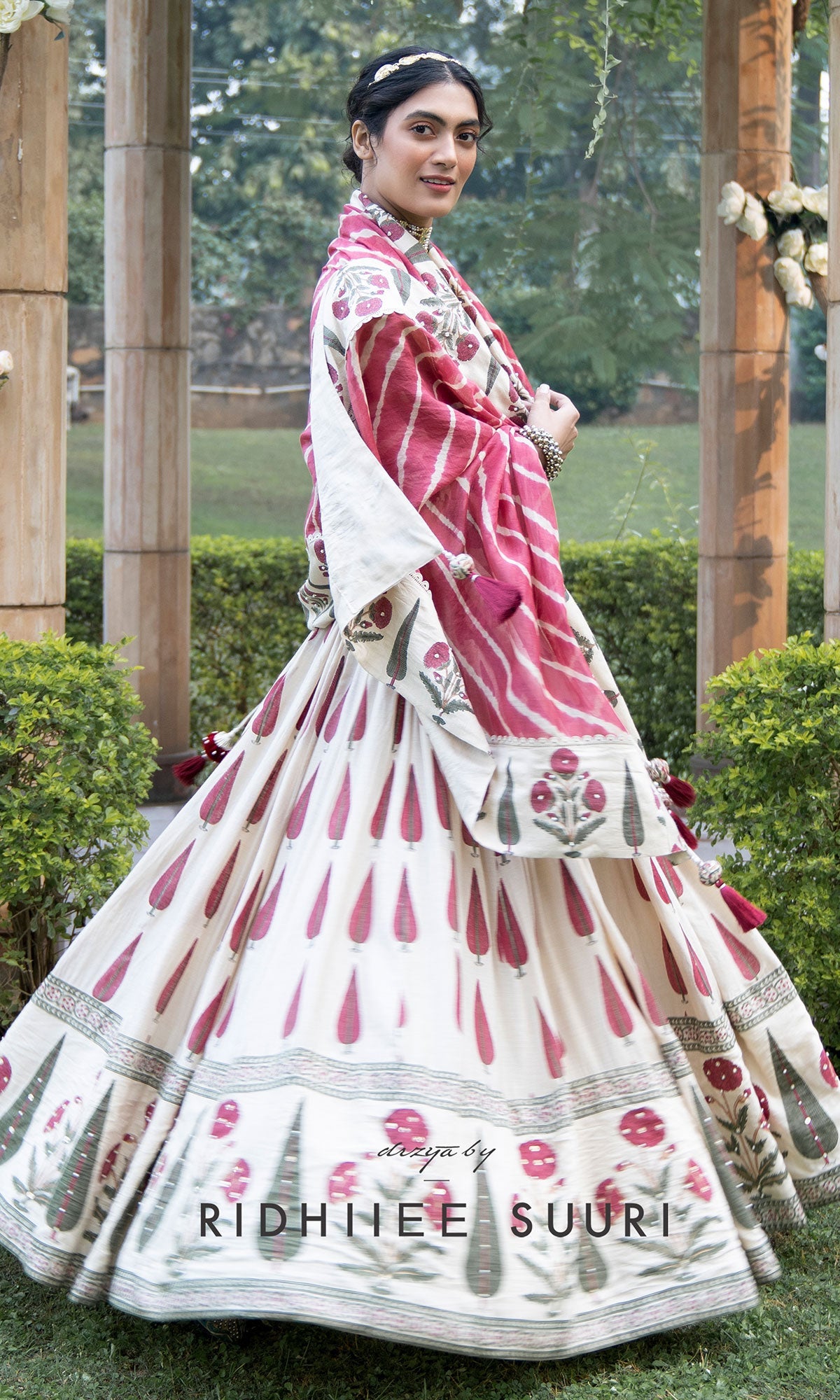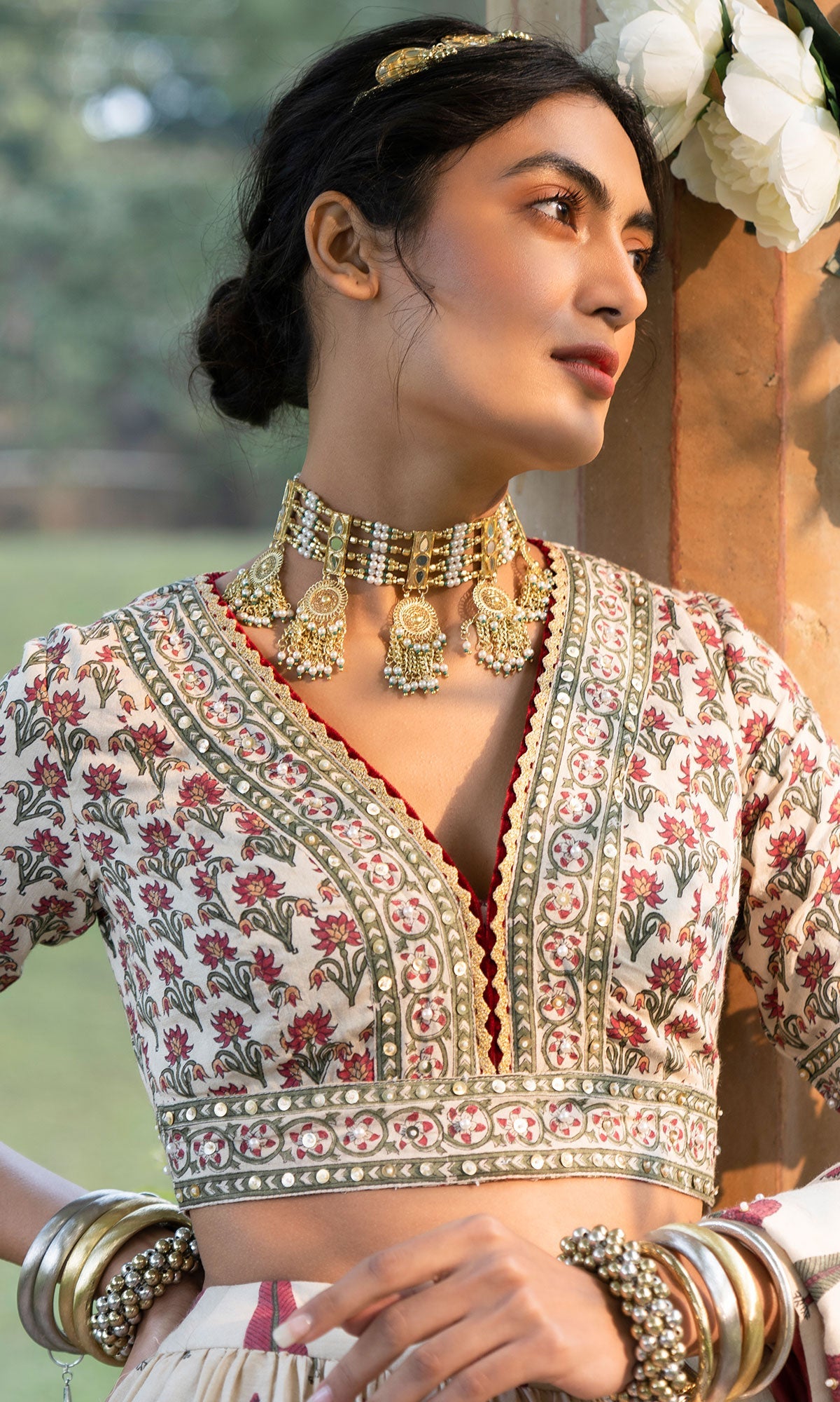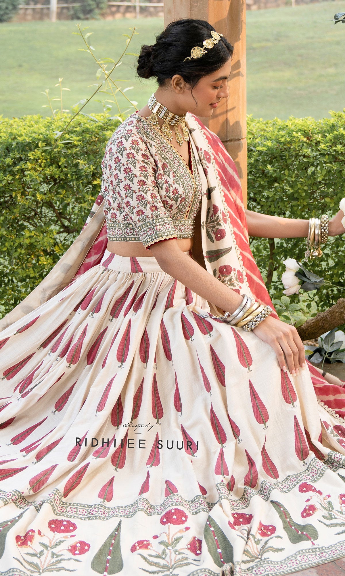 This set includes a block printed blouse, block printed lehenga, and leheriya and block print dupatta. This set is embellished with sequins & pearl embroidery.