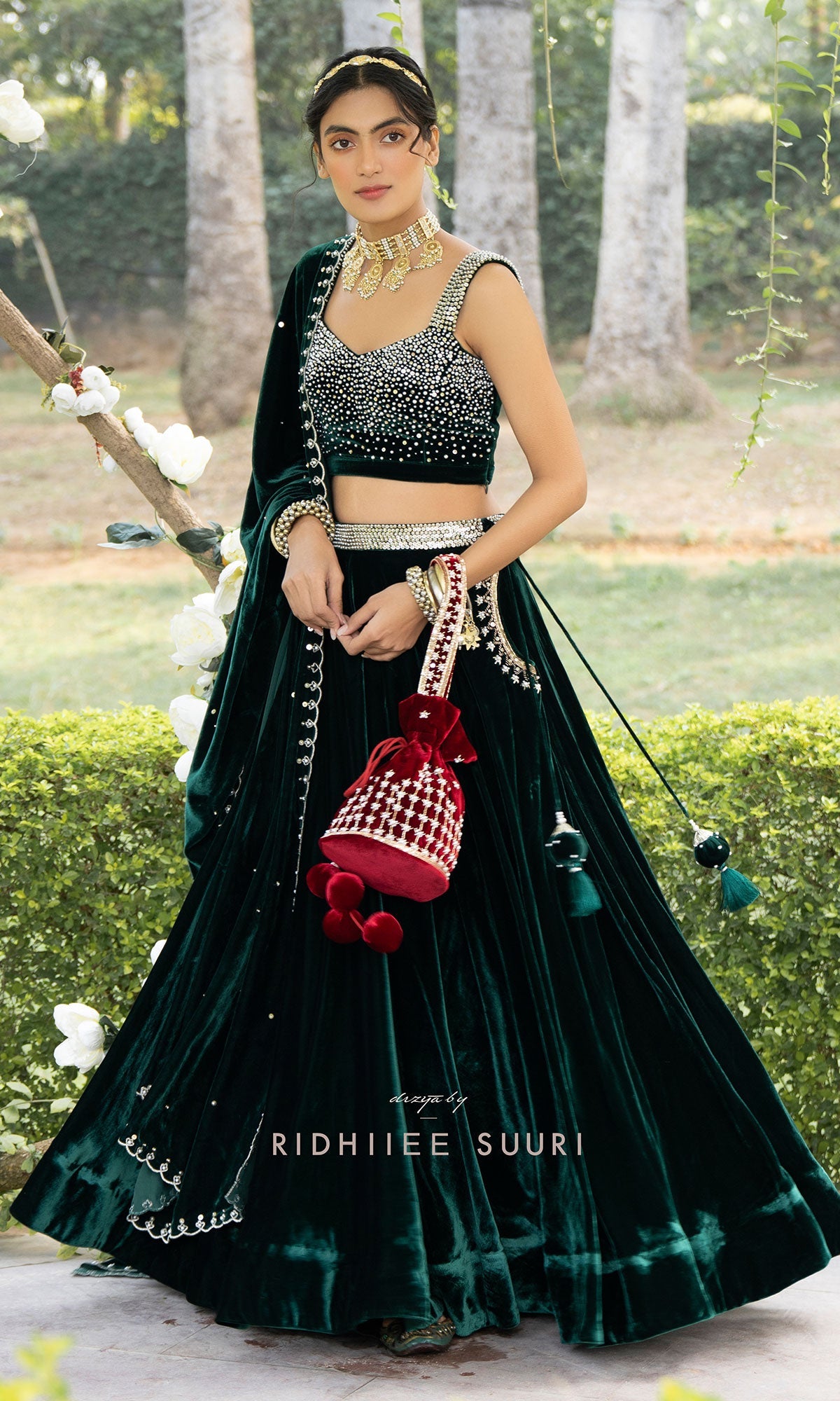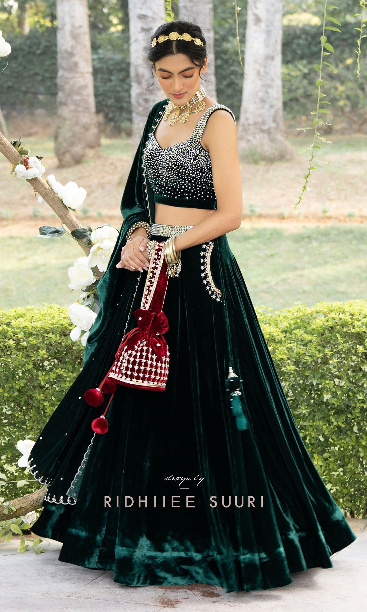 Bareen Mughals Bottle Green Silk Velvet Lehenga With Velvet Embroidered Bustier & Shawl- Set Of 3