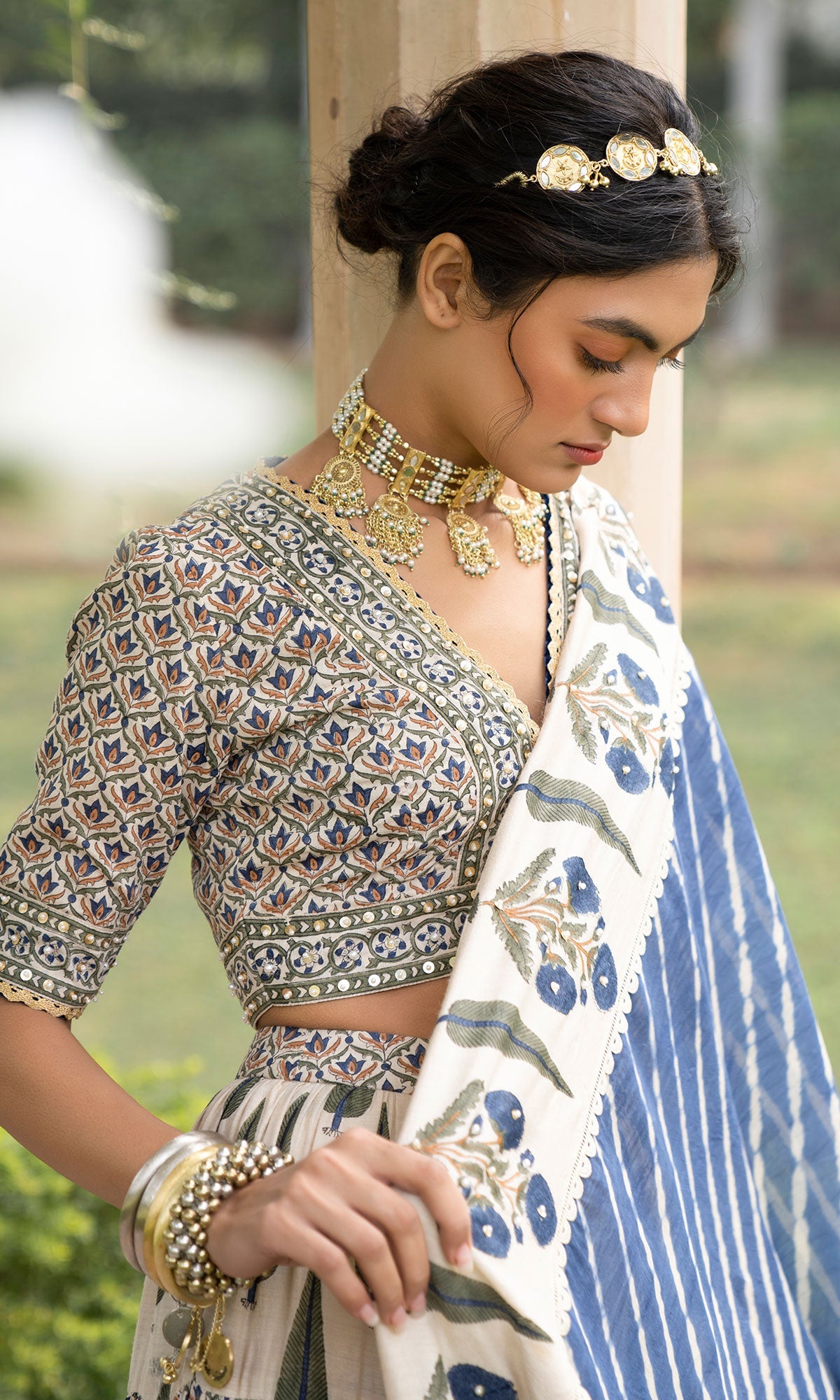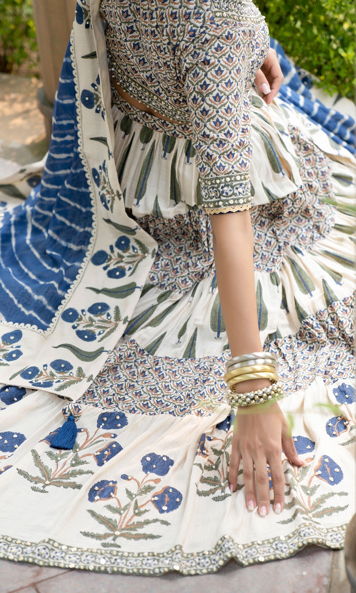 This set includes Block printed monga silk blouse and lehanga, embellished with sequins and peal embroidery. Lehariya and block printed dupatta embellished with pearl and sequins embroidery.