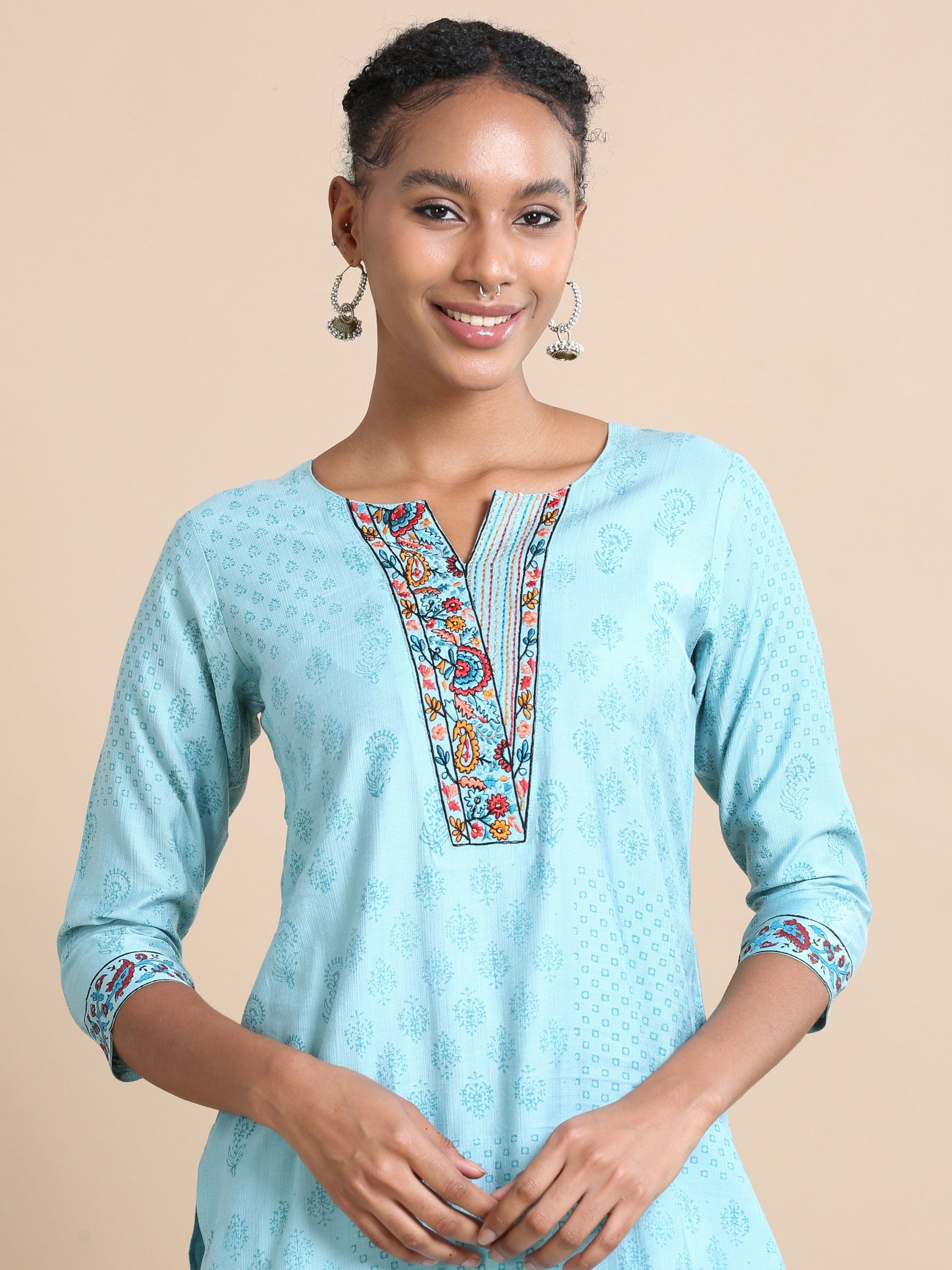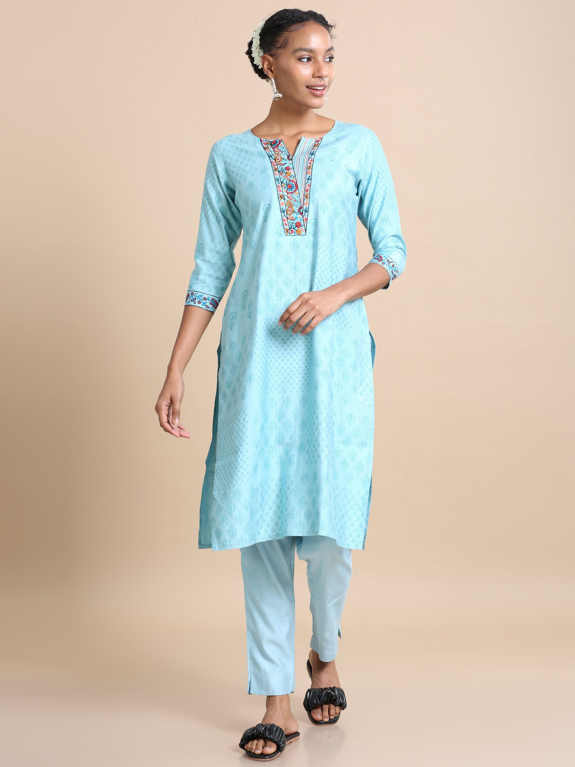 Introducing our Blue Kurta Set from the Festive Collection, a captivating ensemble designed to elevate your festive style. The kurta, crafted from luxurious Chanderi fabric, is a pull-on style adorned with intricate thread work at the neckline placket. With a regular fit and calf length, the midi kurta features a round neck, making it an ideal choice for festive wear. The straight silhouette, 3/4th sleeves, and side slit contribute to its graceful appearance, enhanced by a charming block print.Accompanying the kurta is our Blue Pants, made from solid Chanderi fabric. These pants provide a regular fit, ankle length, pull-on style, mid-rise, and an elastic waist for comfort. The Chanderi Blue Dupatta with traditional motifs completes the set, adding a touch of sophistication to the overall look.Elevate your festive attire with this Blue Kurta Set.