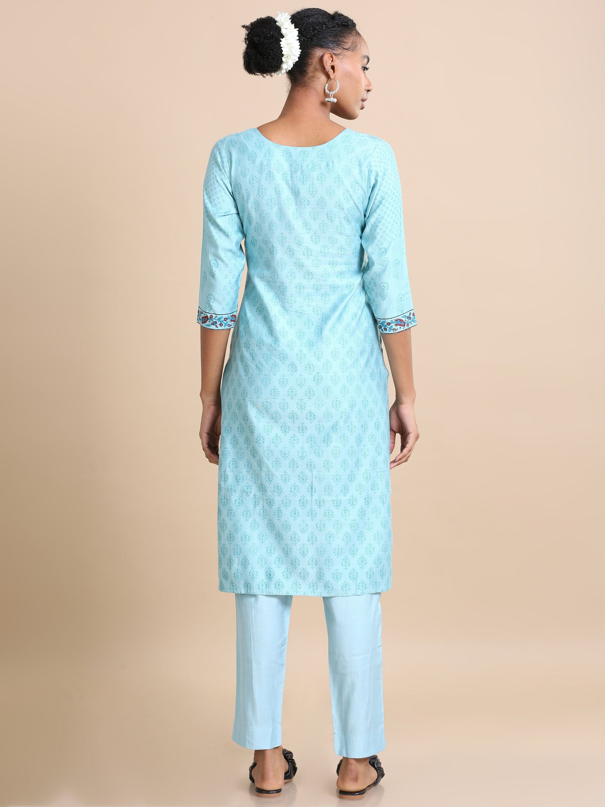 Blue 3/4th sleeves Chanderi Block print Regular fit Calf length Kurta Set - With Dupatta