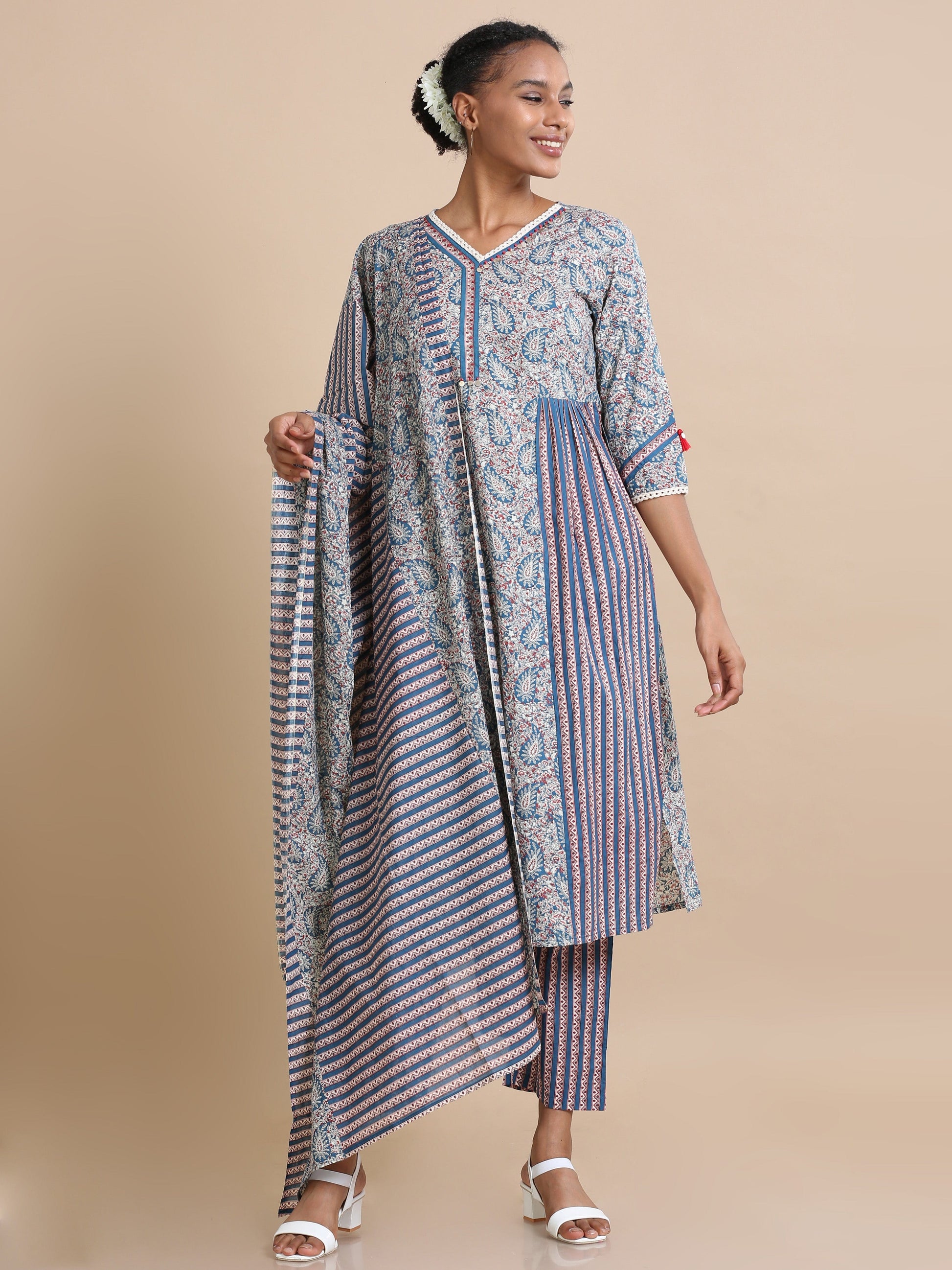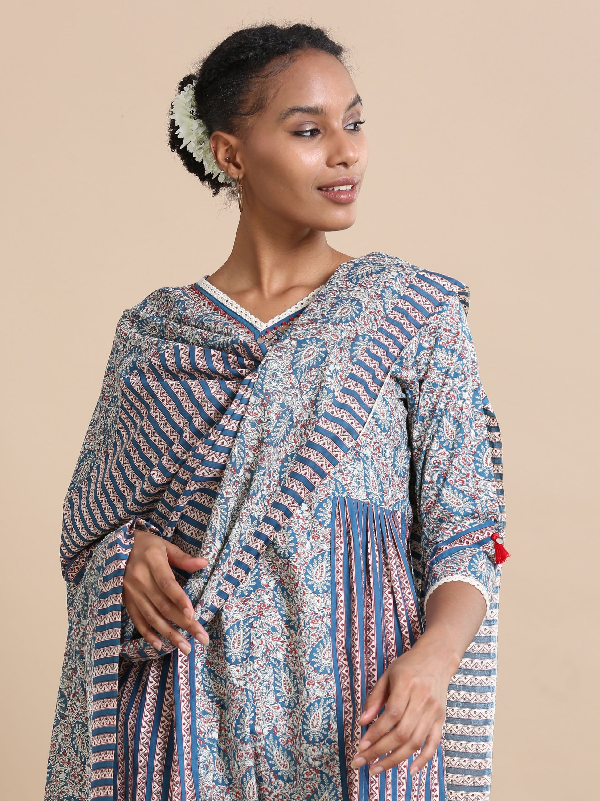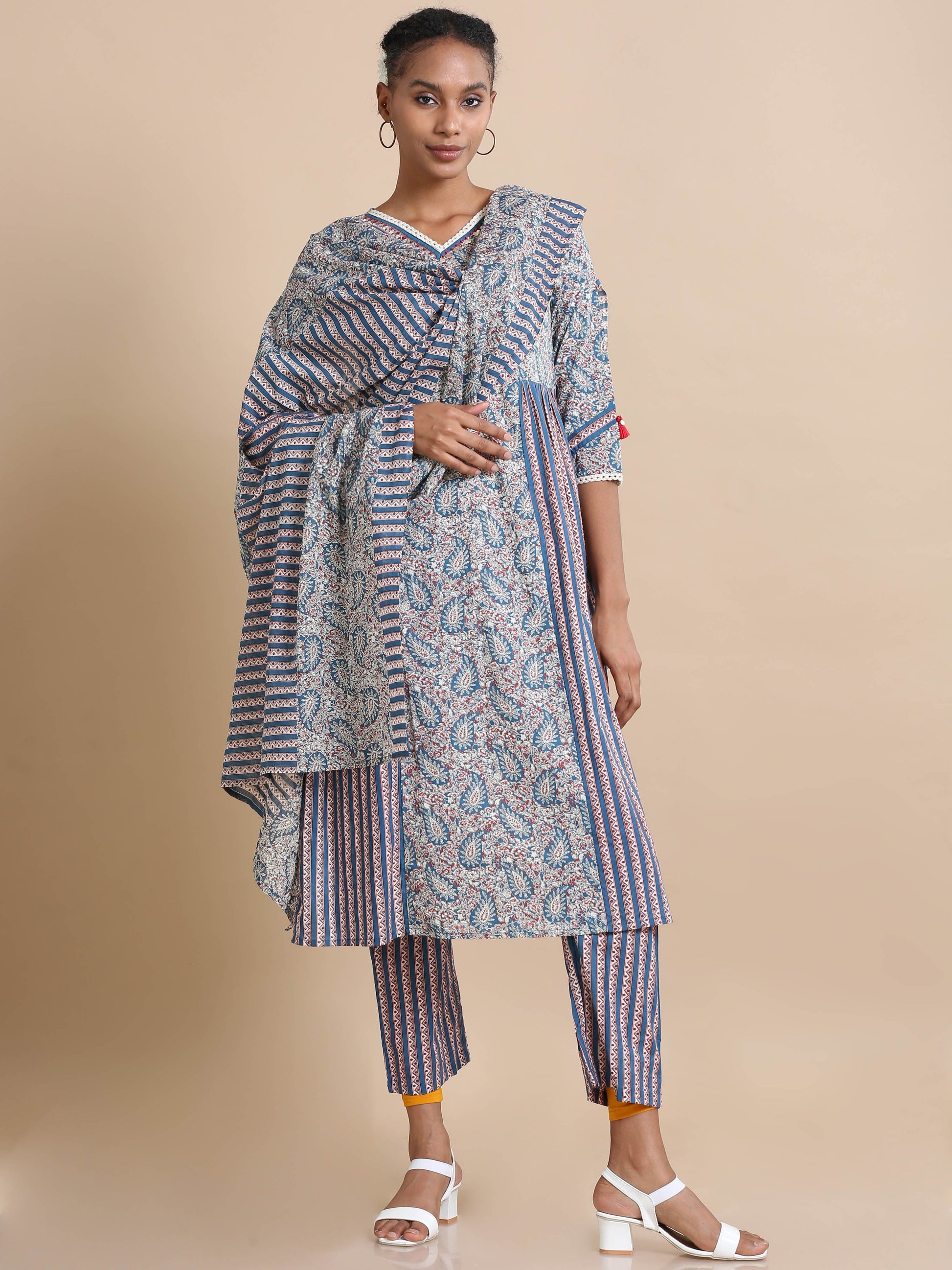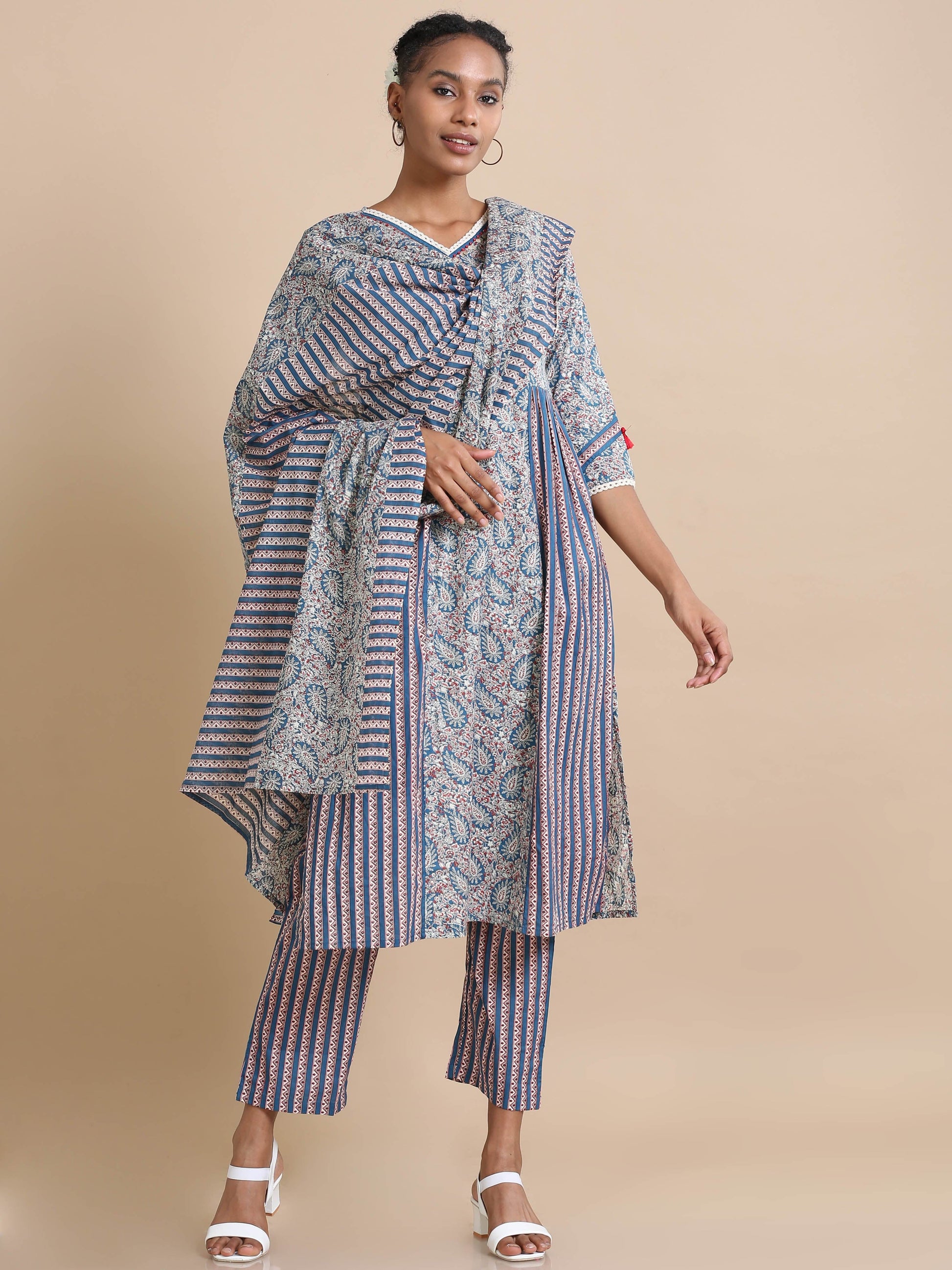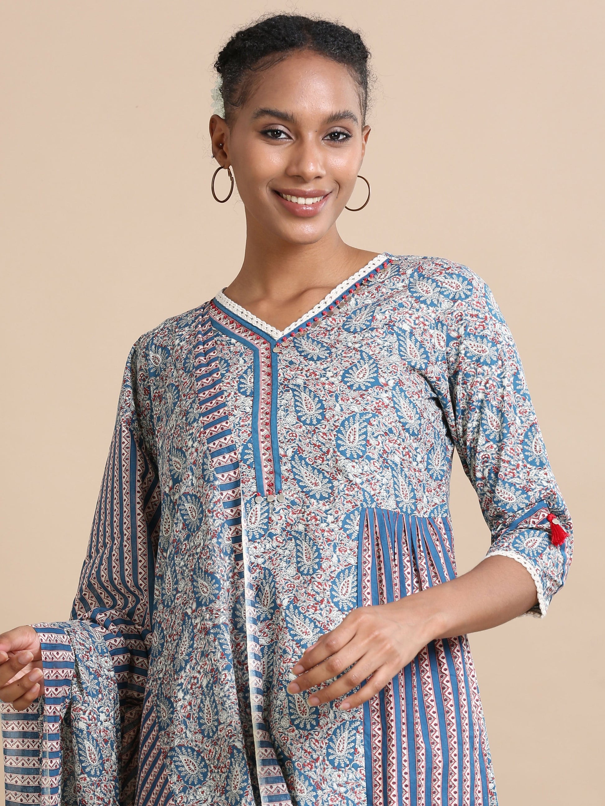Blue 3/4th sleeves Cotton Floral print, embellishments Regular fit Calf length Kurta Set - With Dupatta