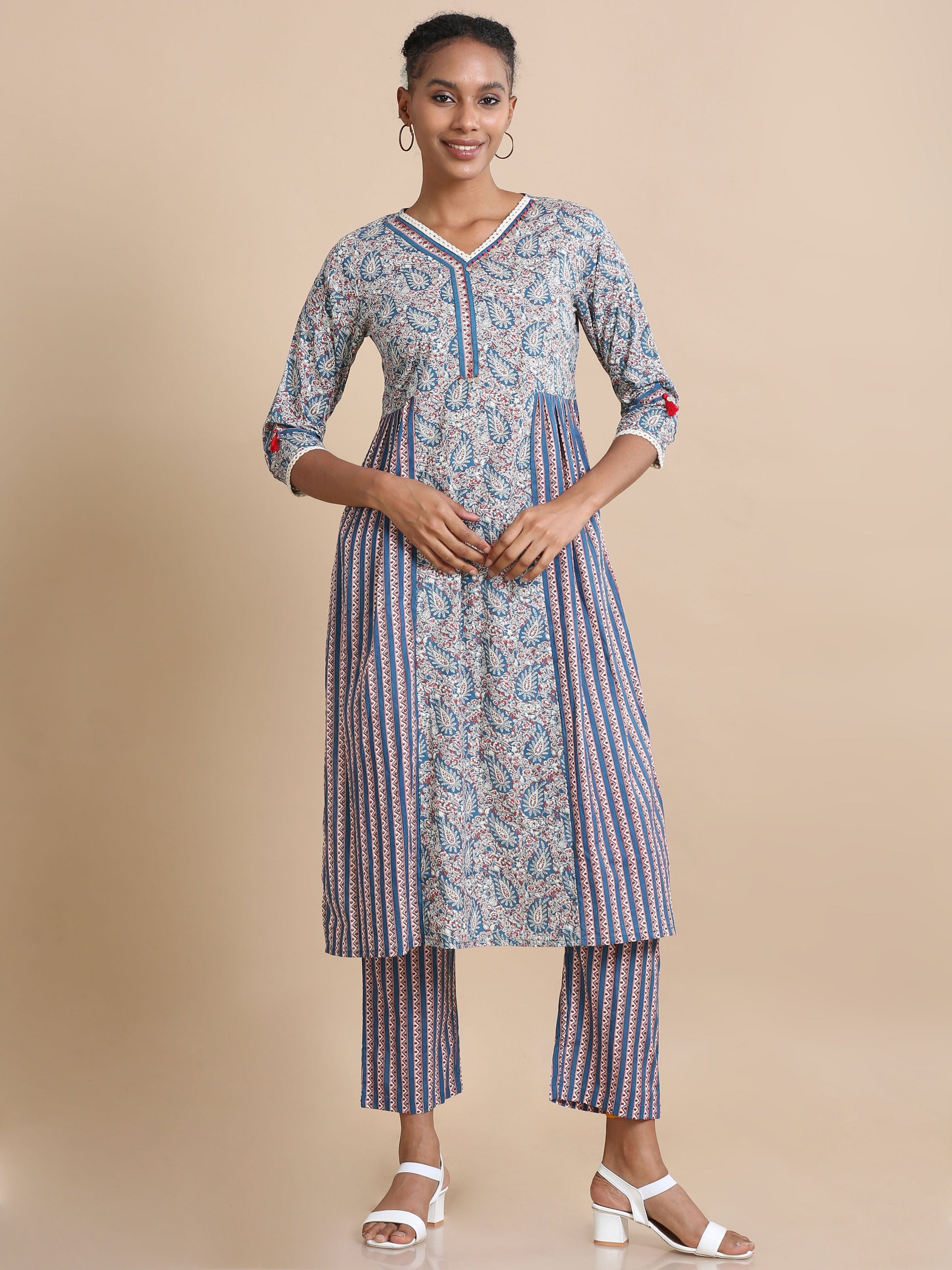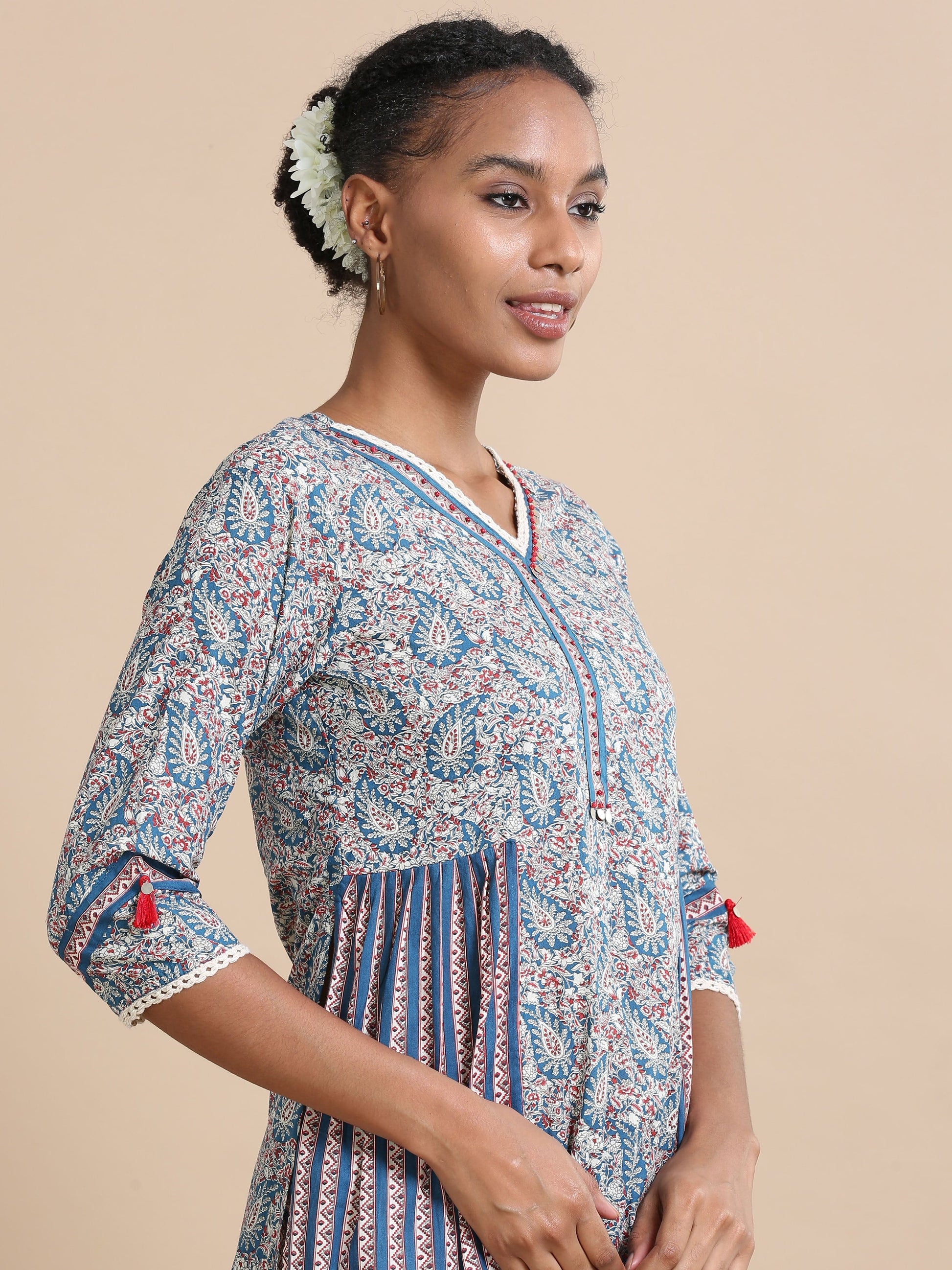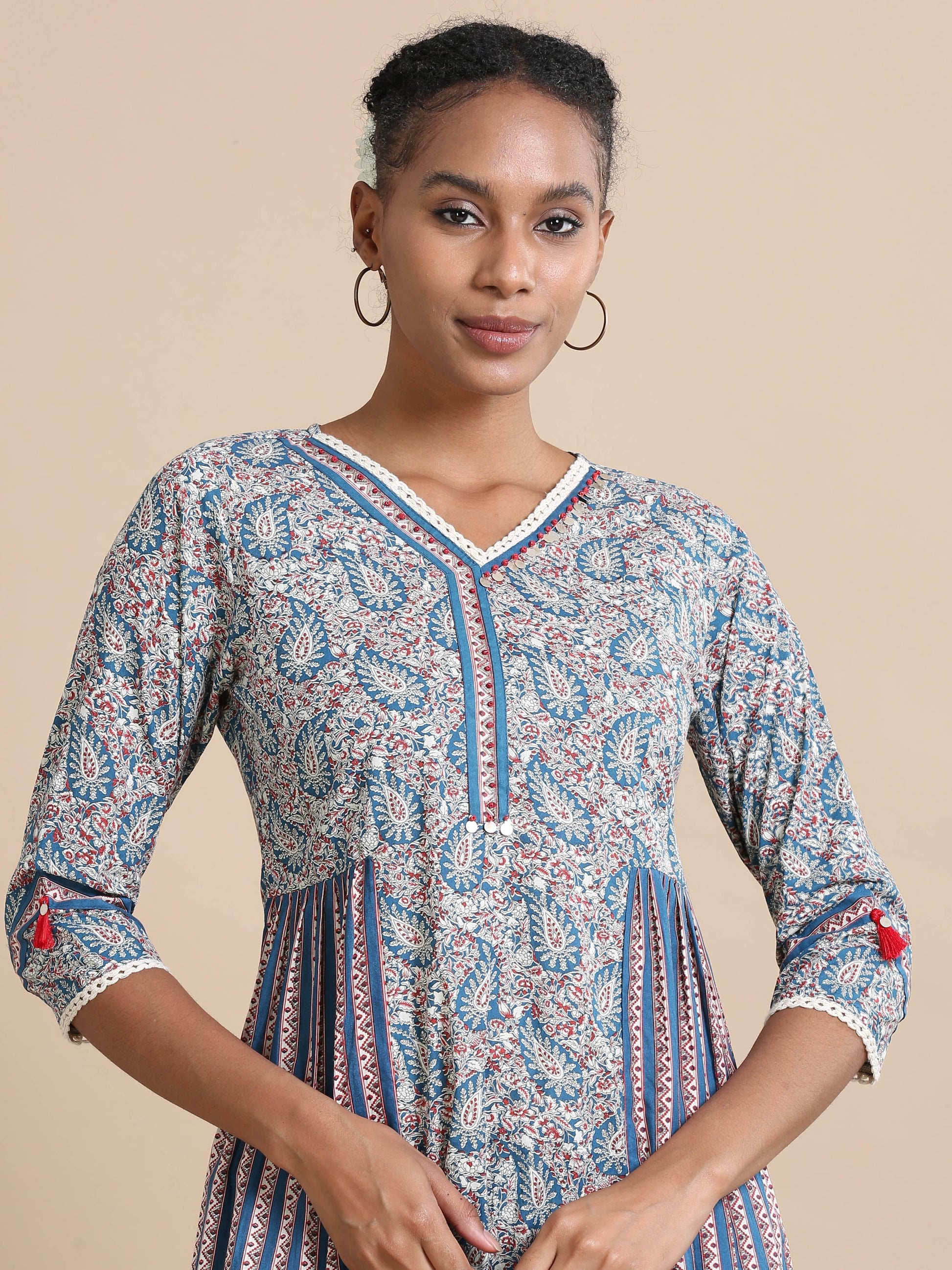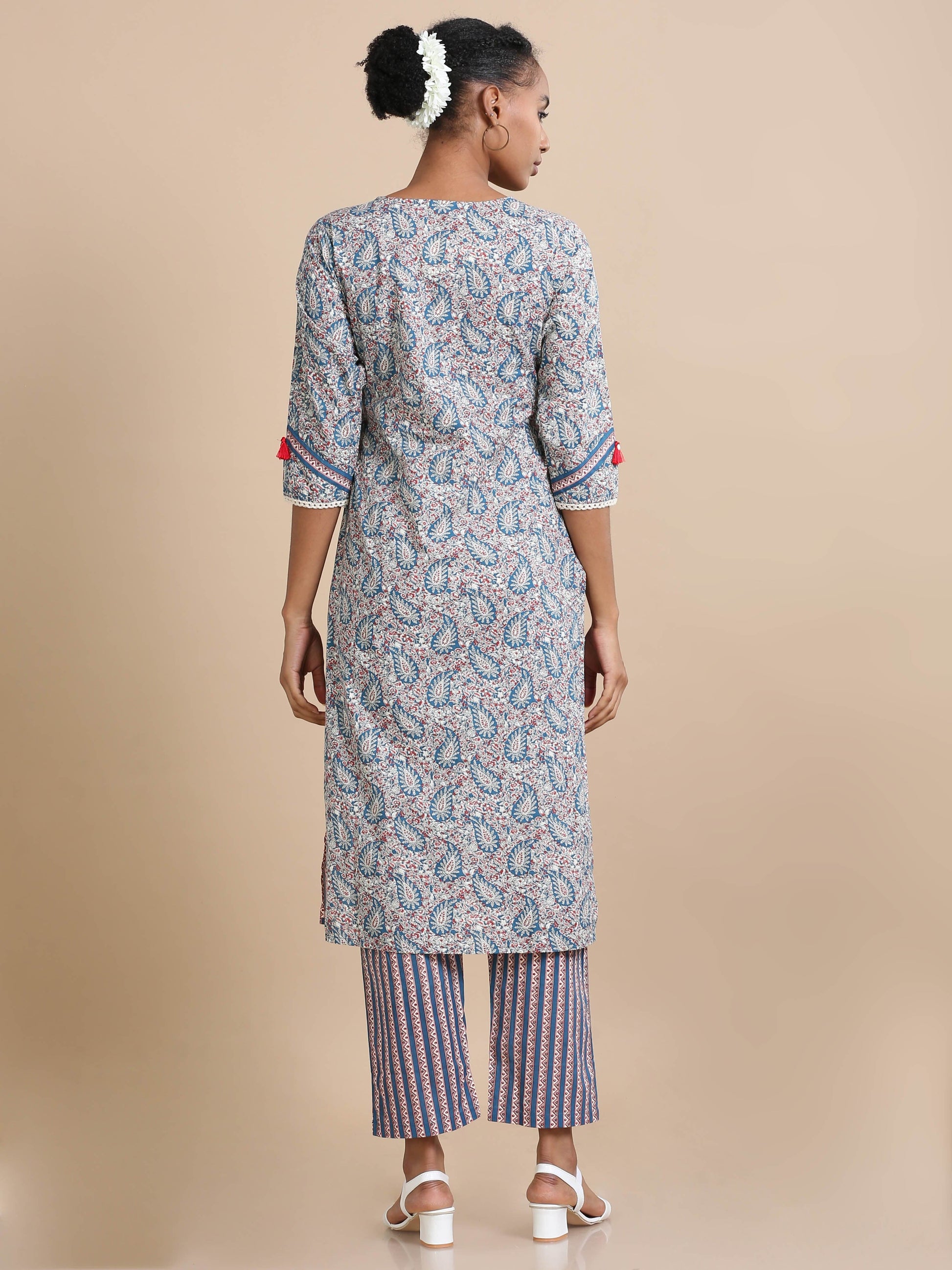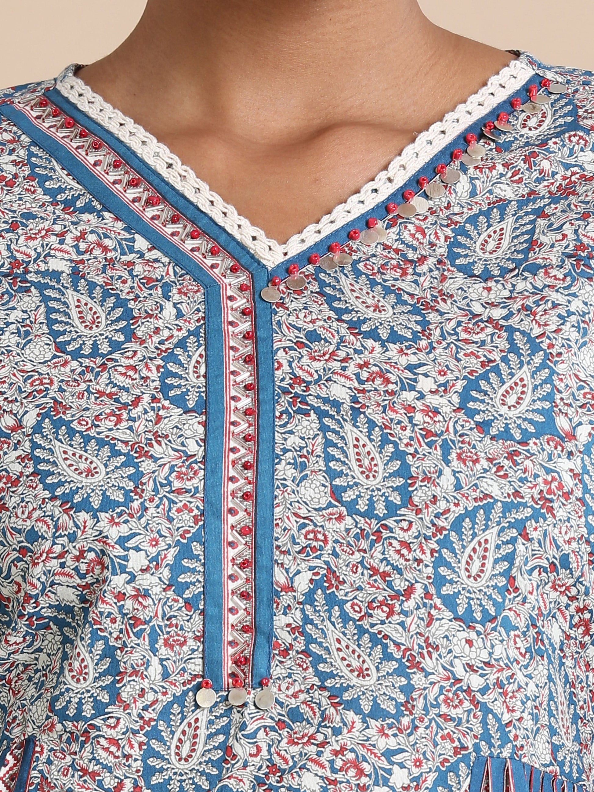 Blue 3/4th sleeves Cotton Floral print, embellishments Regular fit Calf length Kurta Set - With Dupatta