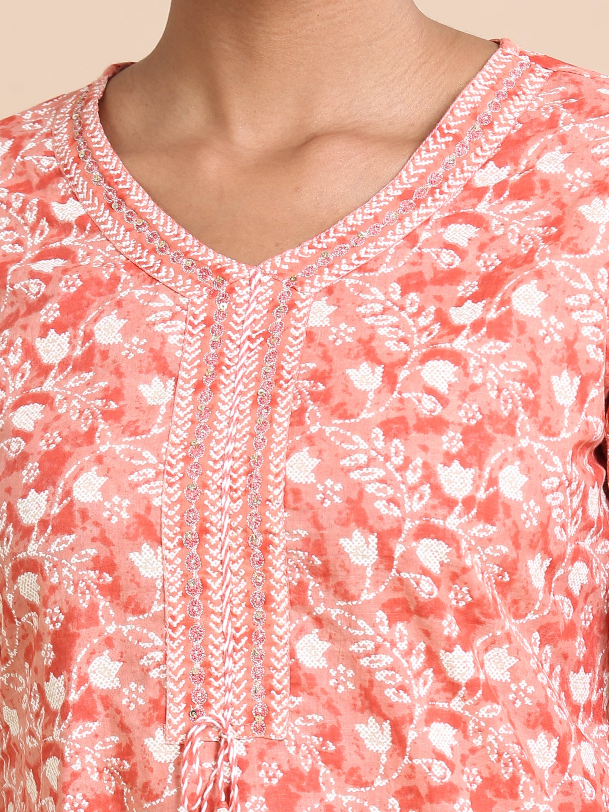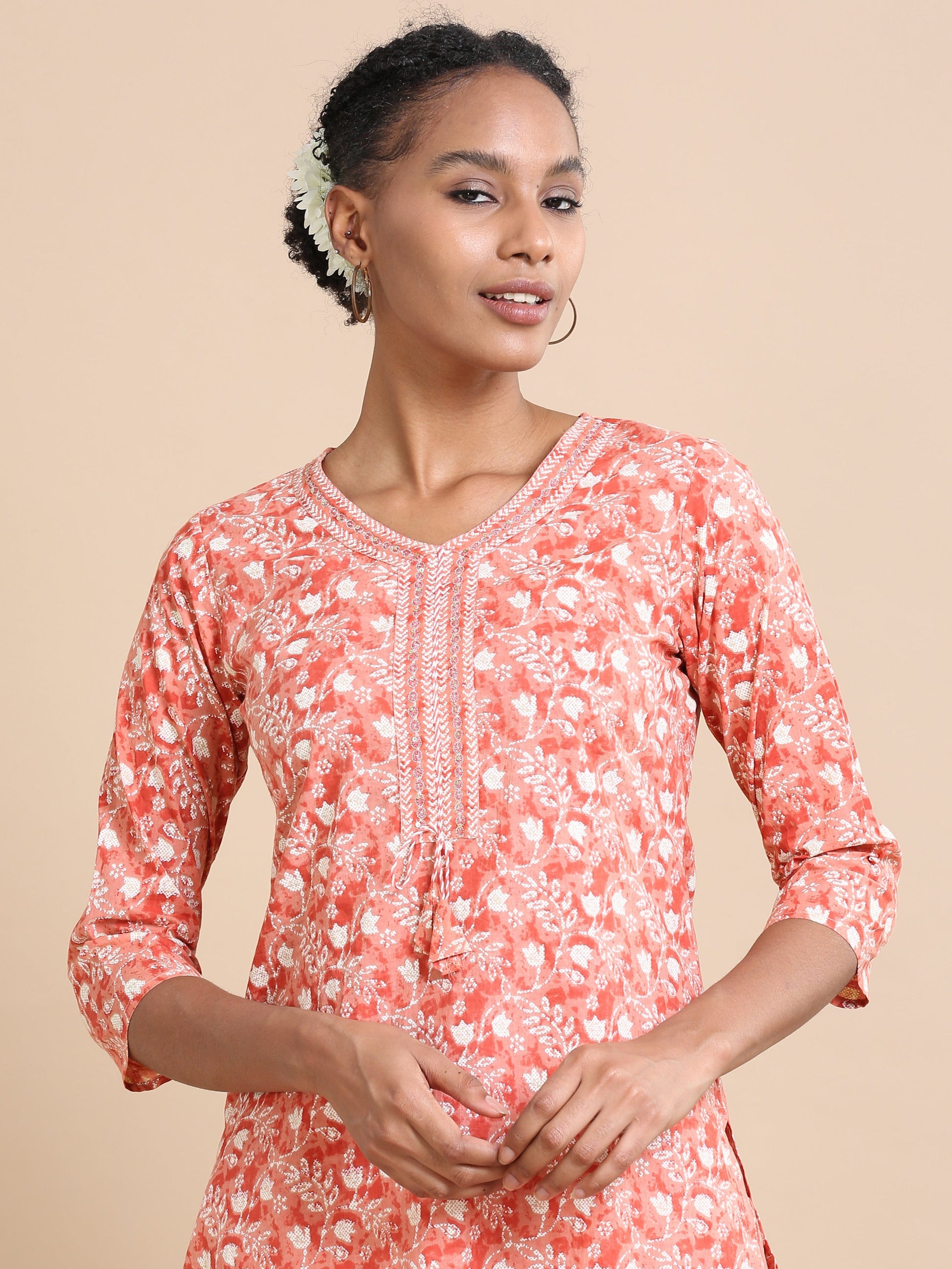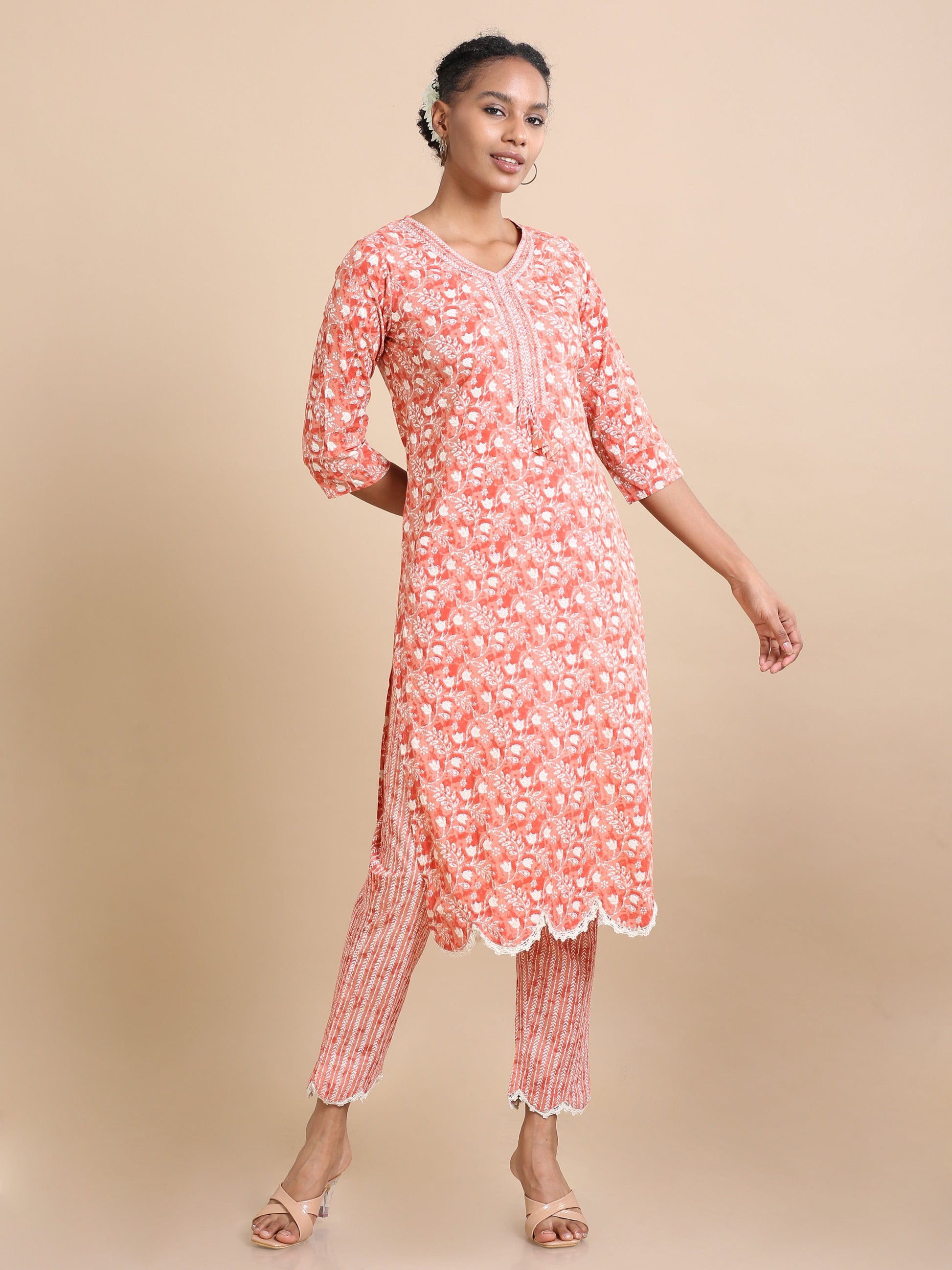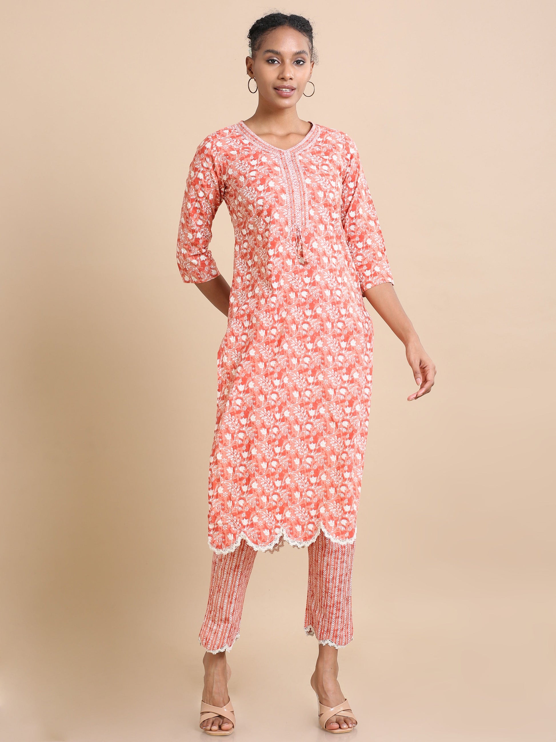 This brick-colored kurta set is part of a festive collection and features a pull-on style made from comfortable cotton fabric. The kurta is adorned with drawstrings at the front and a scallop hemline, adding a unique and festive touch. The regular-fit midi-length kurta has a calf-length hem and a V-neck design. It is embellished with floral print, has a straight silhouette, 3/4th sleeves, and a regular fit. The kurta also features side slits for ease of movement. Care instructions recommend hand wash, gentle wash, and washing light colors separately.