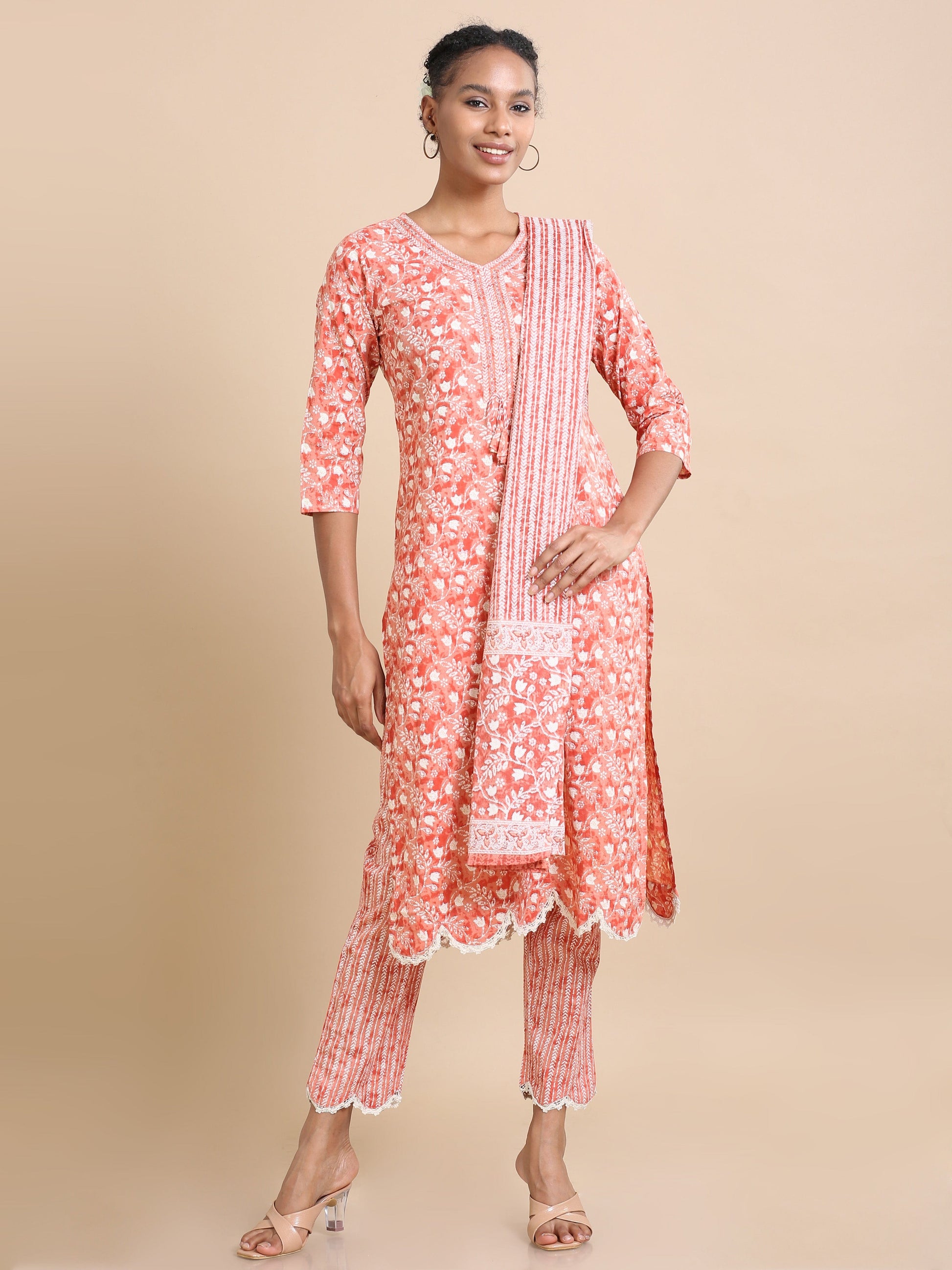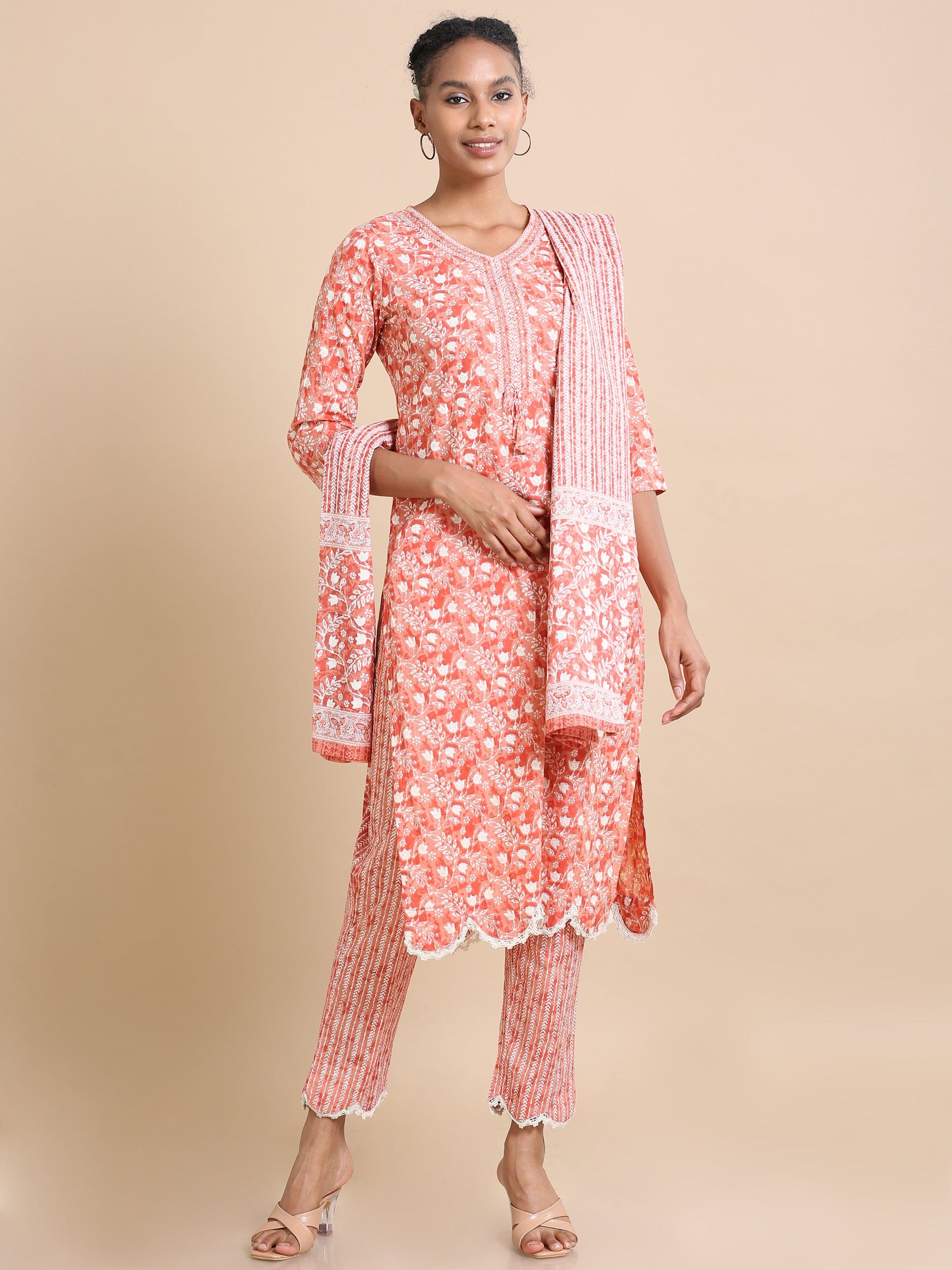 Brick 3/4th sleeves Cotton Floral print Regular fit Calf length Kurta Set - With Dupatta