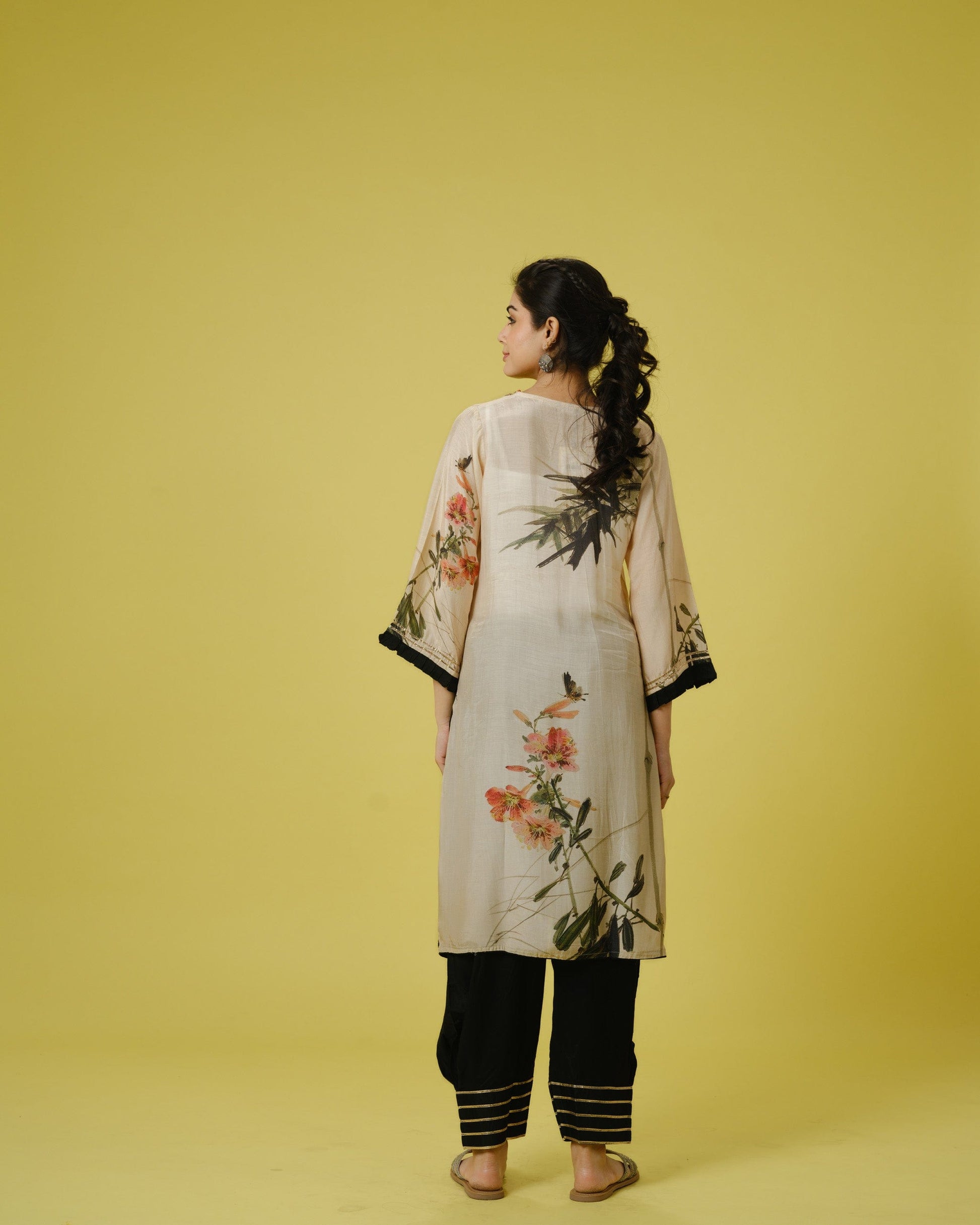 Exude timeless elegance in this cream cotton silk kurta set, perfect for festive occasions! The kurta boasts exquisite potli buttons at the neckline, adding a touch of traditional charm to its loose, straight silhouette. With a flattering calf length and square neck, it features a captivating digital floral print enhanced by delicate sequin work, exuding sophistication. The 3/4th sleeves with pleats at the hem add a stylish flair, while the side slit offers ease of movement. Paired with black trousers crafted from solid Santon fabric, featuring gold lace stripes at the hem, they offer a loose fit and ankle length with a pull-on style and mid-rise elastic waistband at the back for comfort. Complete your ensemble with a peach organza dupatta adorned with a matching digital floral print and gold lace, adding a touch of luxury to your look.