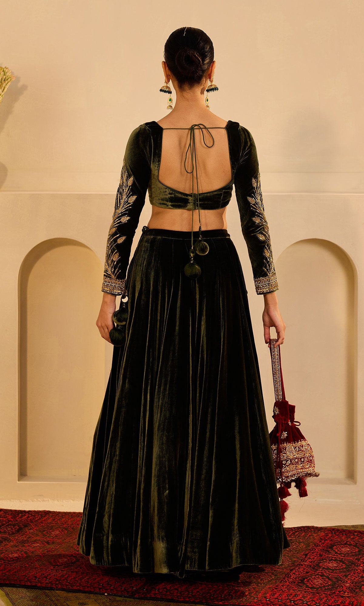 - FABRIC USED: Lehenga - Silk Velvet , Blouse -Silk Velvet , Shawl - Silk Velvet, Lehenga Lining - Shantoon, Cancan, Blouse and Shawl Lining - Shantoon