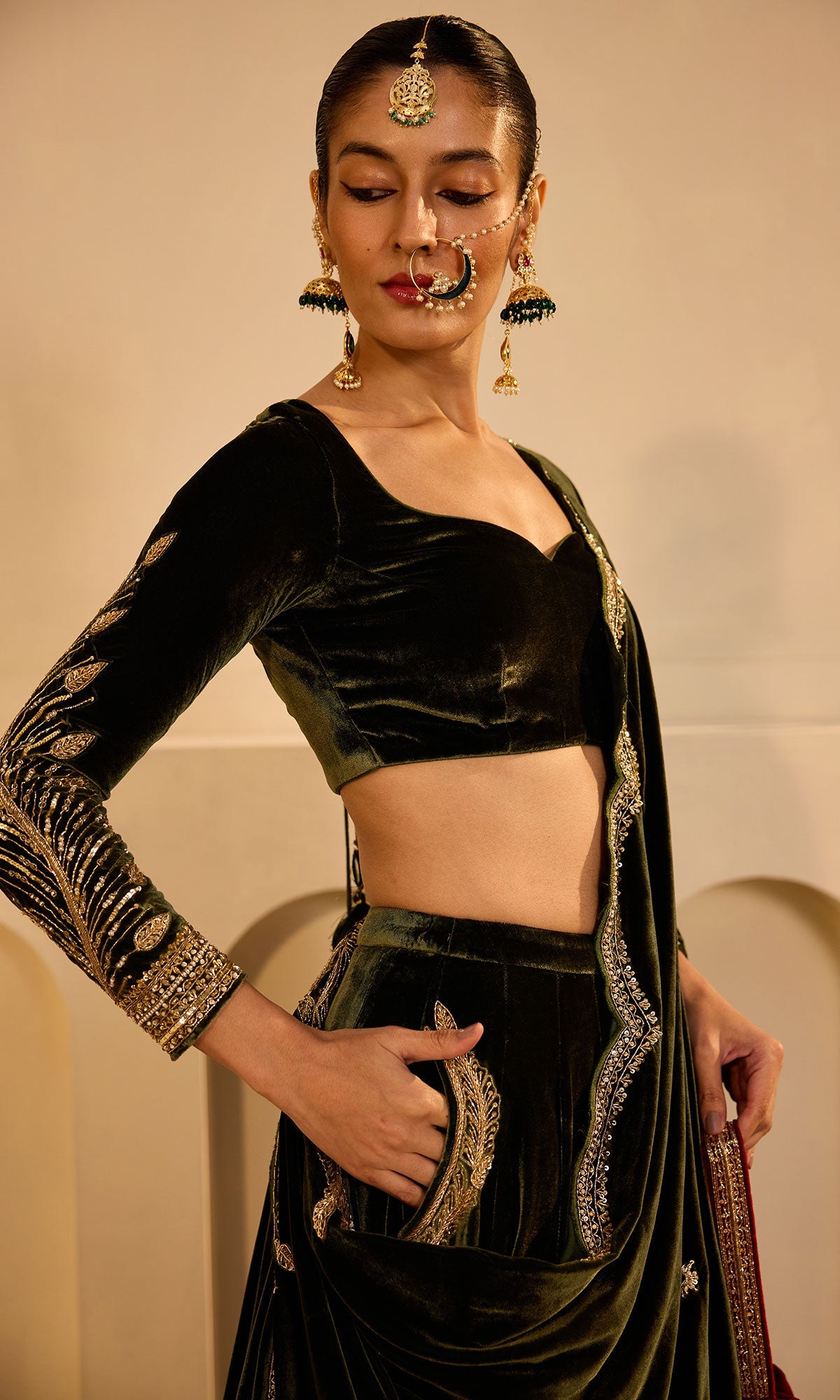 Dilbaro mughals olive green silk velvet embroidered lehenga with blouse and shawl (set of 3)