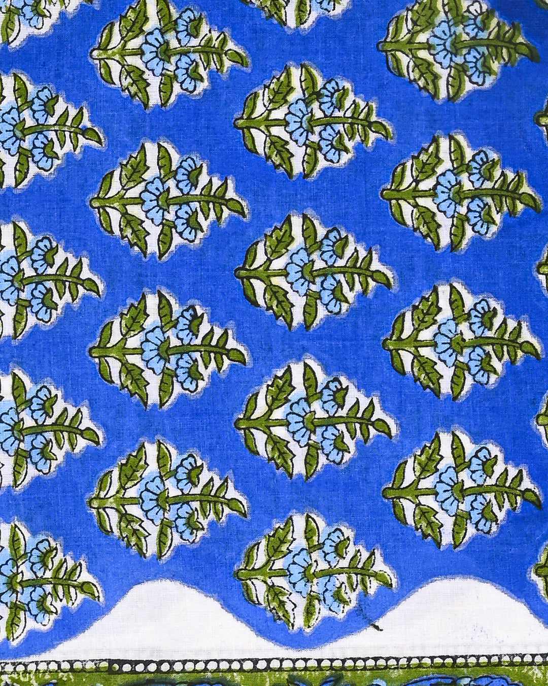 Hand block printing is a centuries old art form that utilizes a hand carved wood block , dipped in dye and stamped by hand onto fabric.