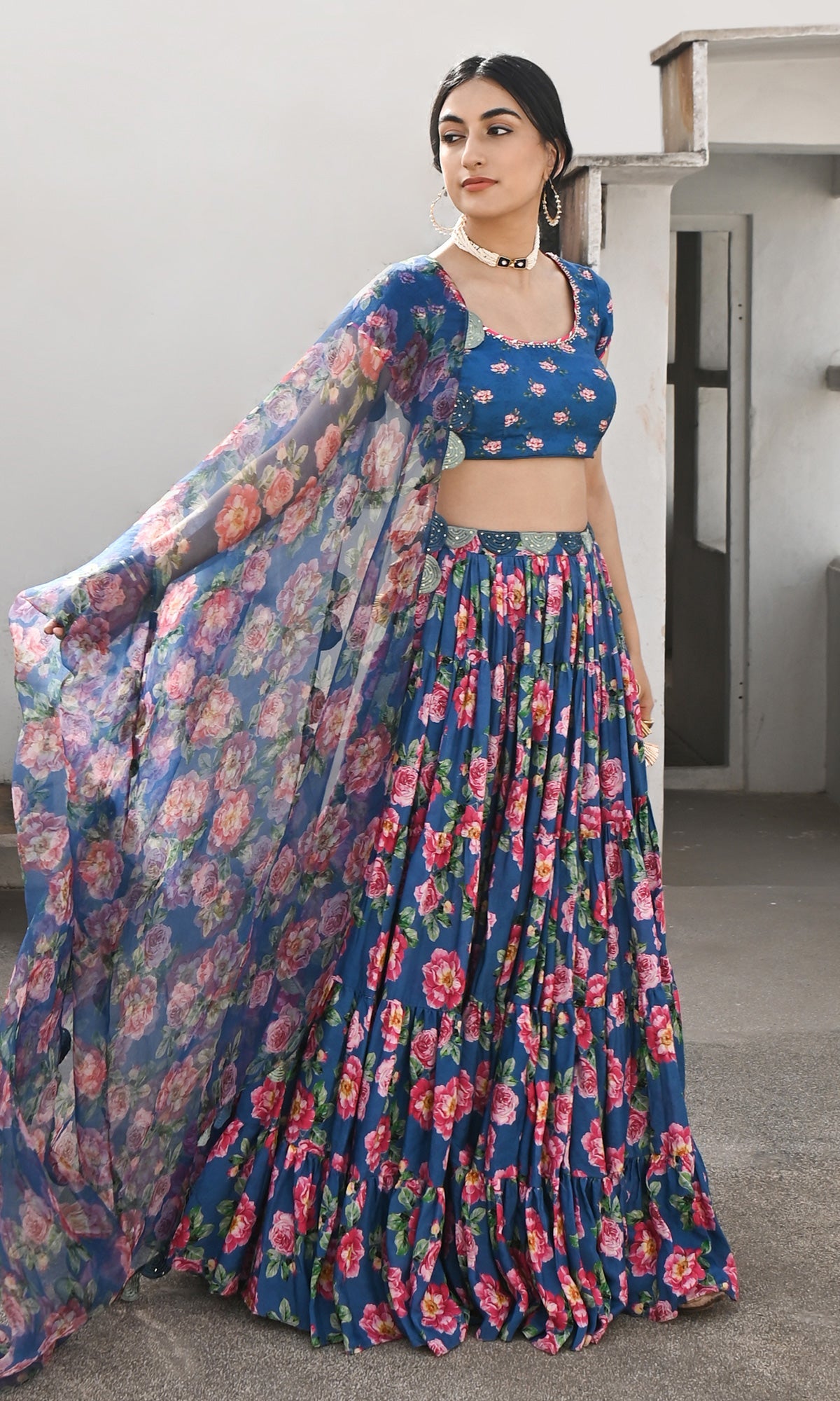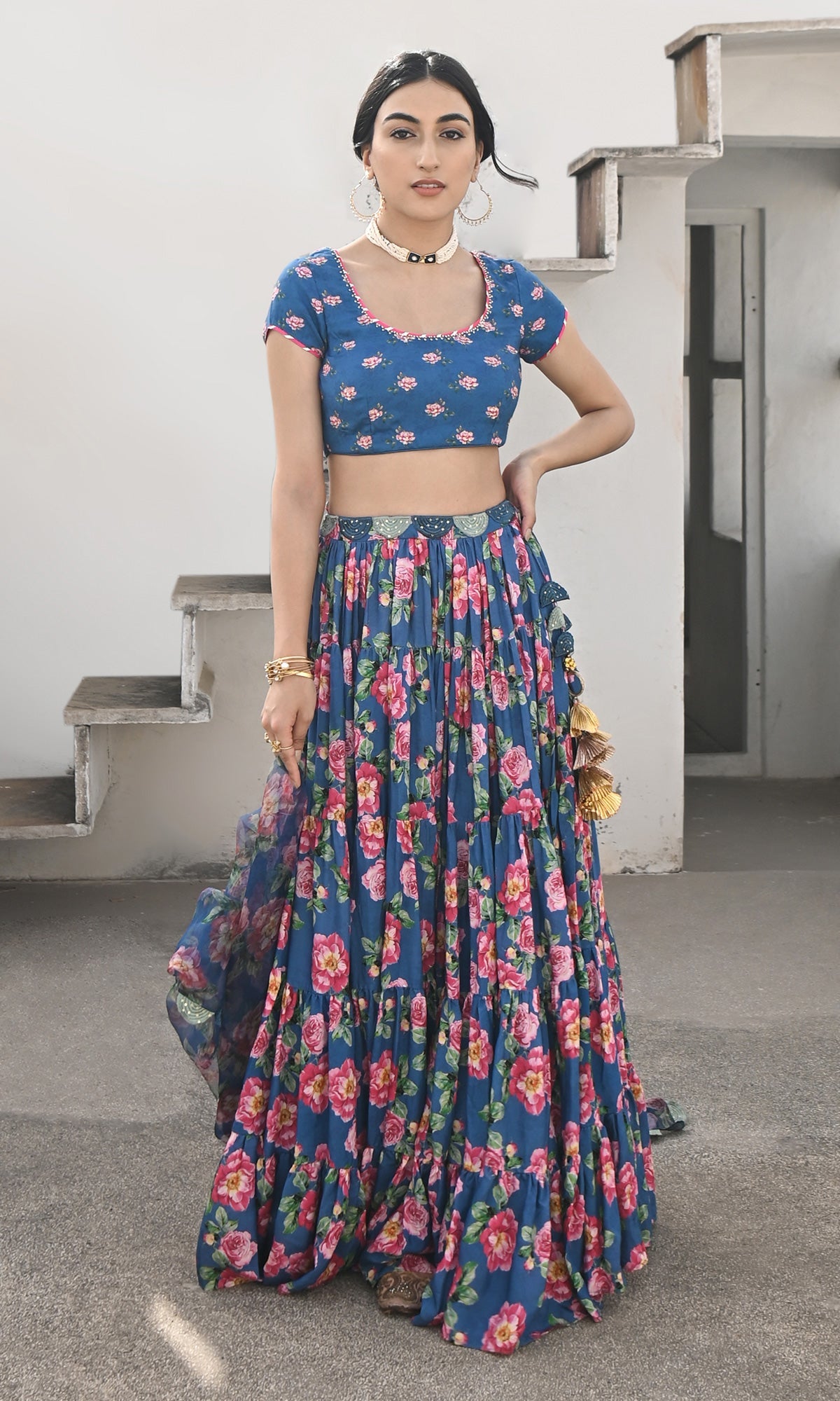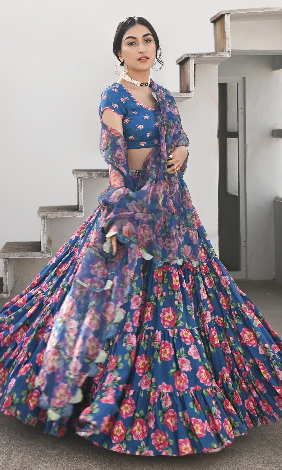This set includes Printed Blouse, Lehenga and Dupatta. Blouse has sequin work. Lehenga is in tiers. It comes with sequins embroidered dupatta with leaves detailing.