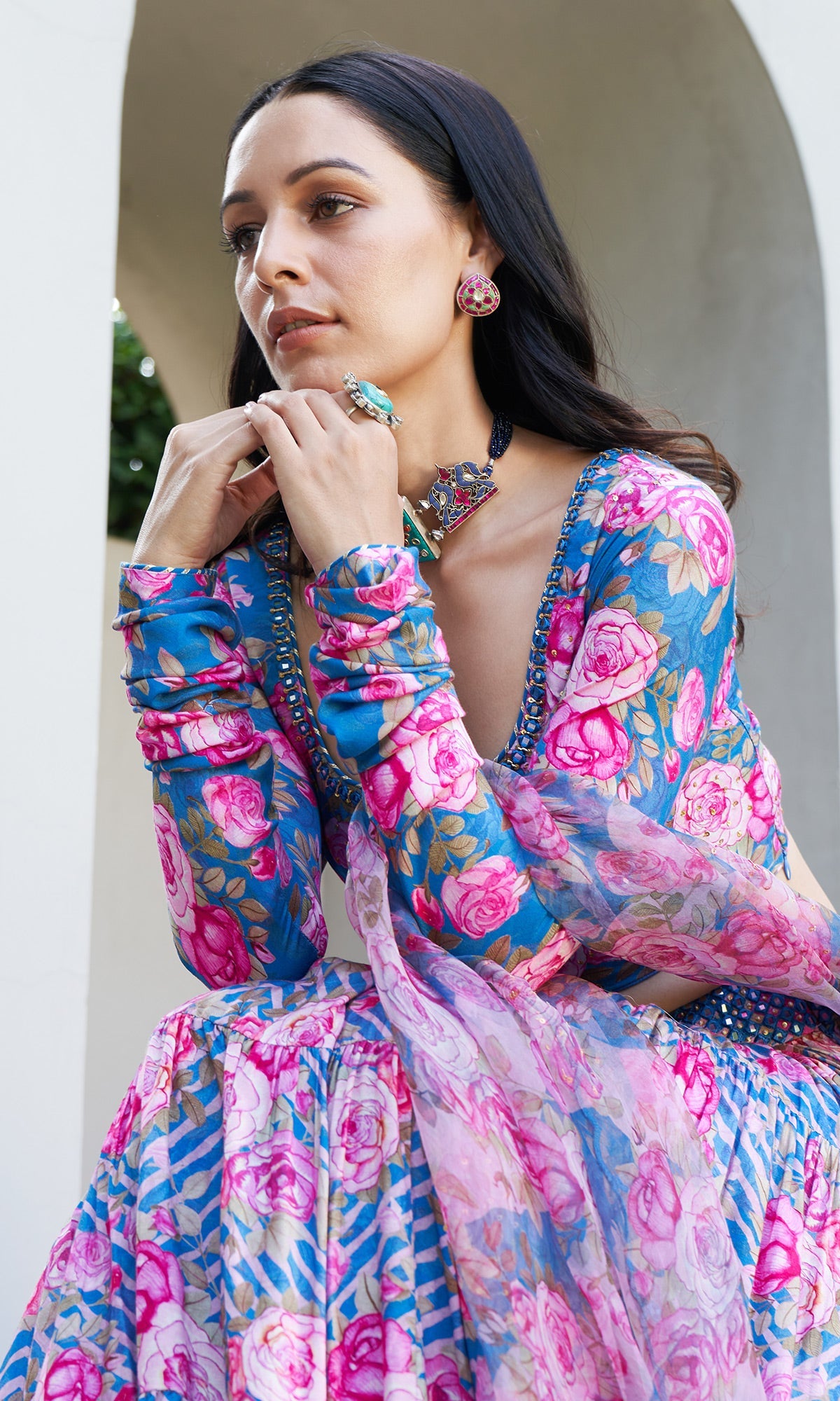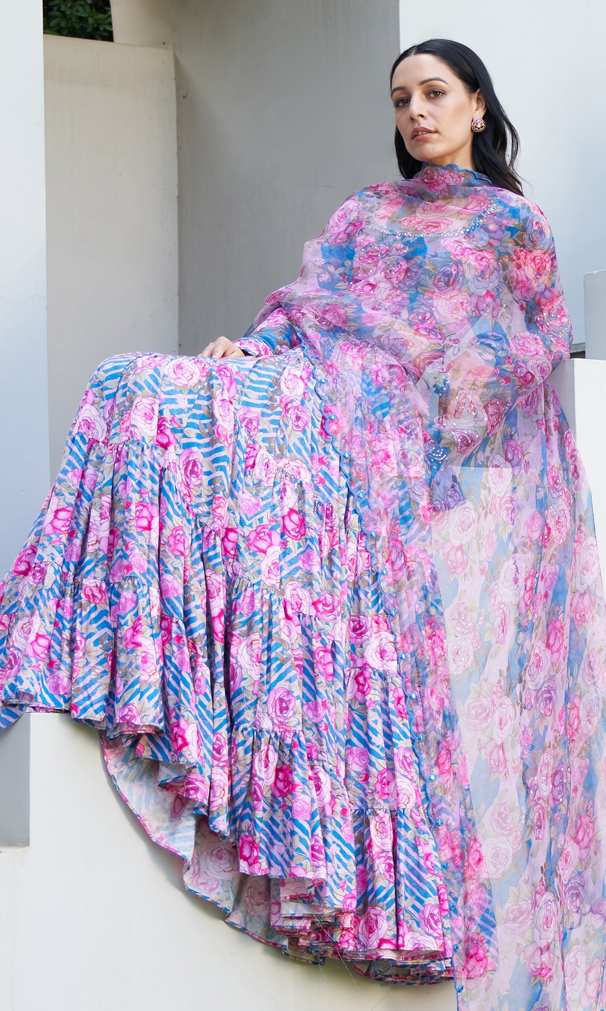 This Set Includes Floral printed Blouse , tiered lehenga and dupatta . Blouse has embroidery at the front and back. Tie-up with tassel detailing at the back. Mirror work on belt of lehenga. It comes with scallop embroidered dupatta.