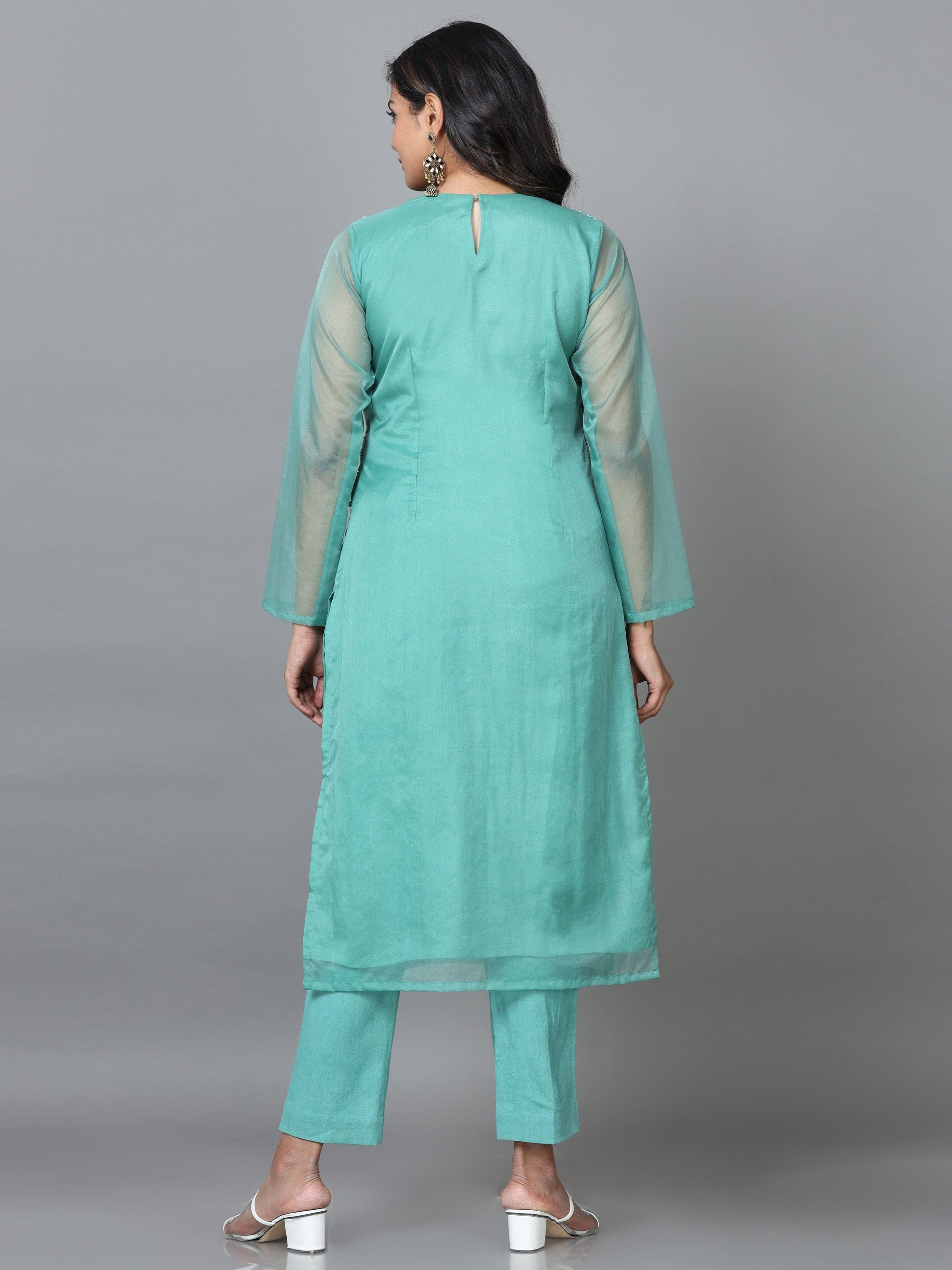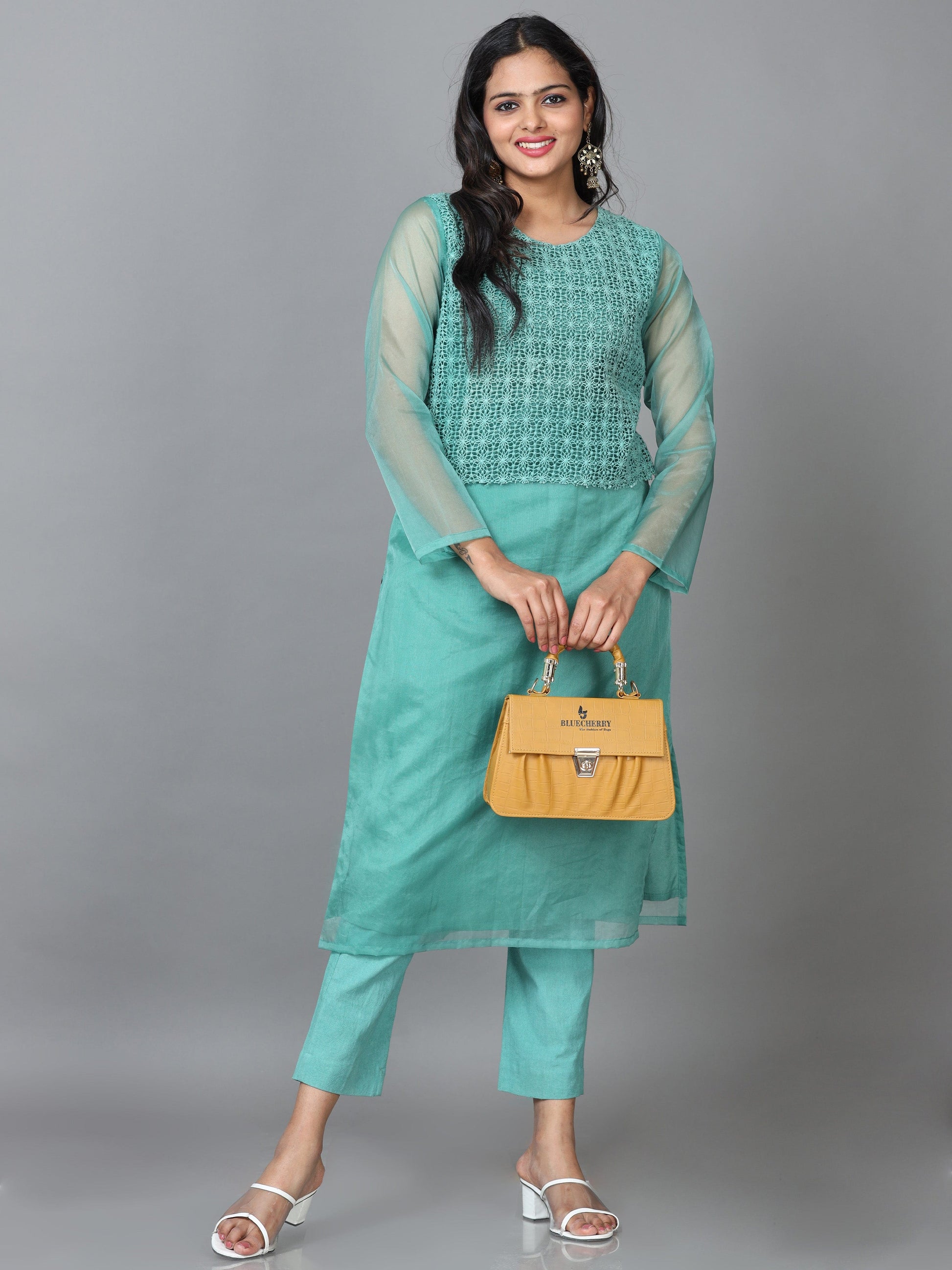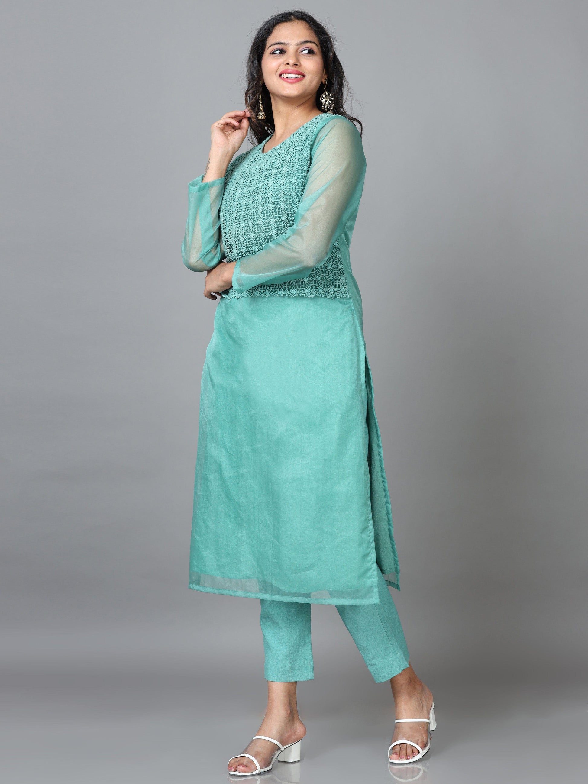 Green 3/4 Sleeve Organza Solid Straight calf-long Kurta Set