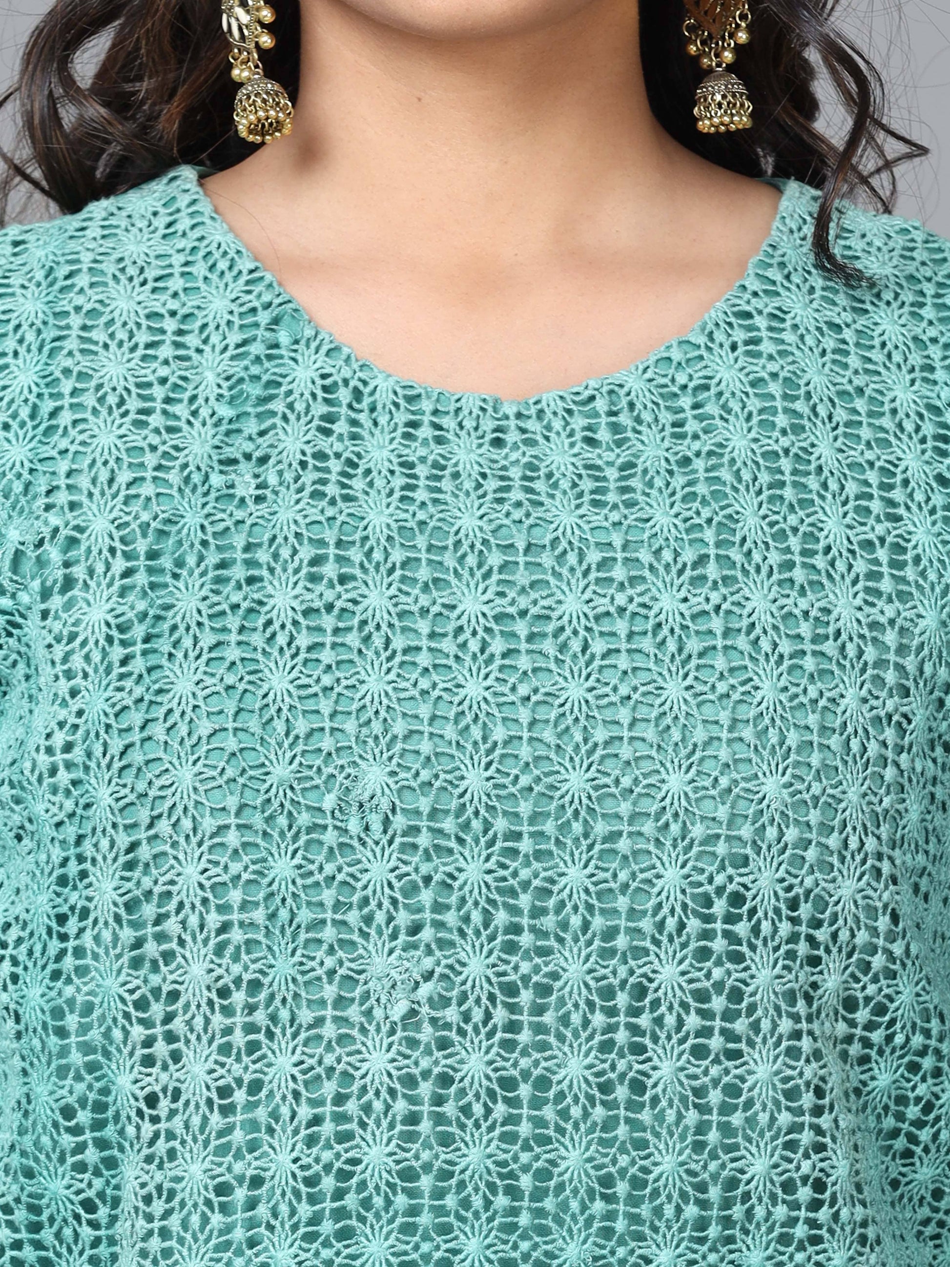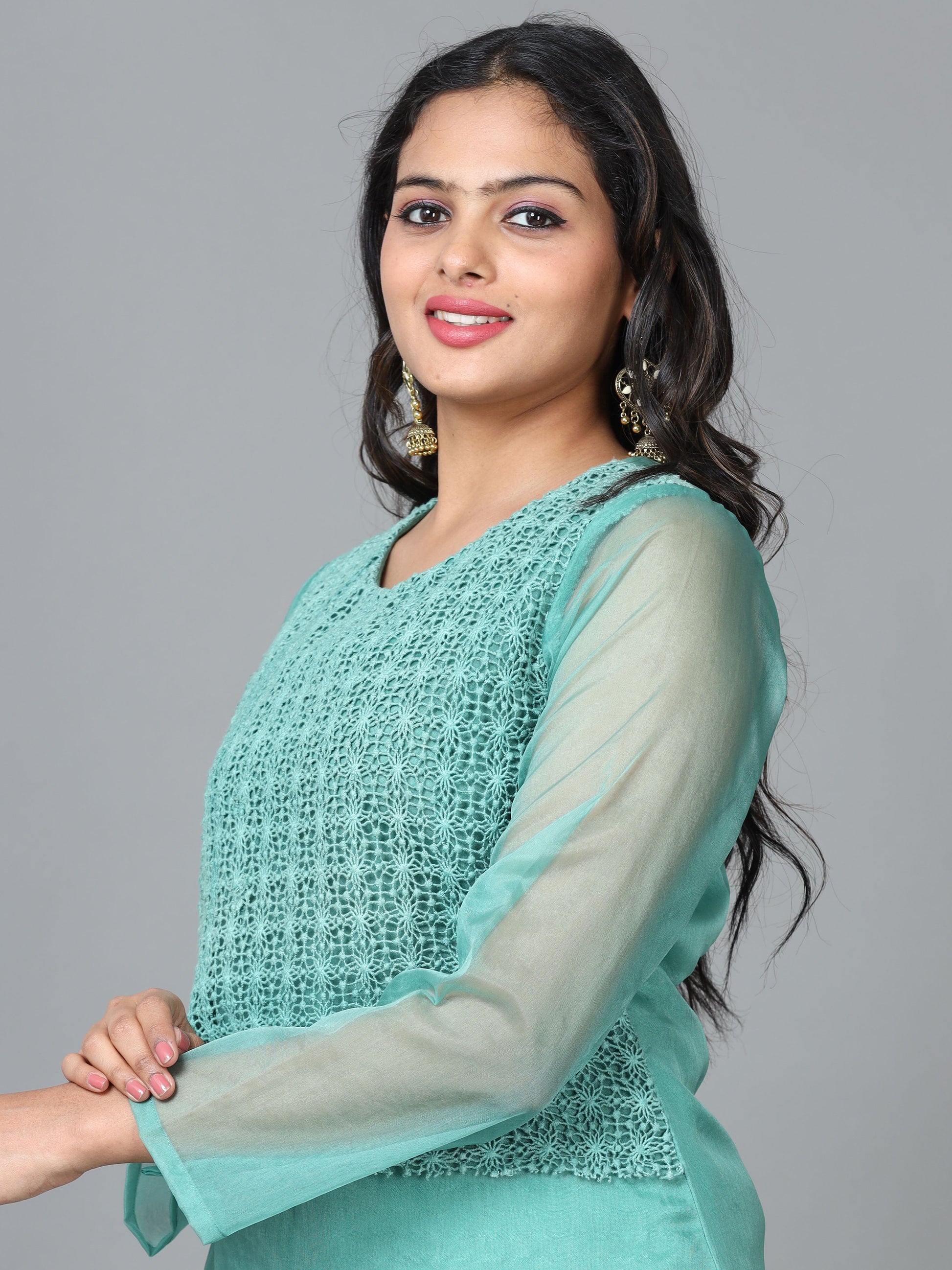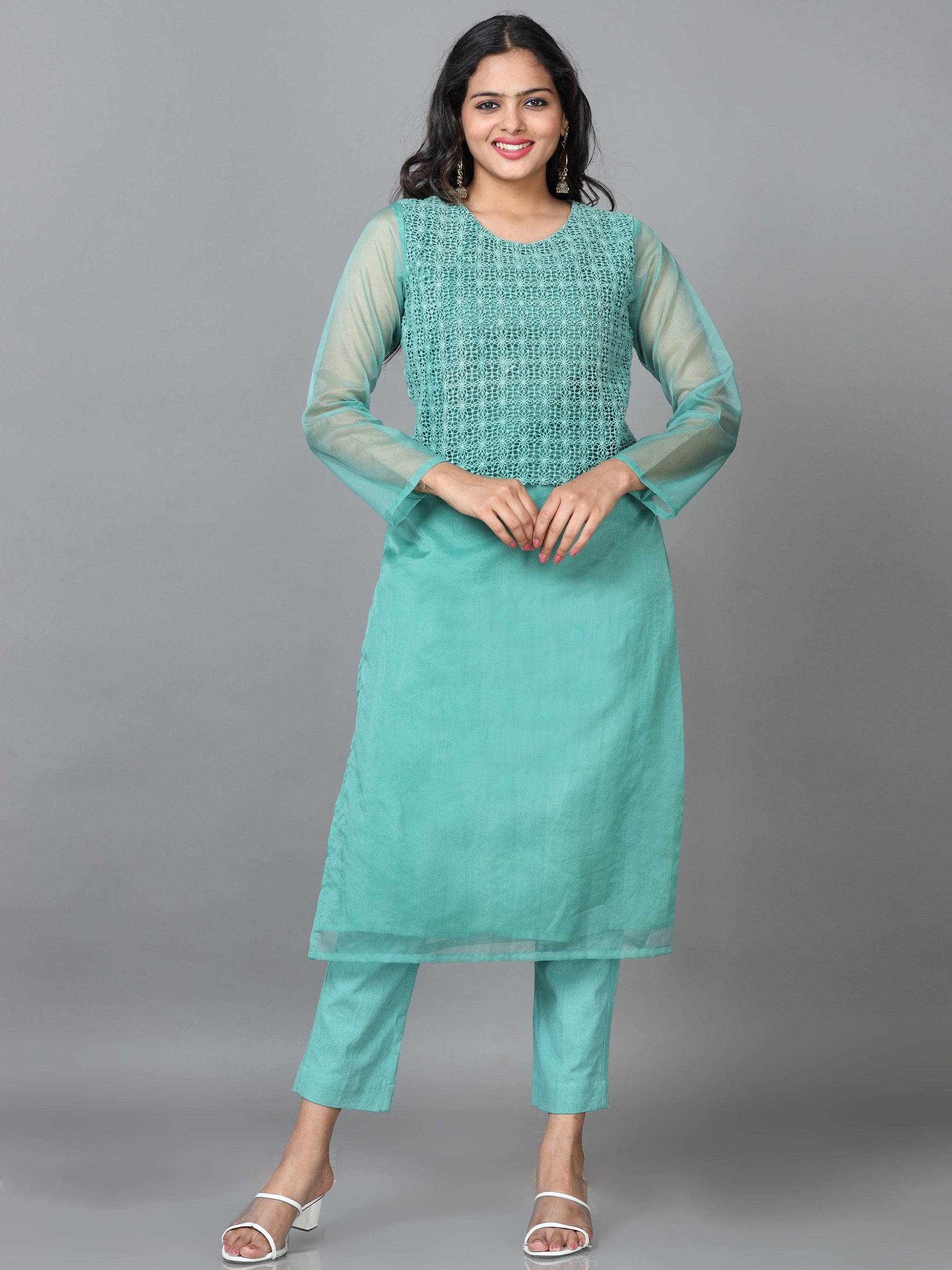 Green 3/4 Sleeve Organza Solid Straight calf-long Kurta Set