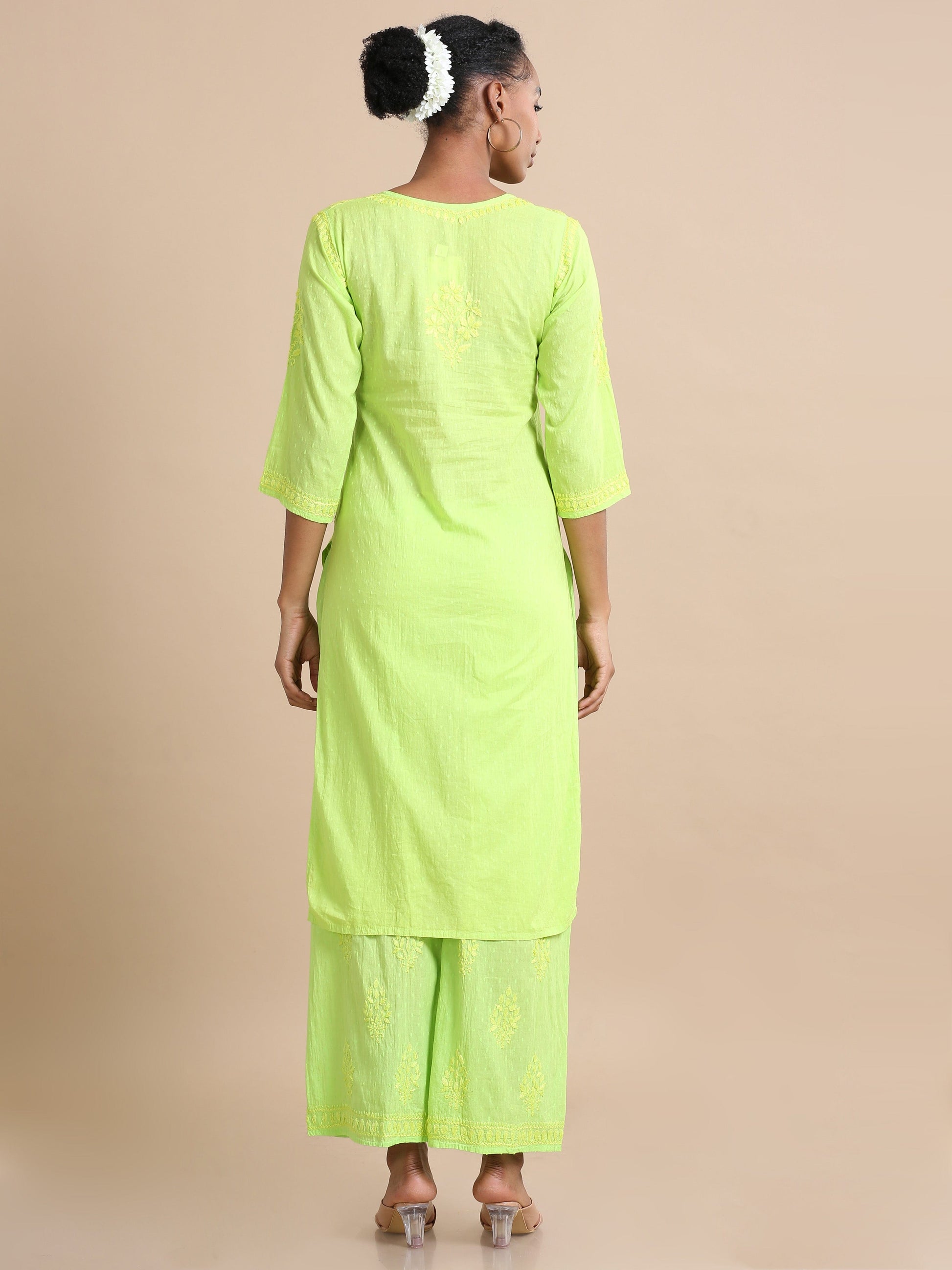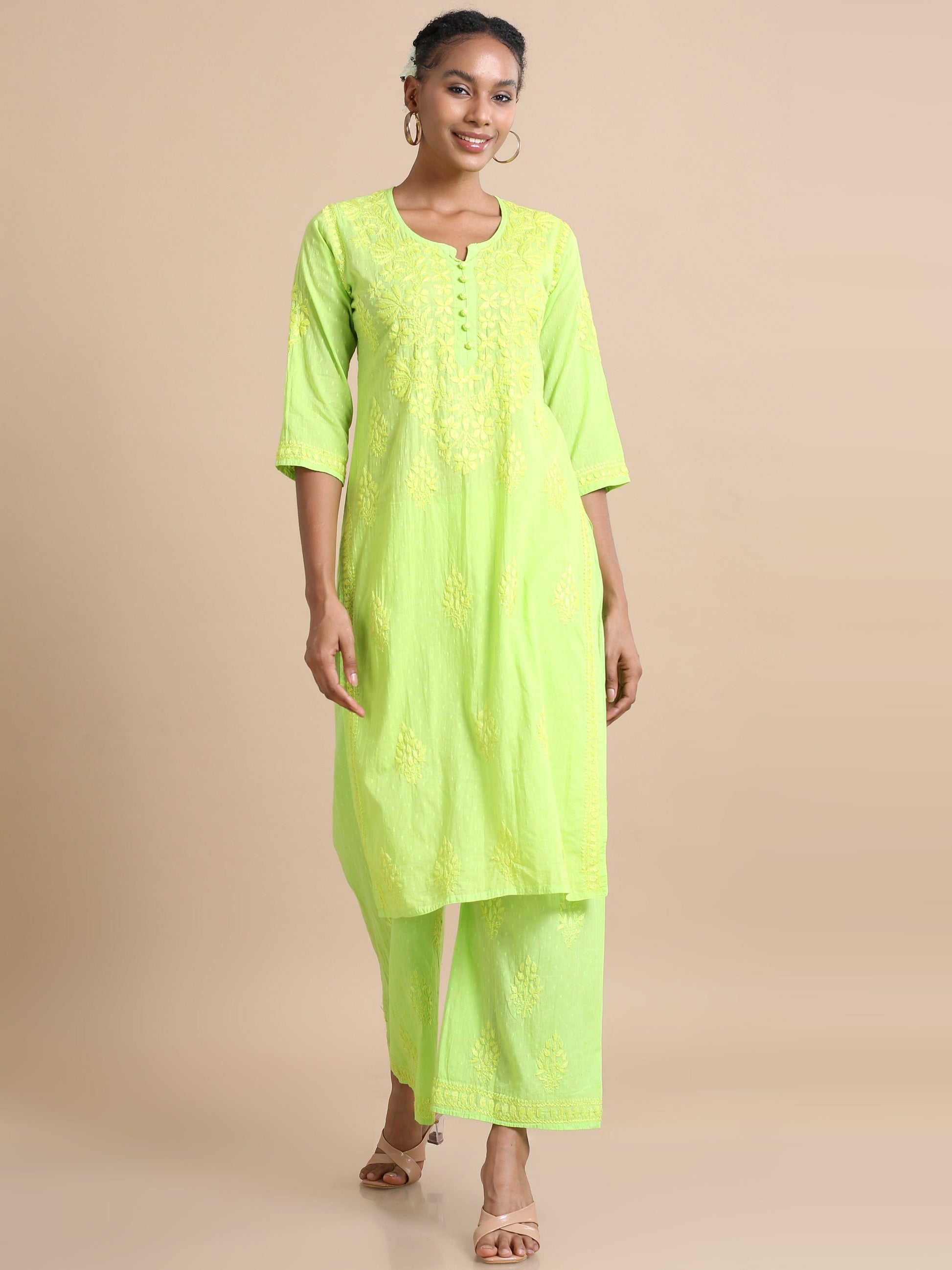 Green Kurta Set from the Festive Collection, an exquisite ensemble designed for special occasions. The kurta, a pull-on style crafted from Cotton Dobby, is adorned with delicate thread work, adding a touch of sophistication to its design. With a regular fit and calf length, the midi kurta features a round neck, making it a perfect choice for festive wear. The straight silhouette, 3/4th sleeves, and side slit contribute to its graceful appearance.Complementing the kurta is our matching Green Palazzo, also detailed with intricate thread work on Cotton Dobby fabric. The palazzo offers a regular fit, ankle length, pull-on style, mid-rise, and an elastic back for a comfortable and convenient fit. Together, the kurta and palazzo create a harmonious set that seamlessly blends elegance with comfort.For care, we recommend hand washing with a gentle touch to preserve the fine details. Additionally, washing light colors separately is advisable to maintain the garment's vibrancy.