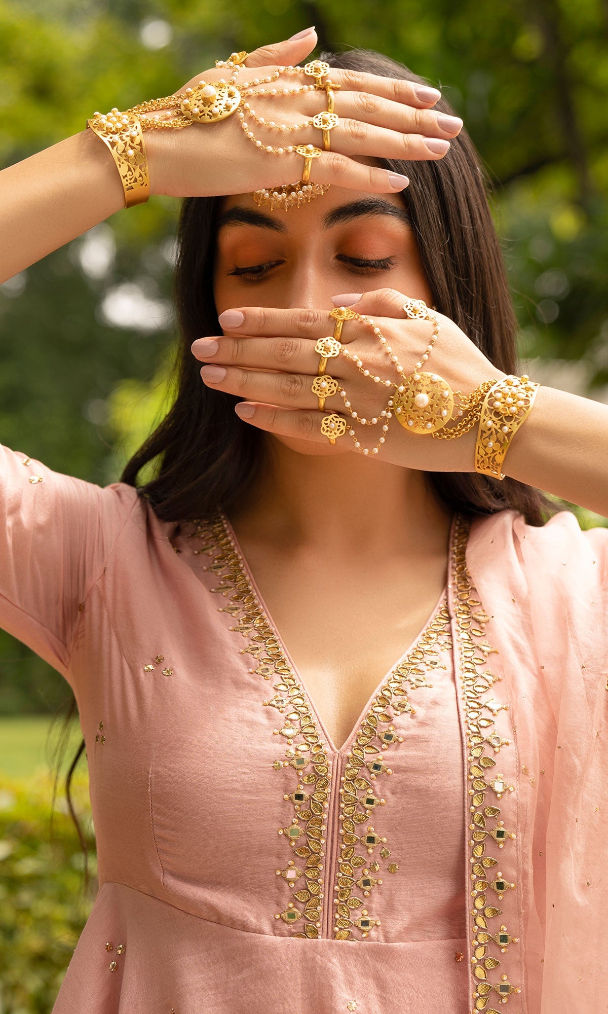 Soft Pink Mukaish Chanderi Kurta with gota- patti hand embroidery. Mukaish Chanderi Lehenga with Gota lace finishing. Soft Pink Mukaish Organza Dupatta with intricate Gota and Mirror hand embroidery finishing.