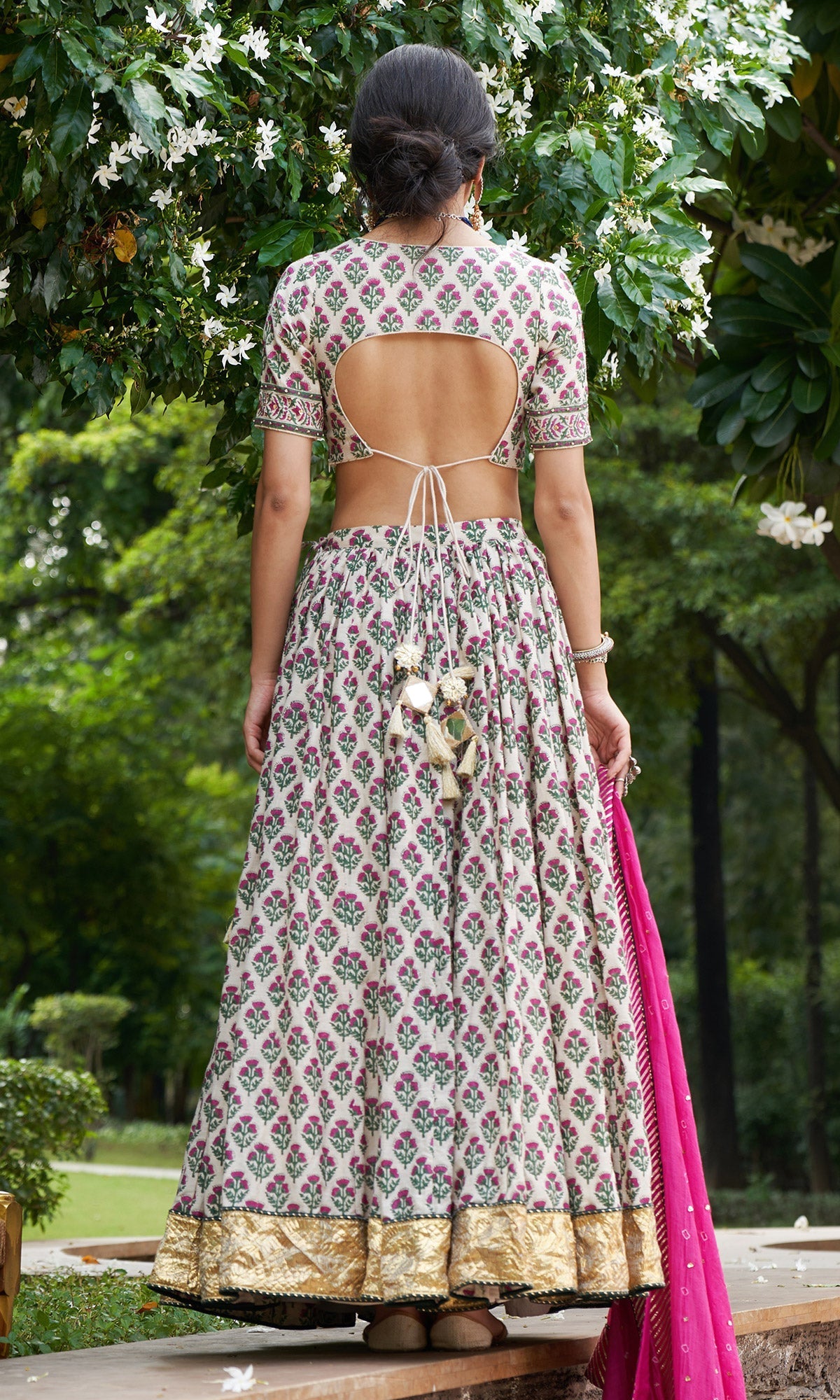 This set includes Block printed blouse , lehenga and badhani dupatta. Blouse has V- neck . It is embellished with sequins embroidery. It is with block printed lehenga , finished with gota and magzi and bandhani embroidered dupatta.