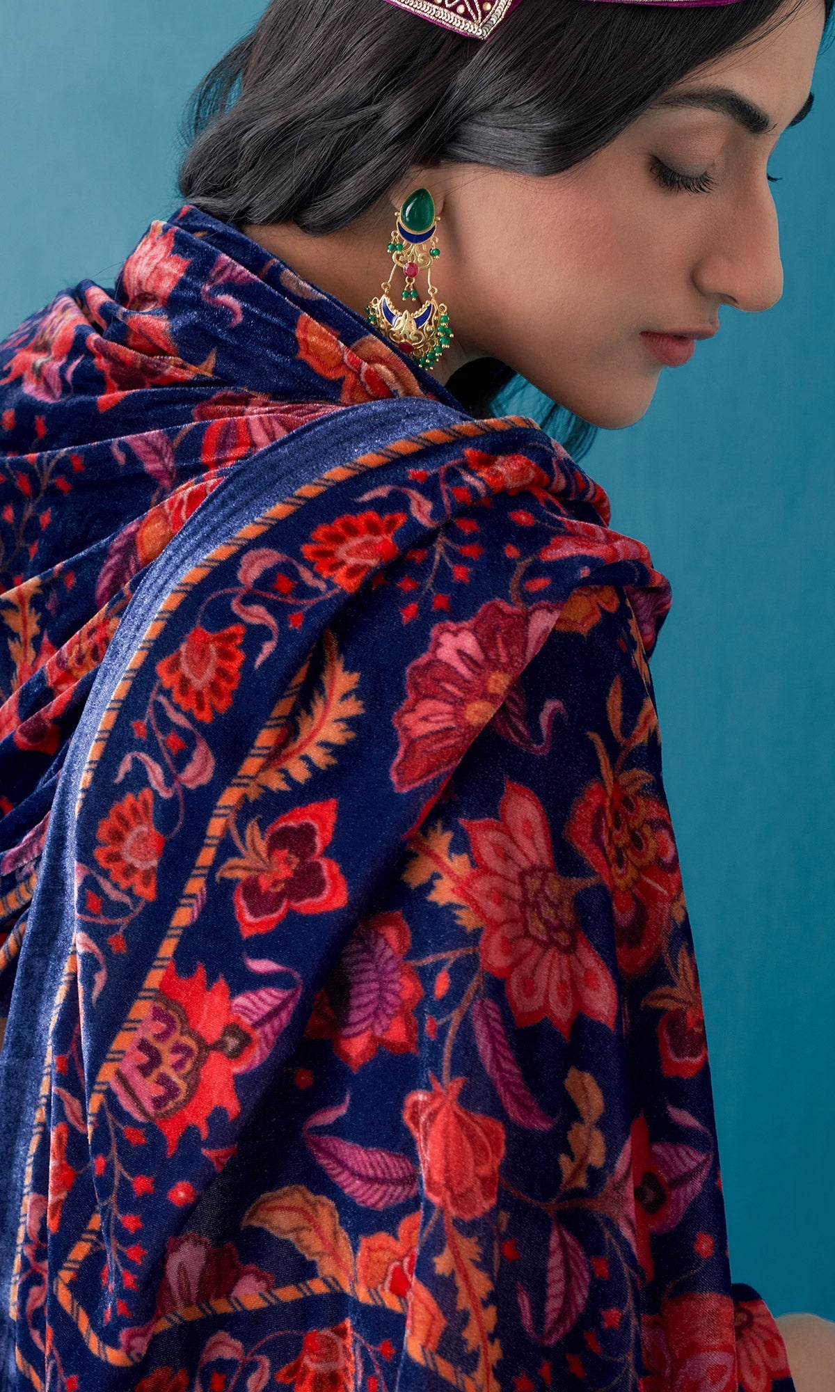 Khizaan Chintz Midnight Blue Velvet Lehenga Set With Shawl Set Of 3