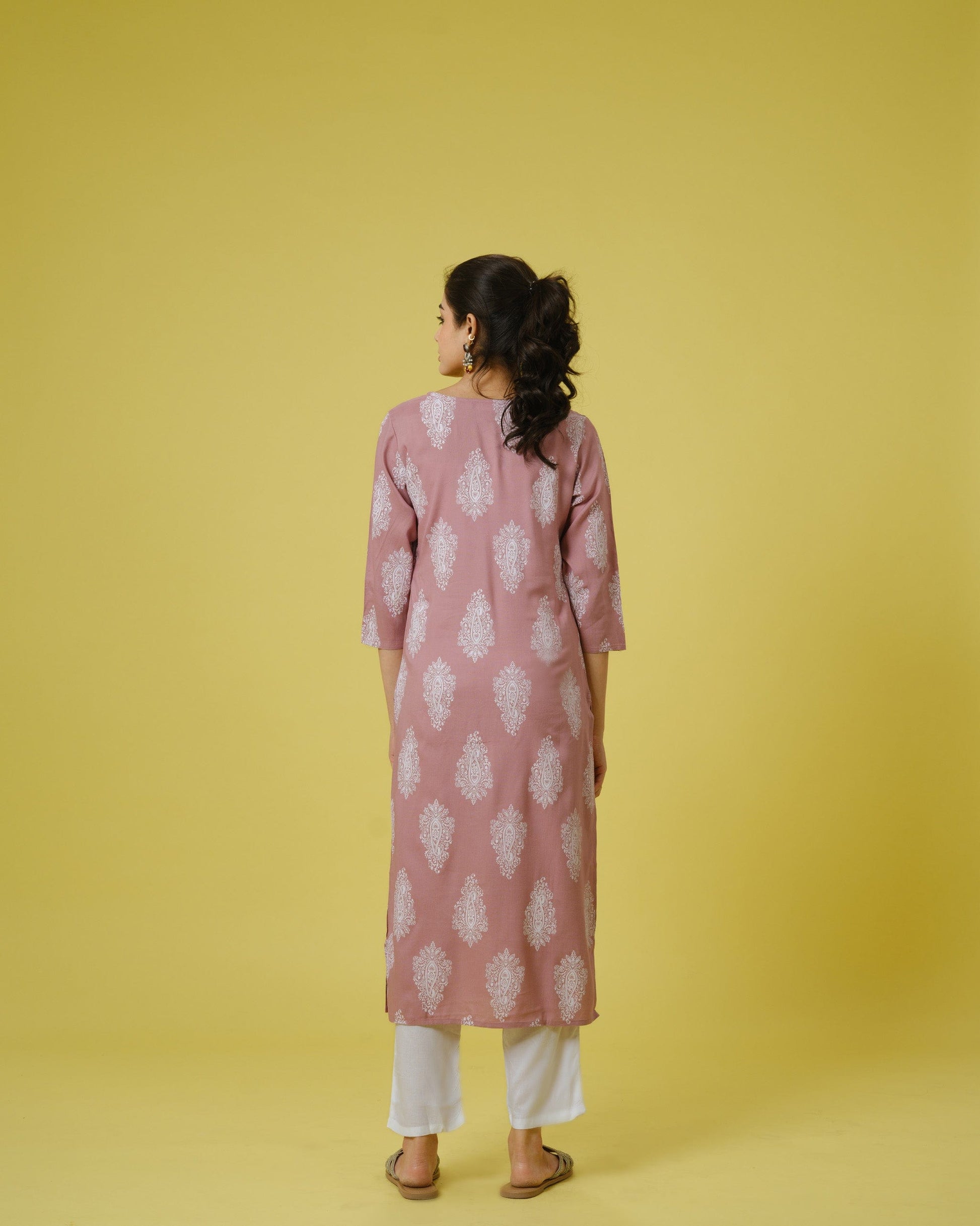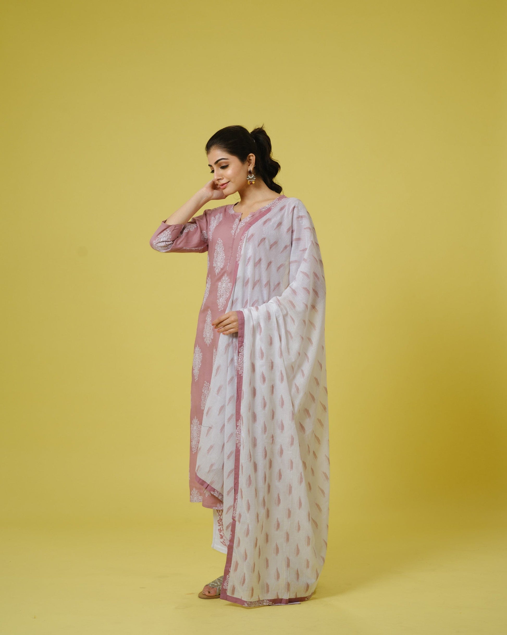 Embrace classic elegance with this charming cotton cambric kurta set. The kurta, adorned with traditional motifs, features a timeless round neck and graceful 3/4th sleeves, capturing the essence of tradition. Paired with comfortable white trousers boasting matching traditional motifs, the ensemble exudes sophistication. Complete your look with a cotton dupatta featuring an eye-catching Ikat print, accentuated by printed fabric lace, adding a touch of flair to your ensemble. Perfect for any occasion, this kurta set is a delightful fusion of style and tradition.