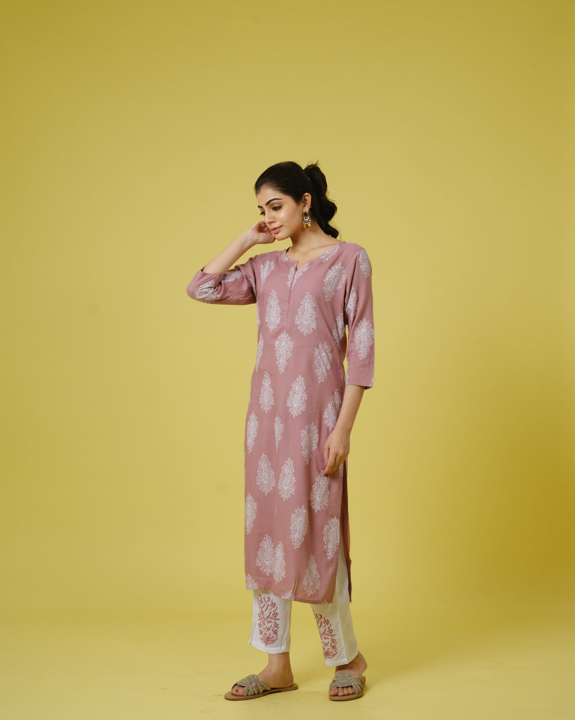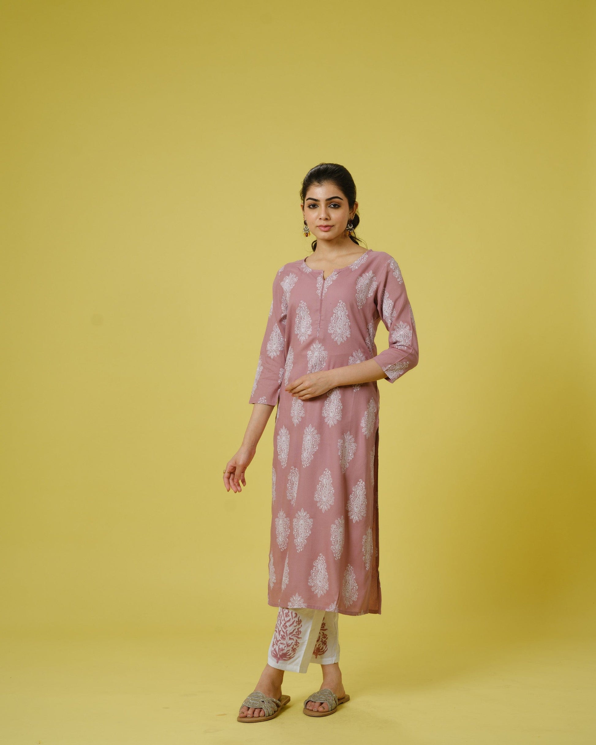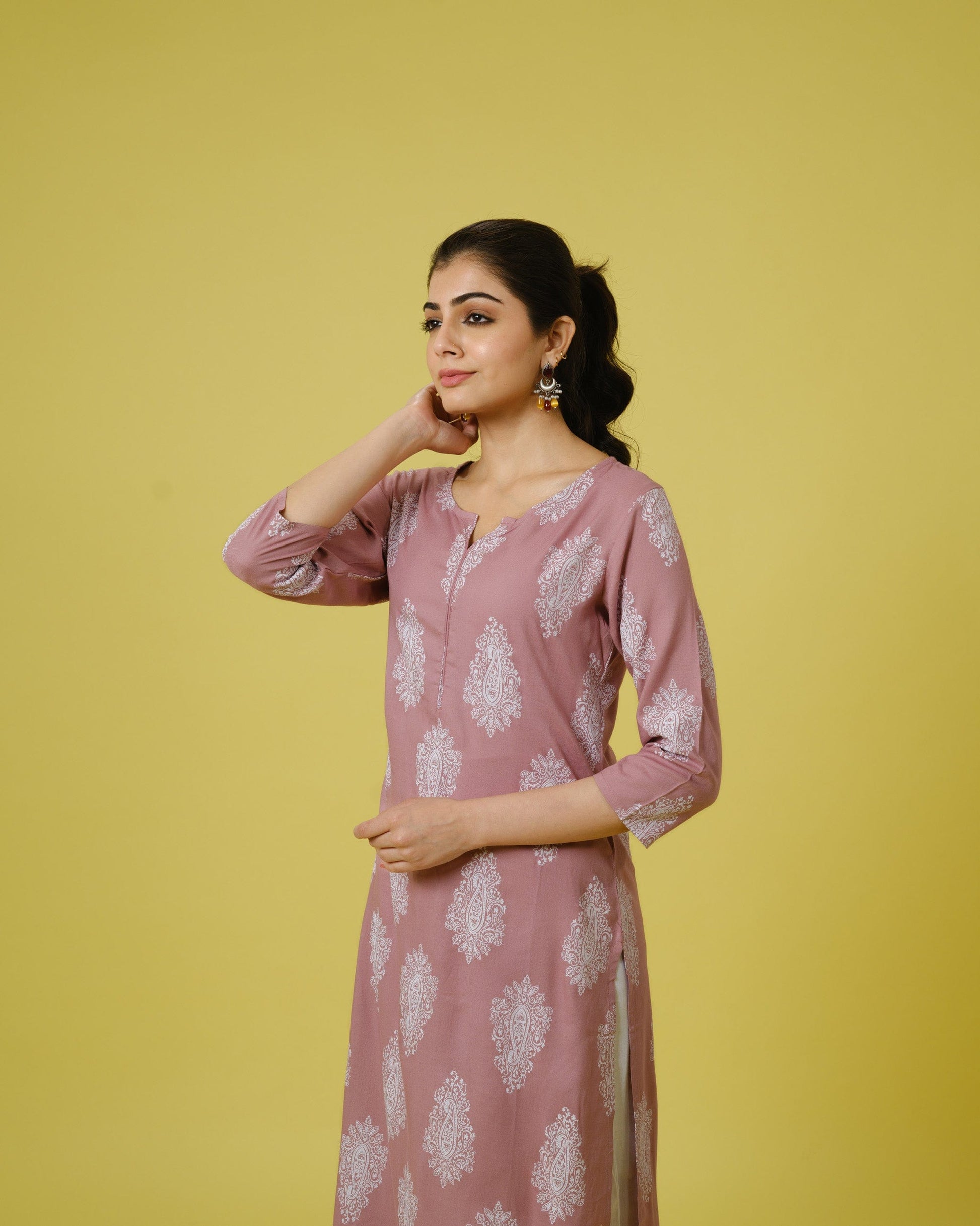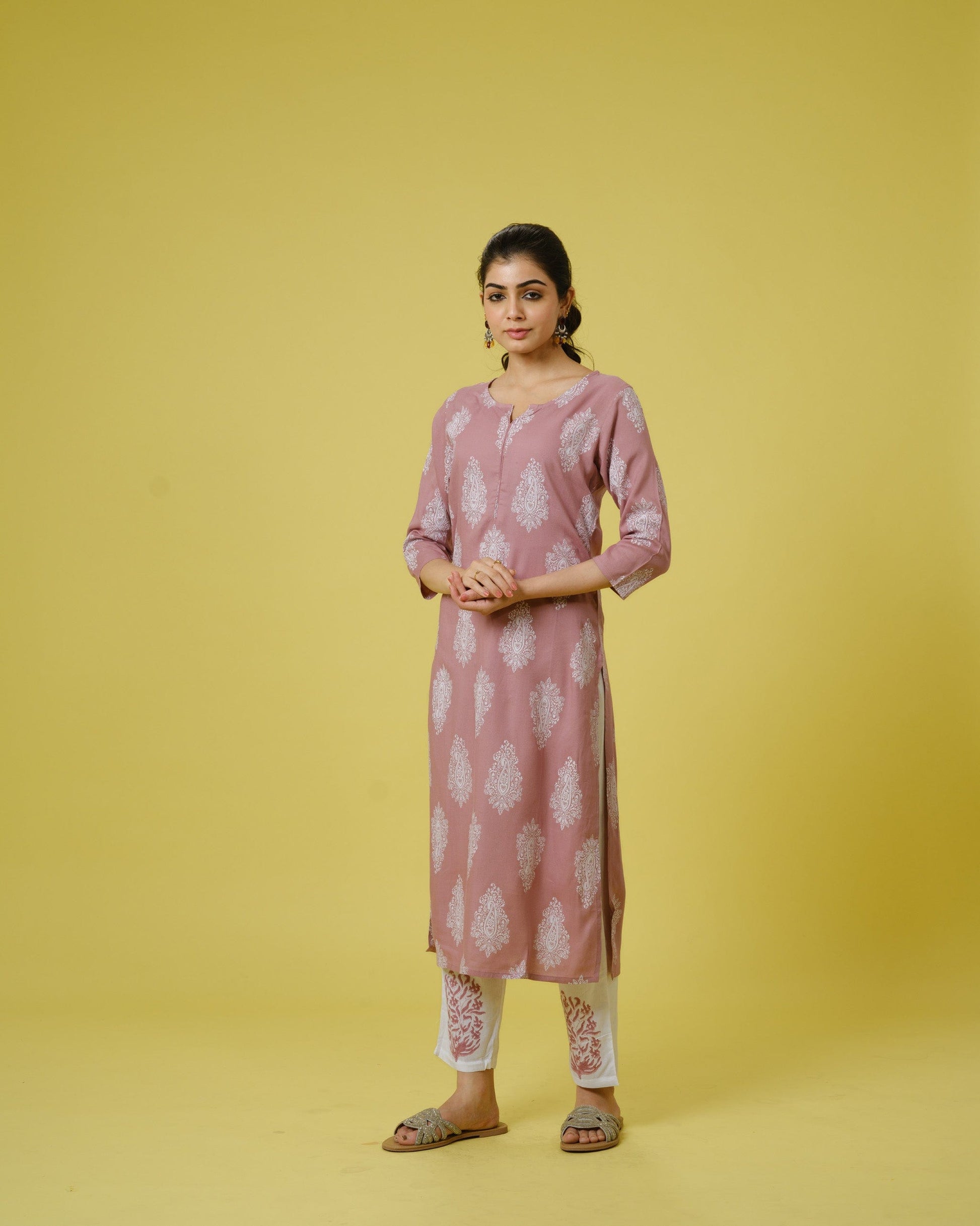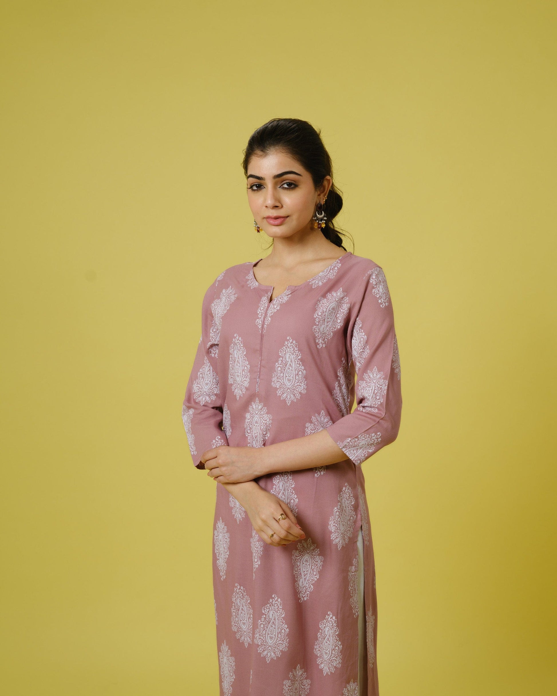 Lavender 3/4th Sleeves Cotton Cambric Traditional Motifs Calf Length Kurta Set - With Dupatta