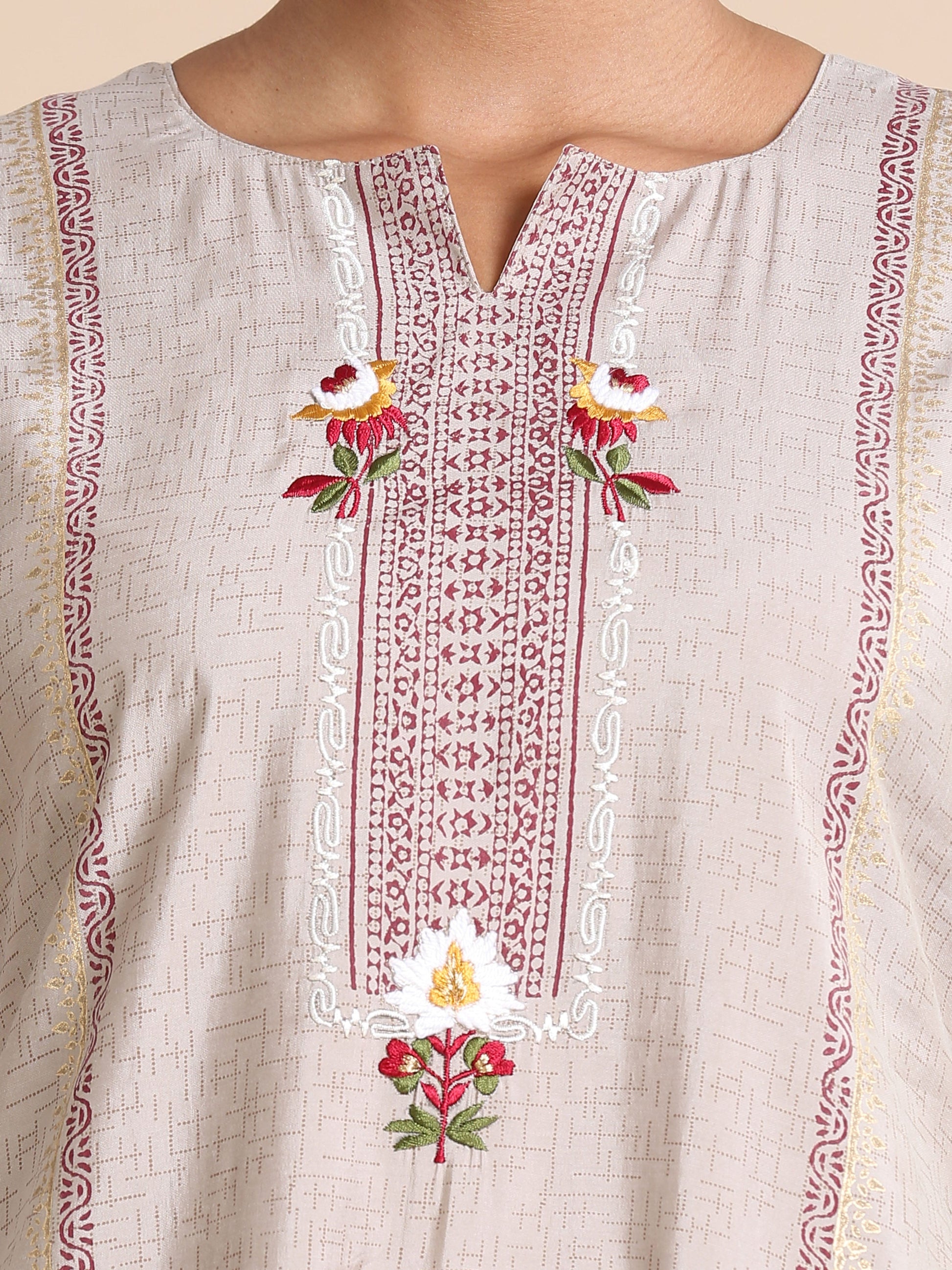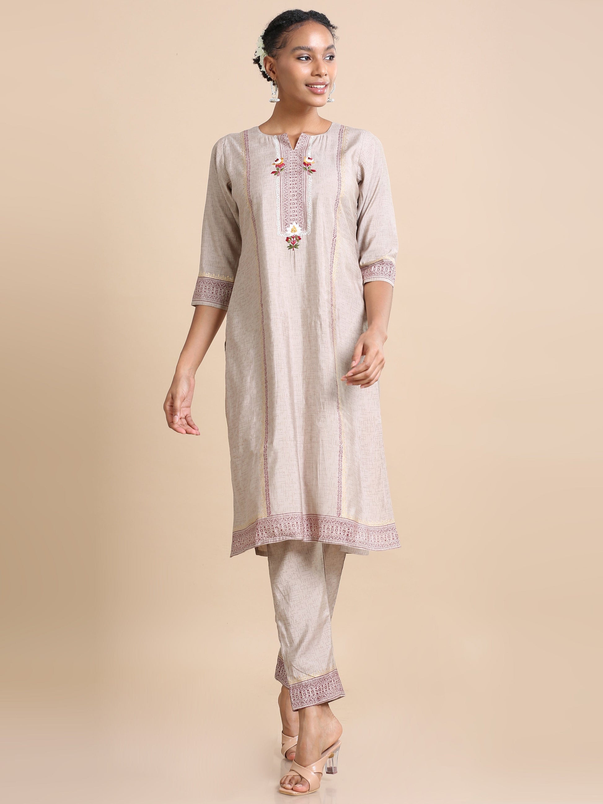 Elevate your festive attire with this Lt Brown Kurta Set,made from luxurious Chanderi silk, is a pull-on style adorned with intricate thread work. Featuring a regular fit and calf length, the midi kurta boasts a round neck, 3/4th sleeves, and a side slit, offering a perfect blend of grace and style. The straight silhouette is enhanced with a combination of block print and thread work, creating a unique and festive look.Accompanying the kurta is our Lt Brown Pants, also crafted from Chanderi silk with matching block print. These pants provide a regular fit, ankle length, pull-on style, mid-rise, and an elastic waist for comfort. The Chanderi silk material of the pants complements the kurta, resulting in a coordinated and elegant outfit.For a finishing touch, a Lt Brown Block Print Dupatta in Chanderi silk completes the ensemble, adding sophistication to the overall look.To maintain the delicate details, we recommend hand washing this set with care. Additionally, washing light colors separately is advisable to preserve the vibrancy of the garments.