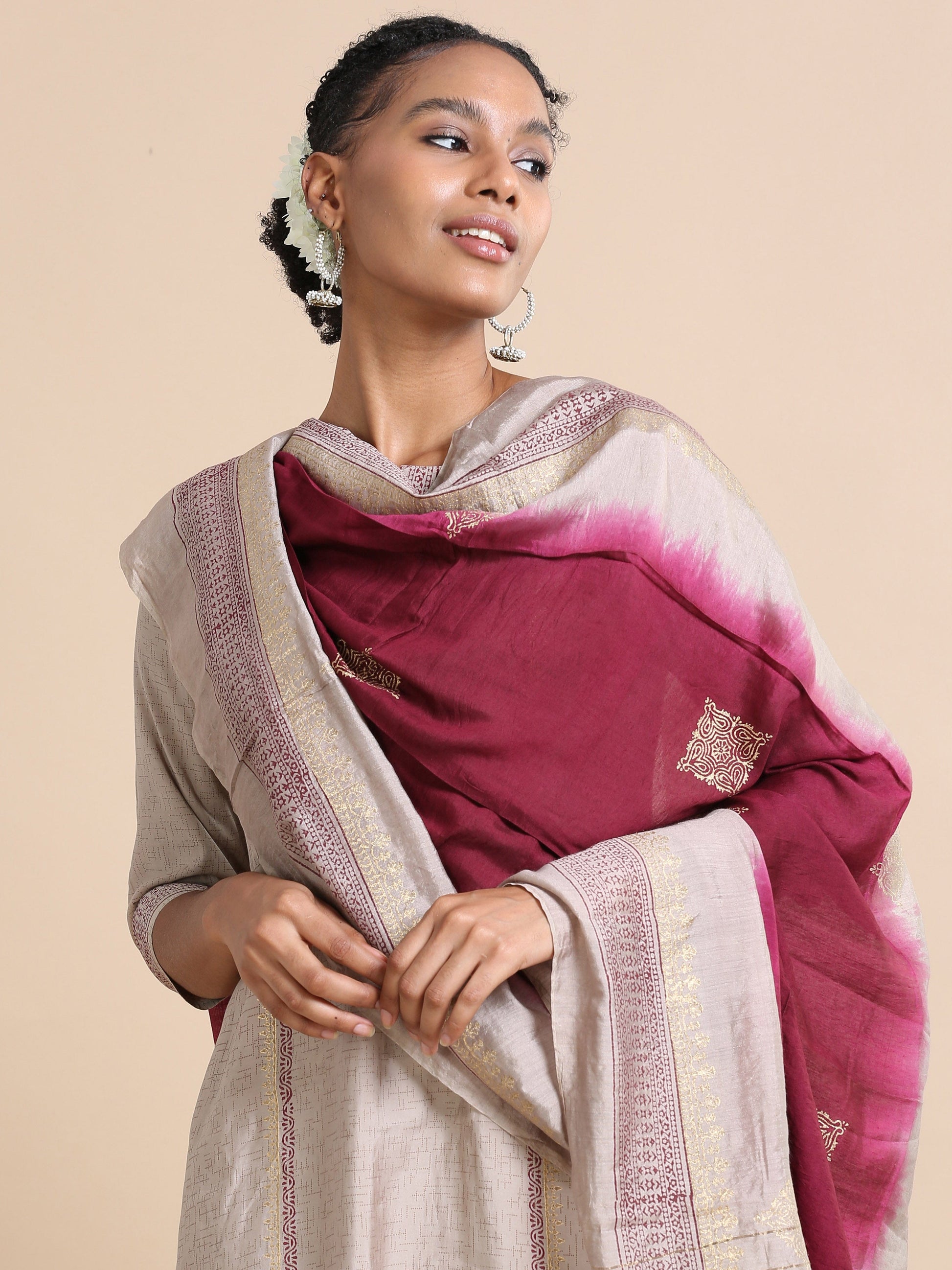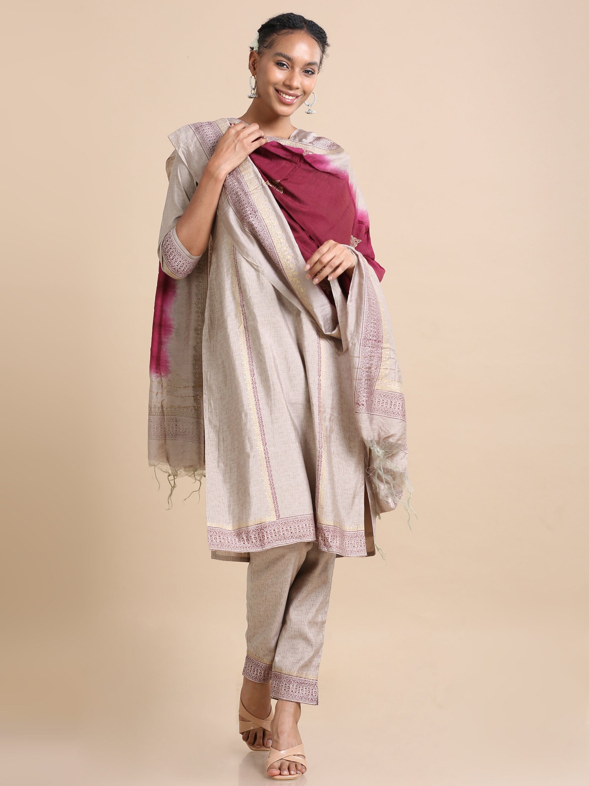Light Brown 3/4th sleeves Chanderi silk Block print and thread work Regular fit Calf length Kurta Set - With Dupatta