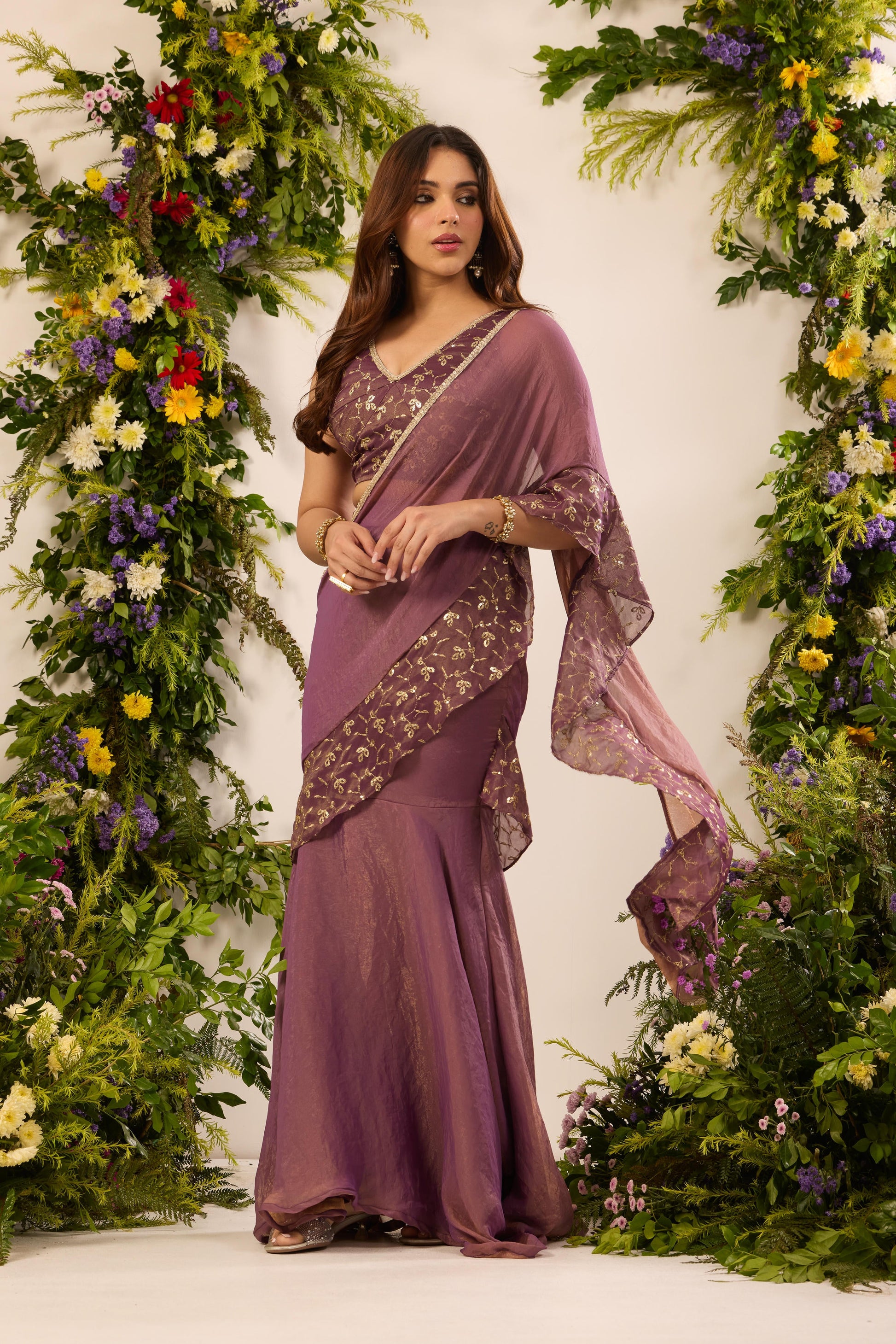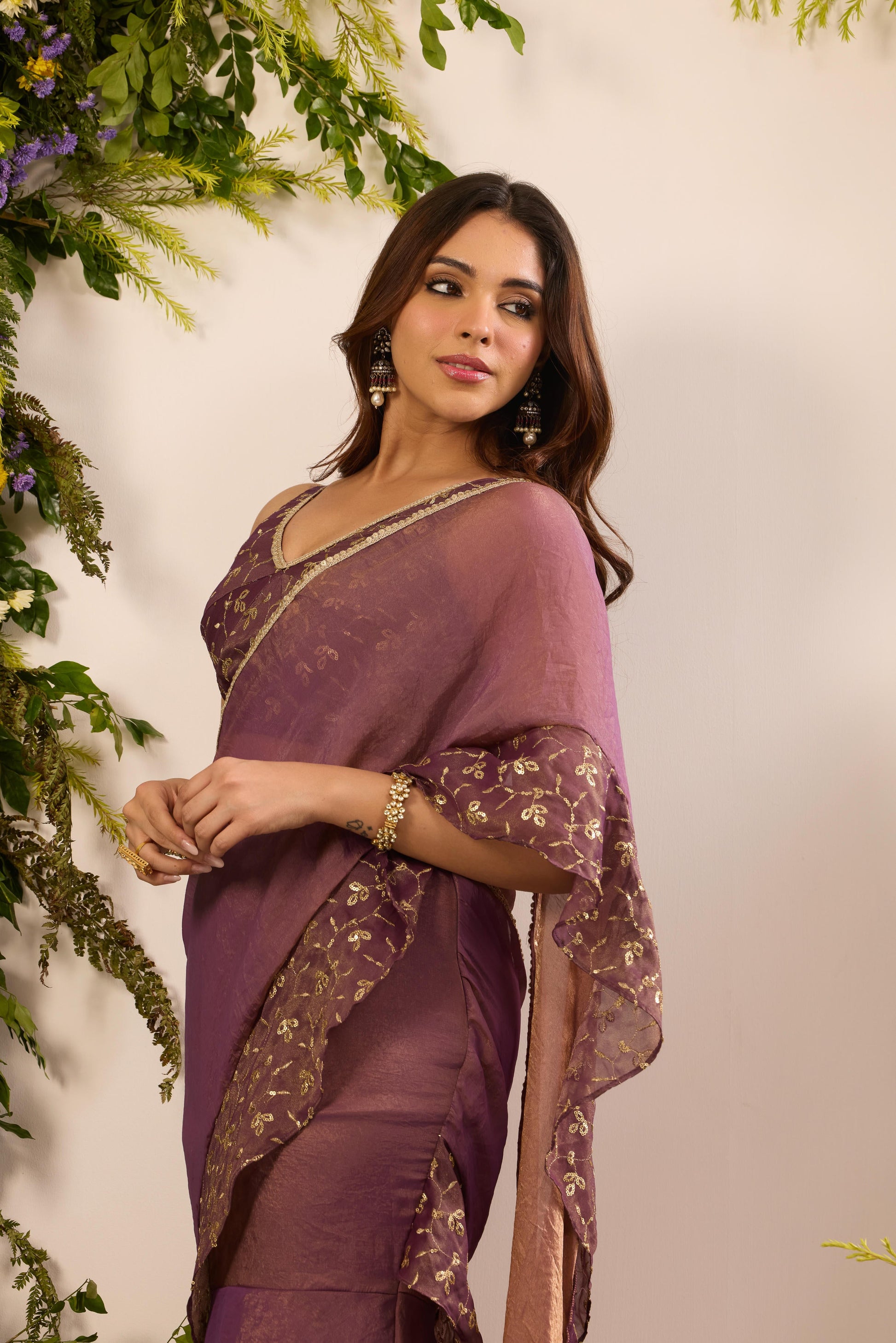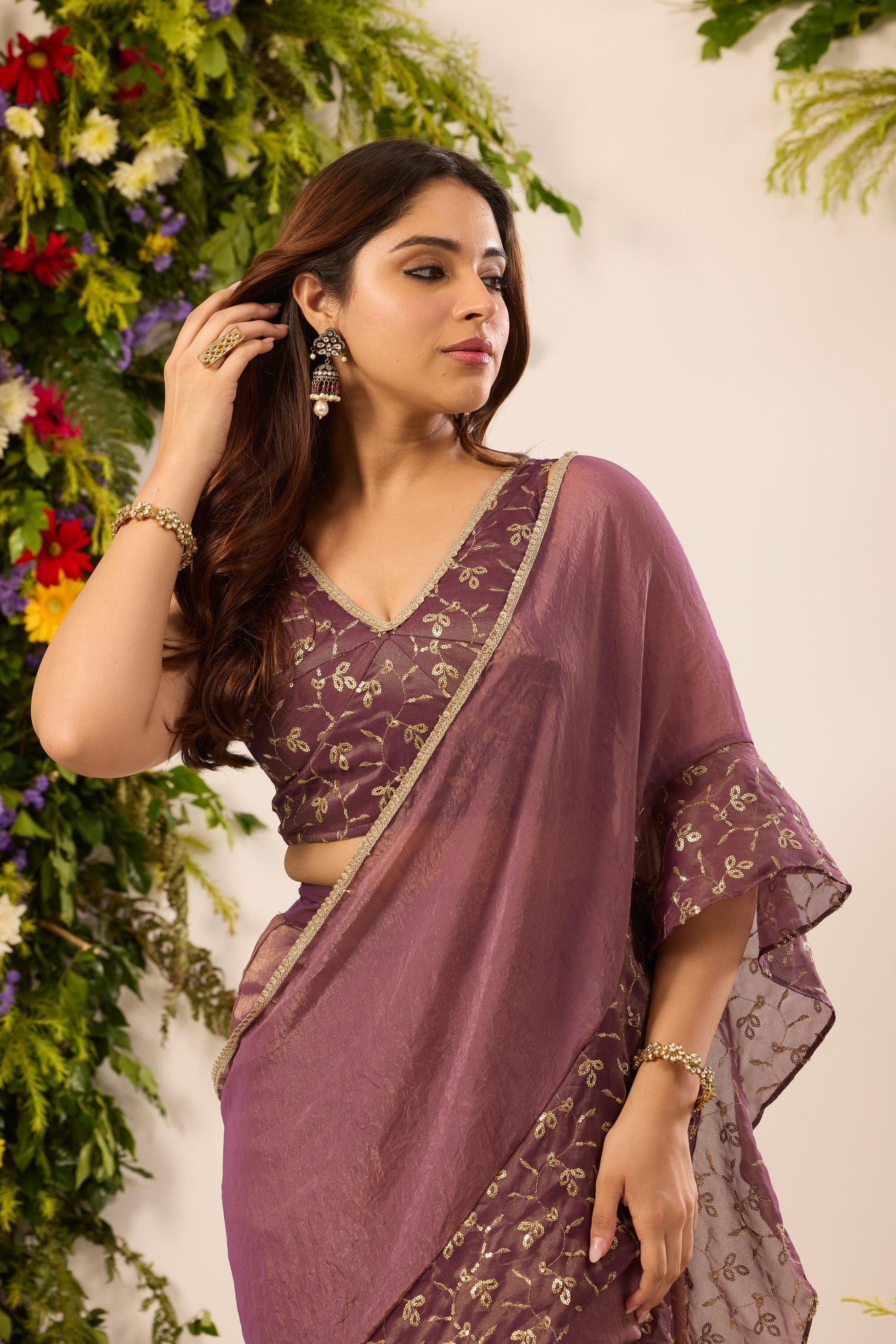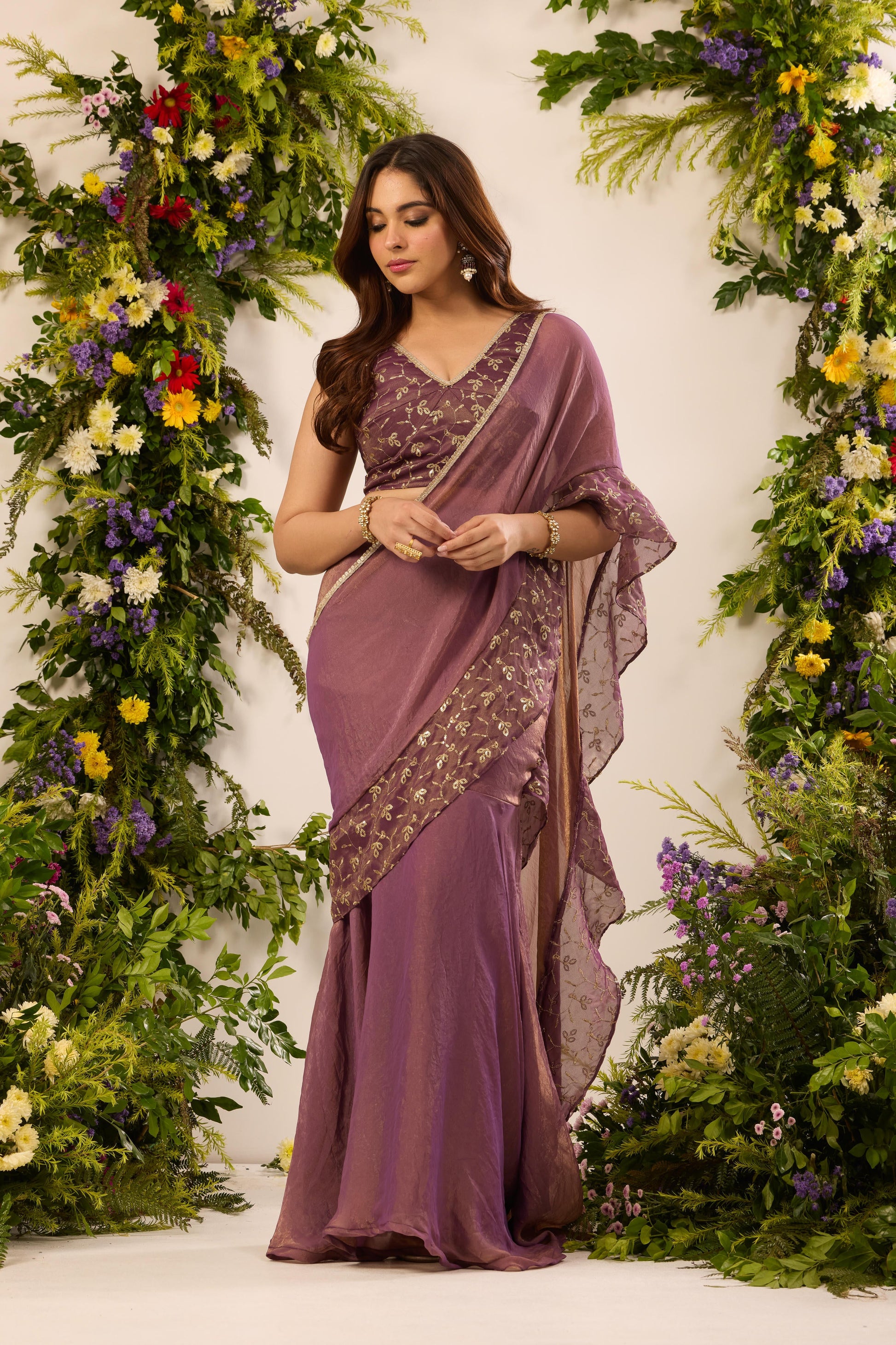 The Berry Bloom Saree Set from our Mastaani collection is crafted in shimmer fabric with a soft crepe lining. The blouse is non-padded with a V neckline, delicate embroidery, and a side zip closure for a comfortable fit.