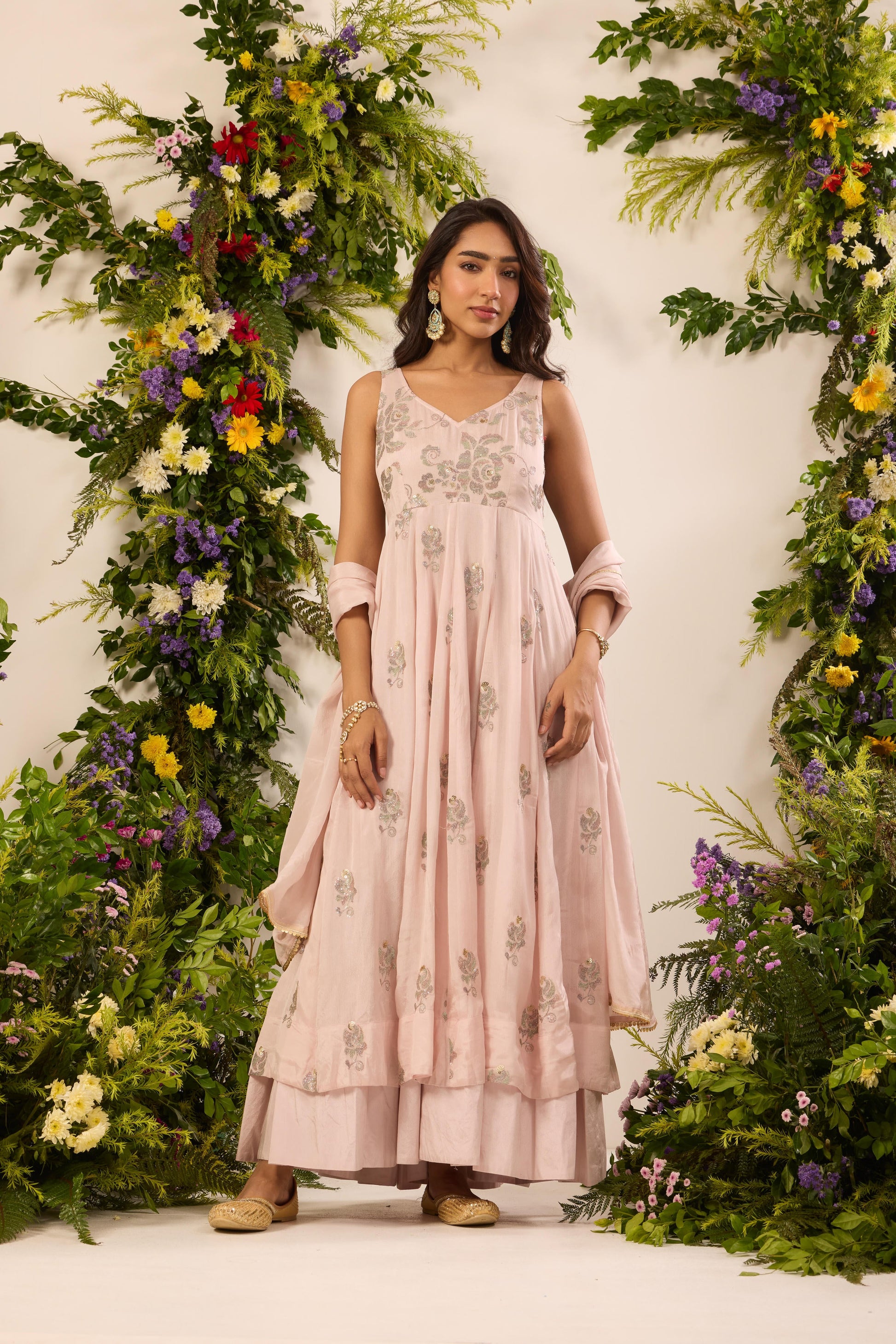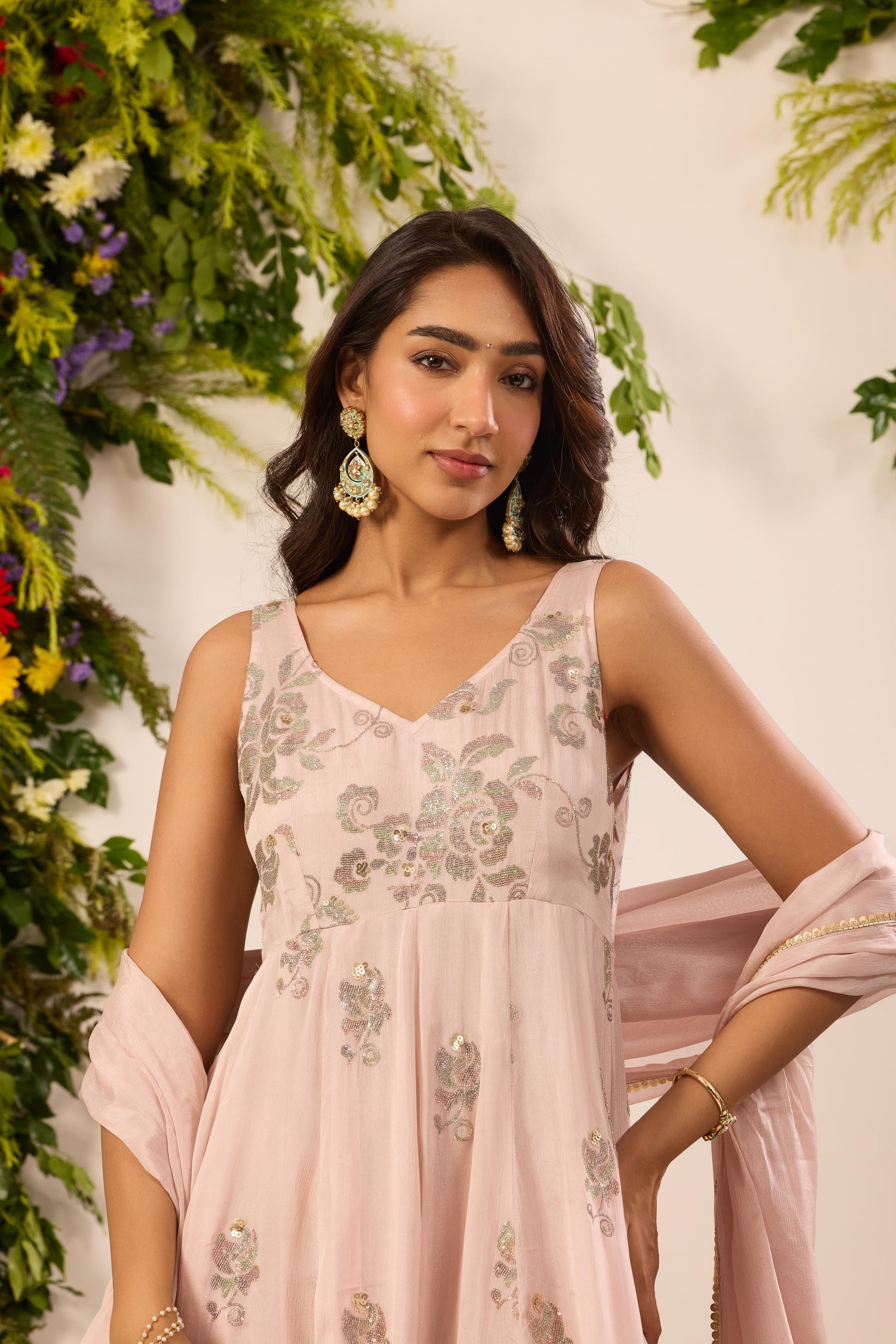 The Blush Blossom Anarkali Set from our Mastaani collection is crafted in soft pure chinnon fabric with a smooth crepe lining. The sleeveless anarkali features delicate floral embroidery with sequins, a V-neckline in the front, and a deep round neckline at the back. It is finished with a side zip closure for ease of wear.