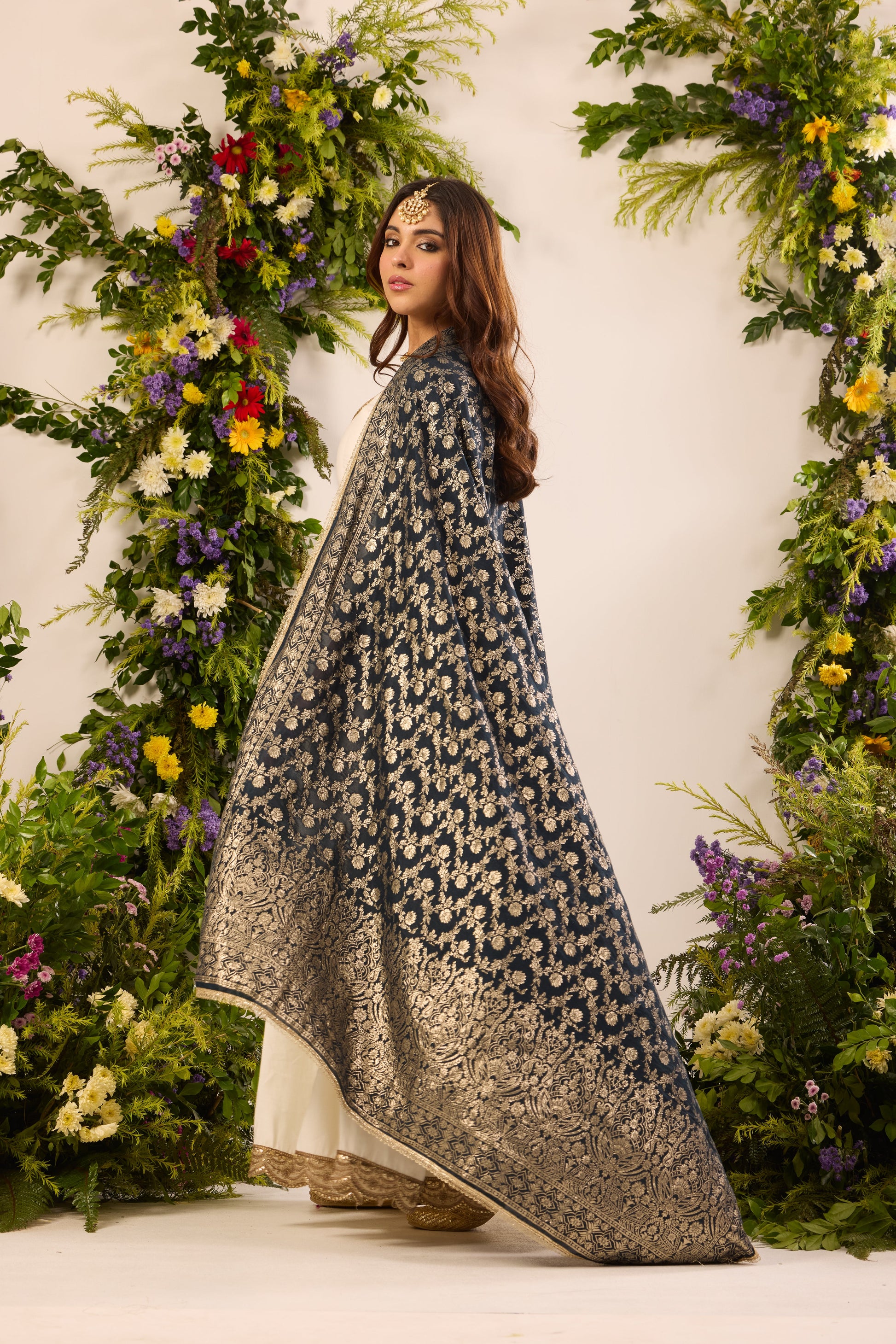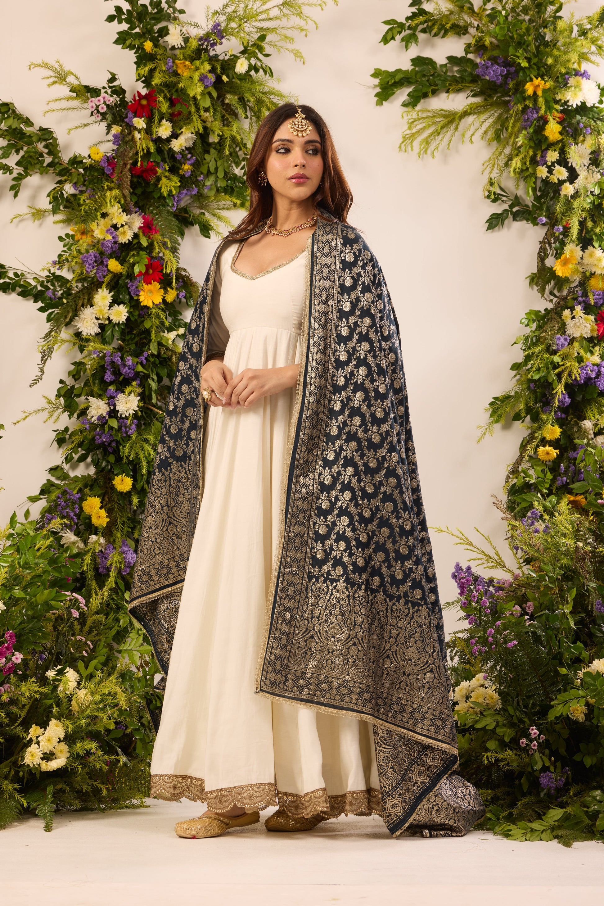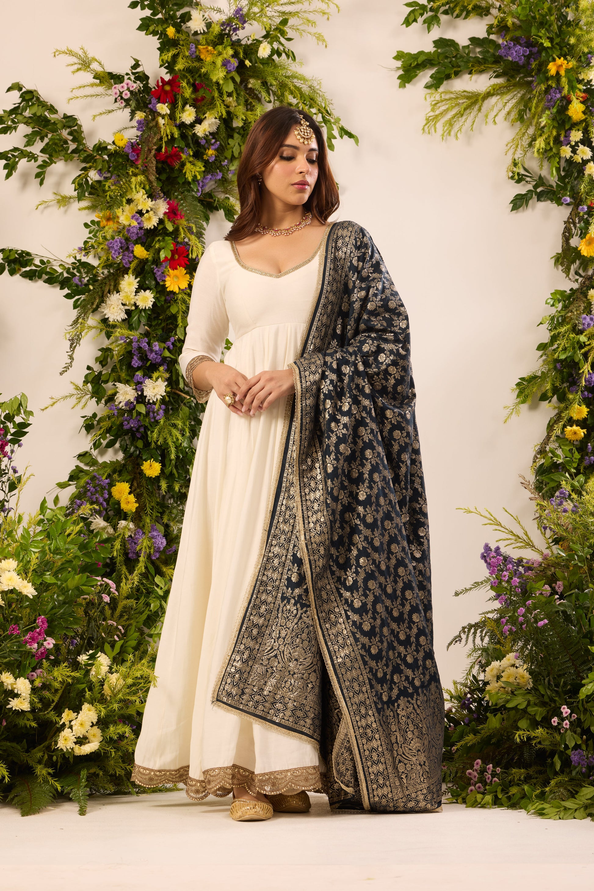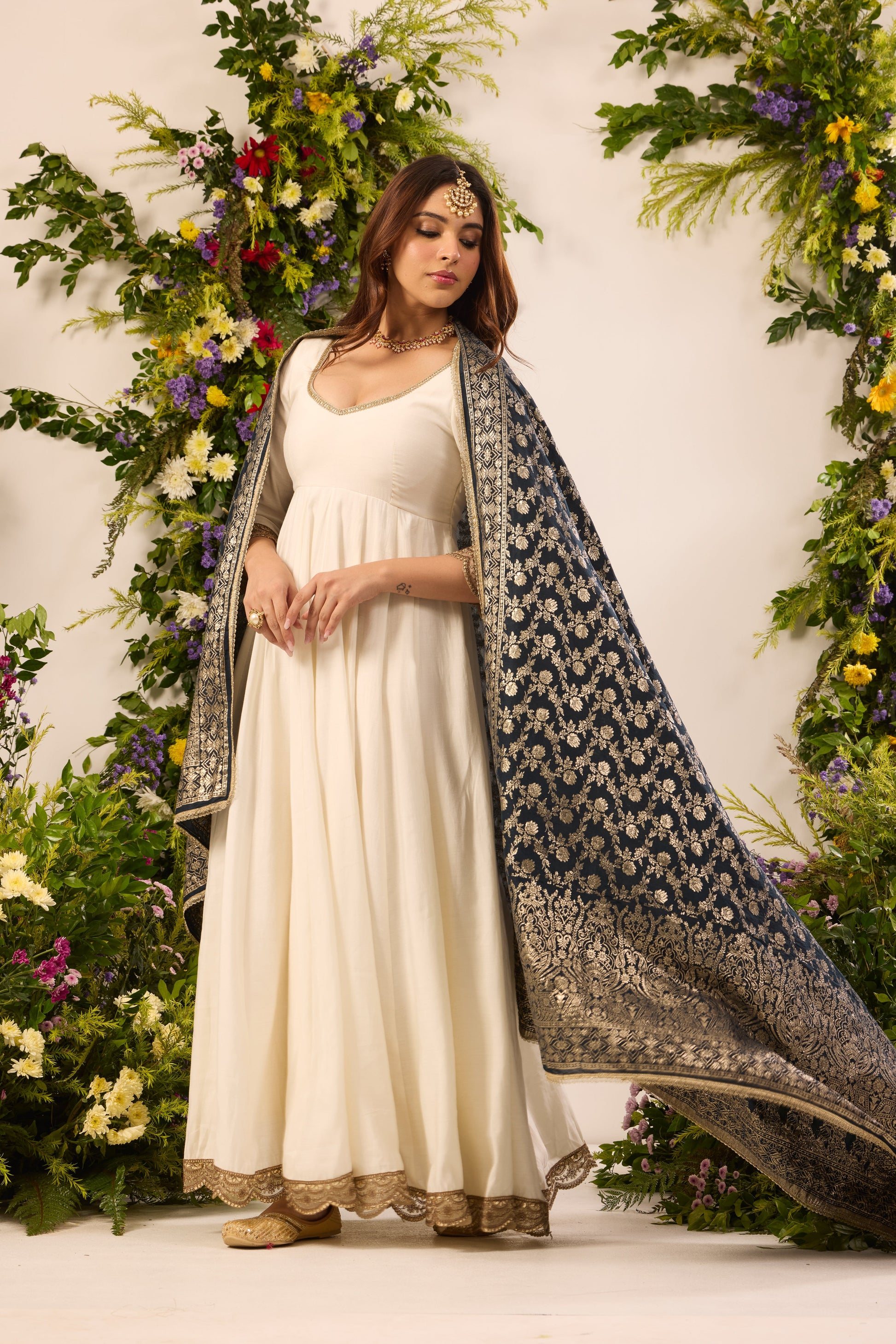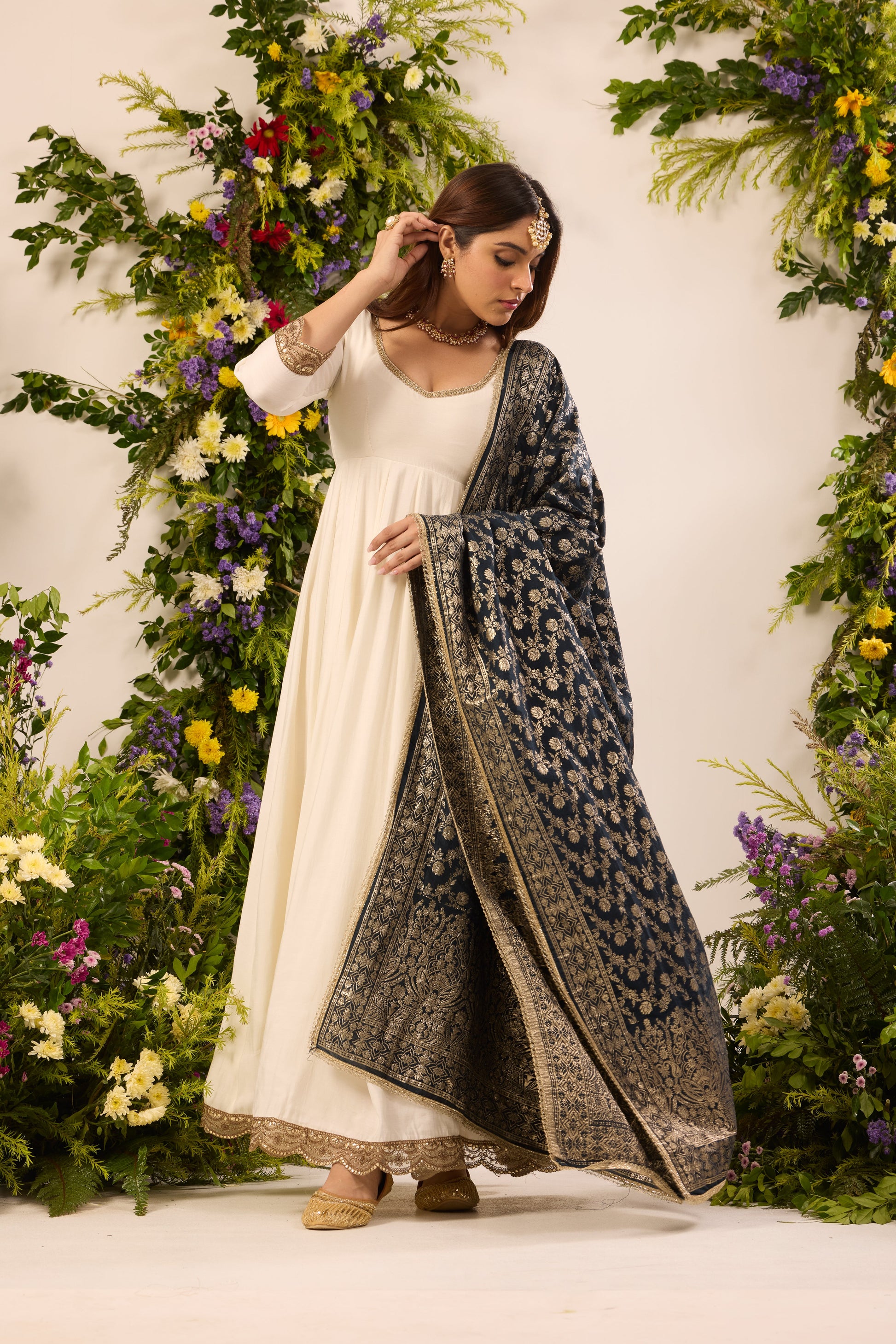 Mastaani Classic Ivory Anarkali Set - Blue Dupatta