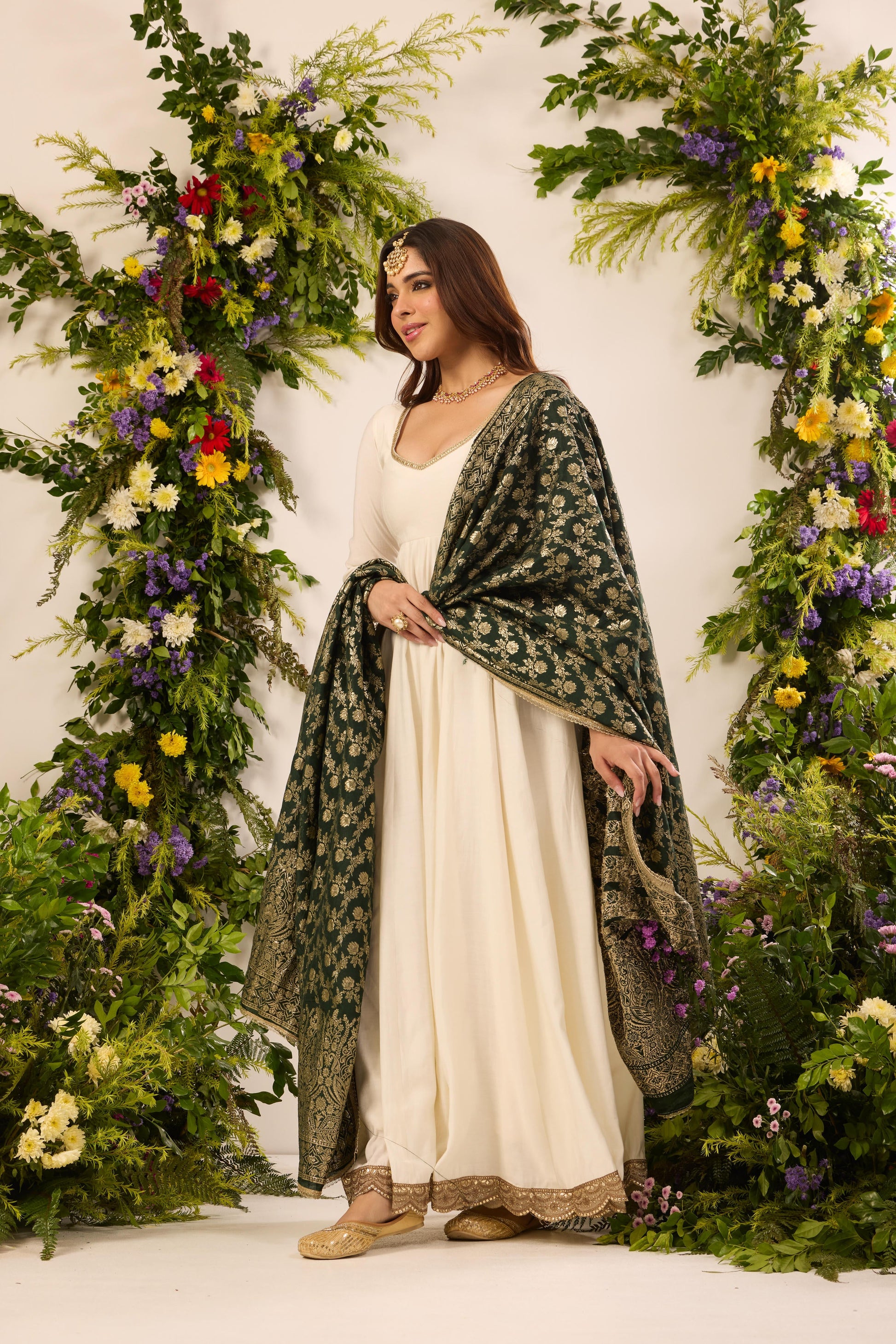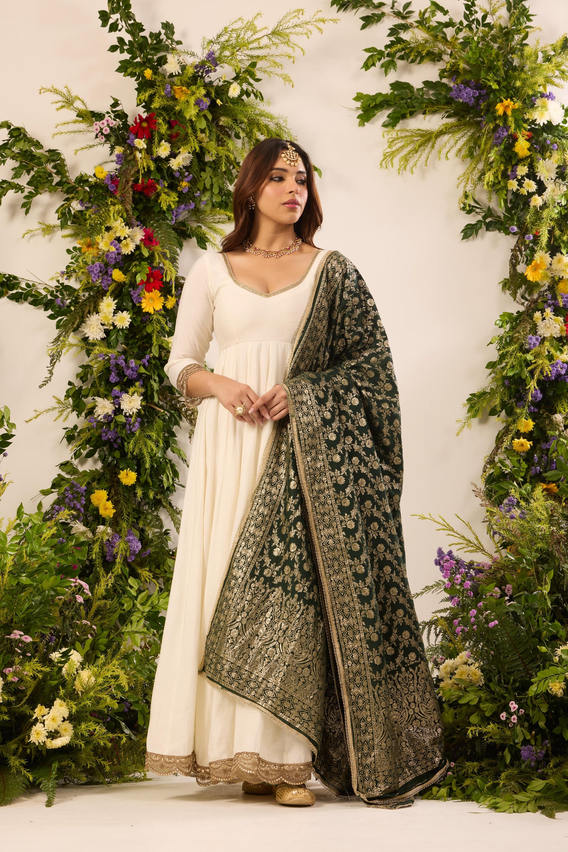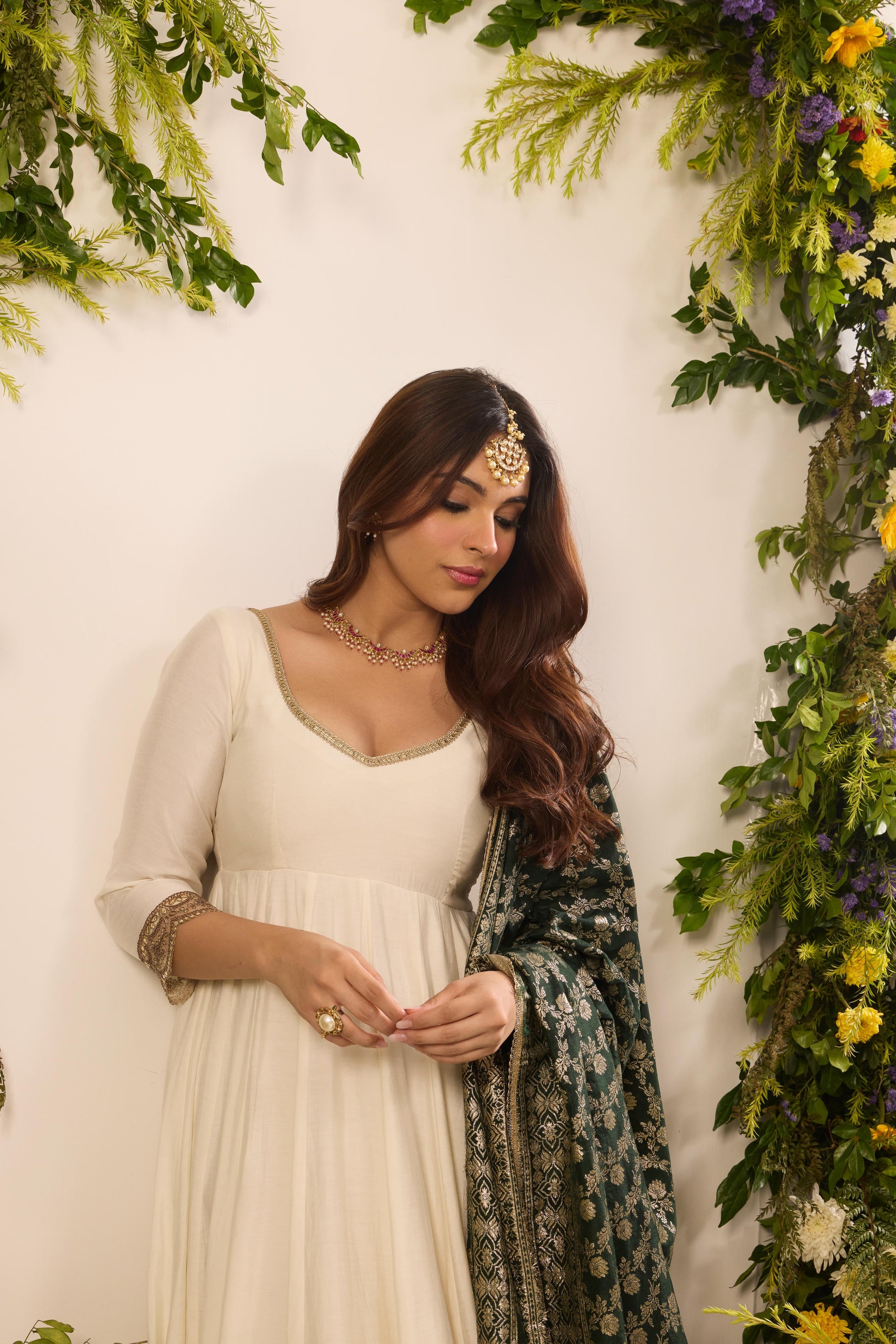 Mastaani Classic Ivory Anarkali Set - Emerald Dupatta