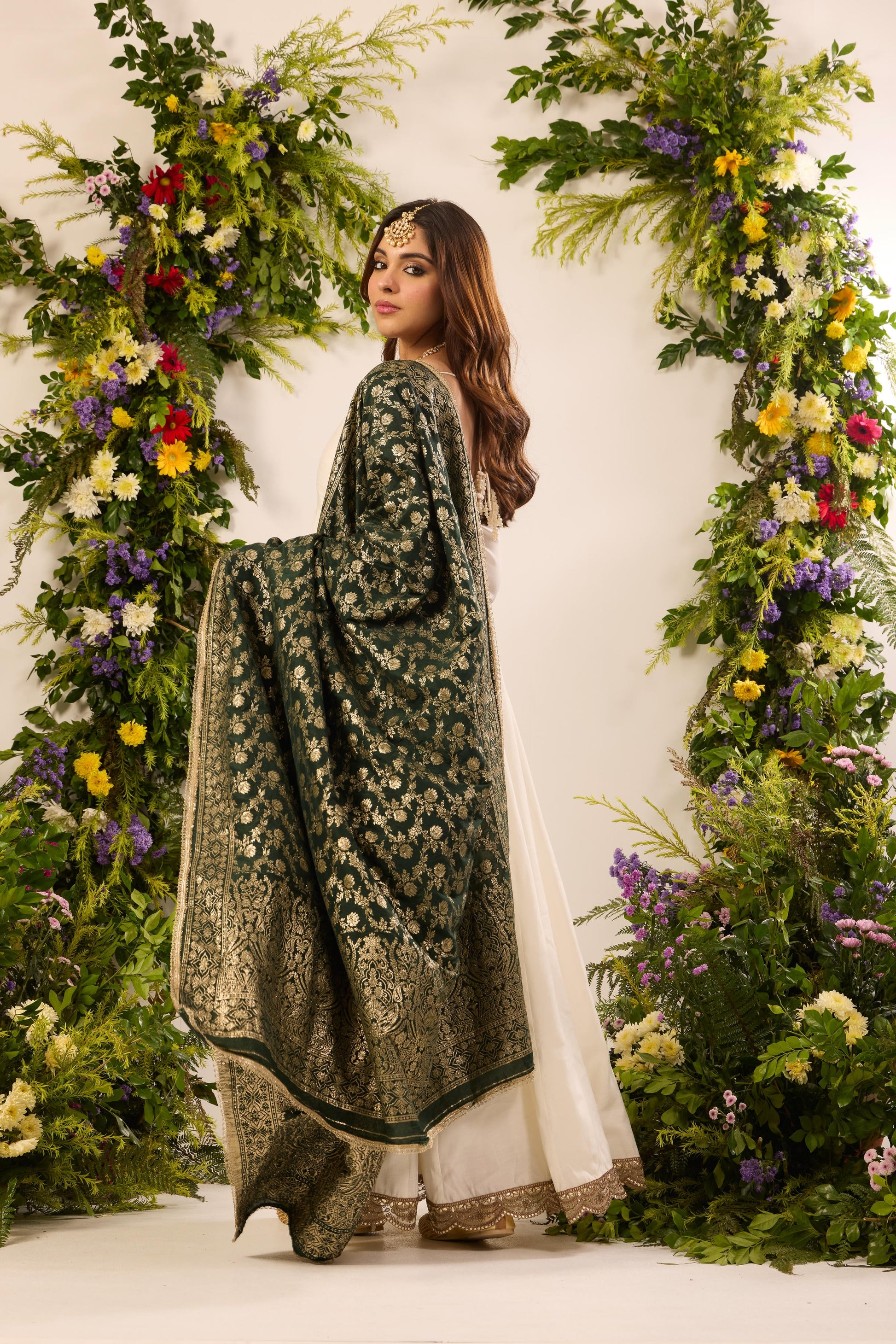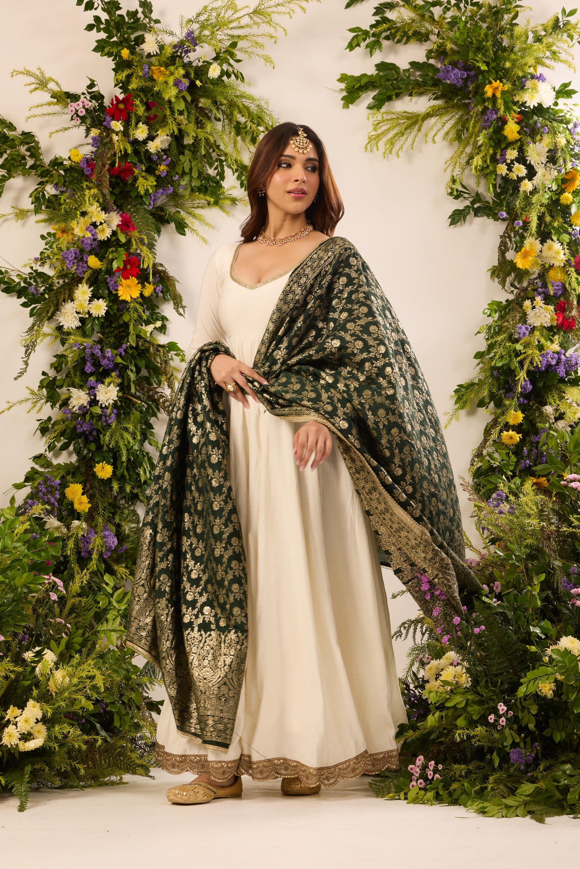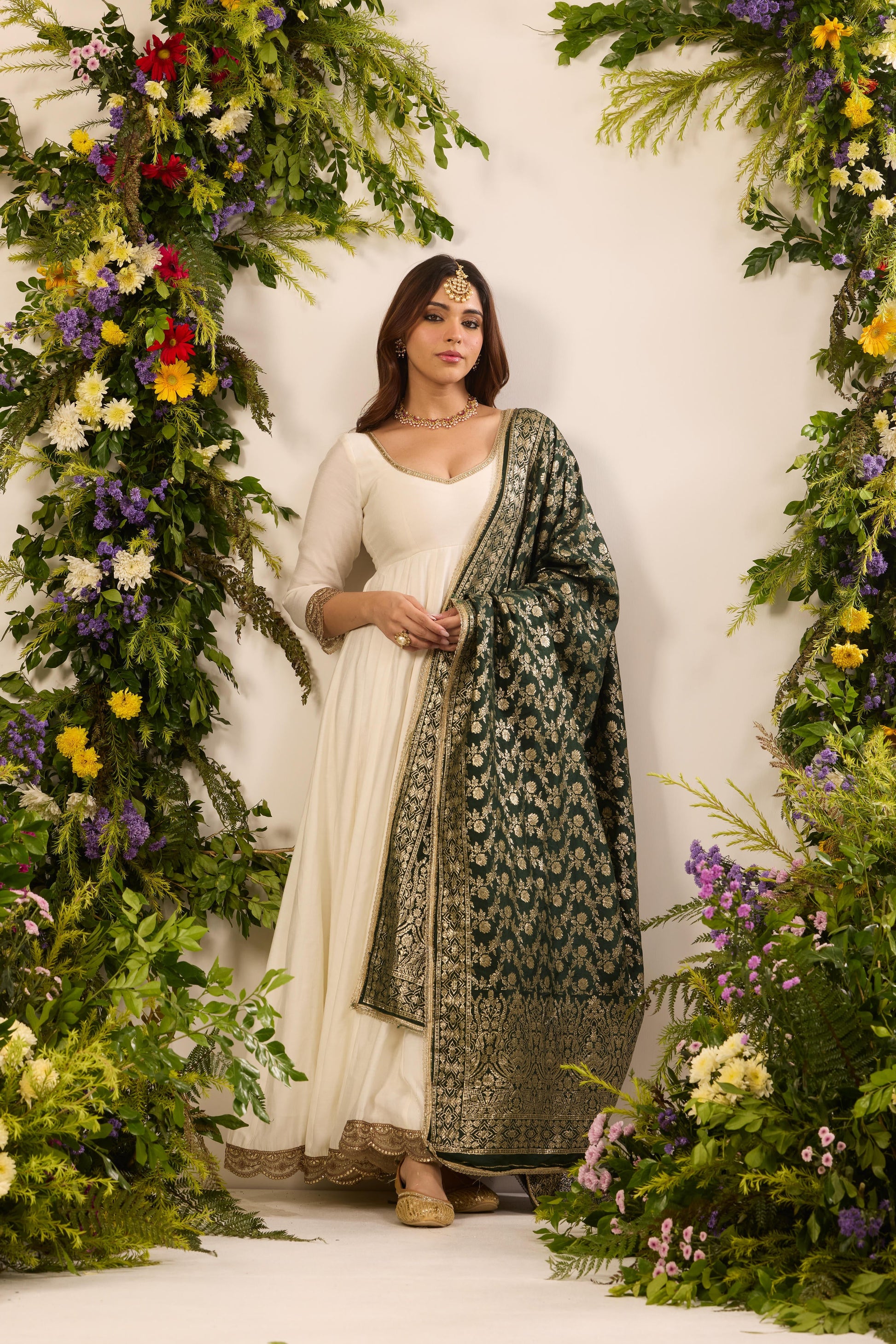 Mastaani Classic Ivory Anarkali Set - Emerald Dupatta
