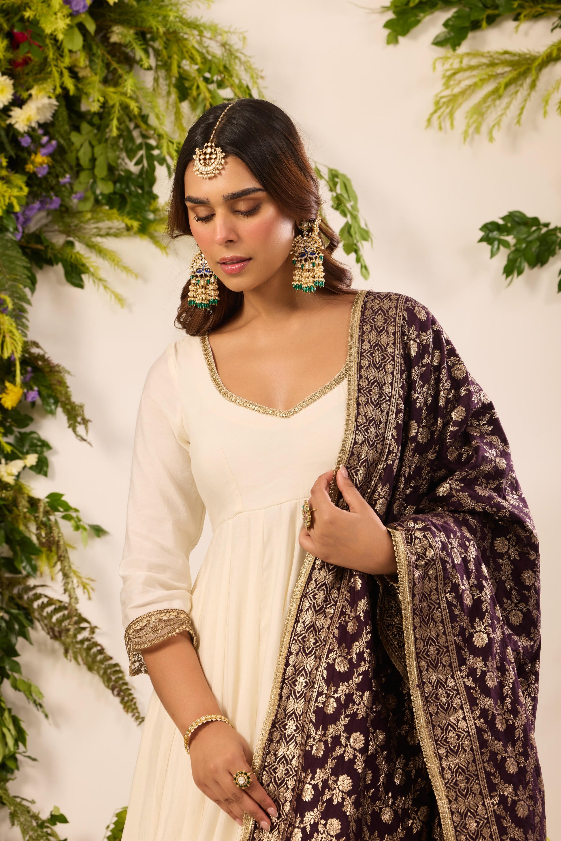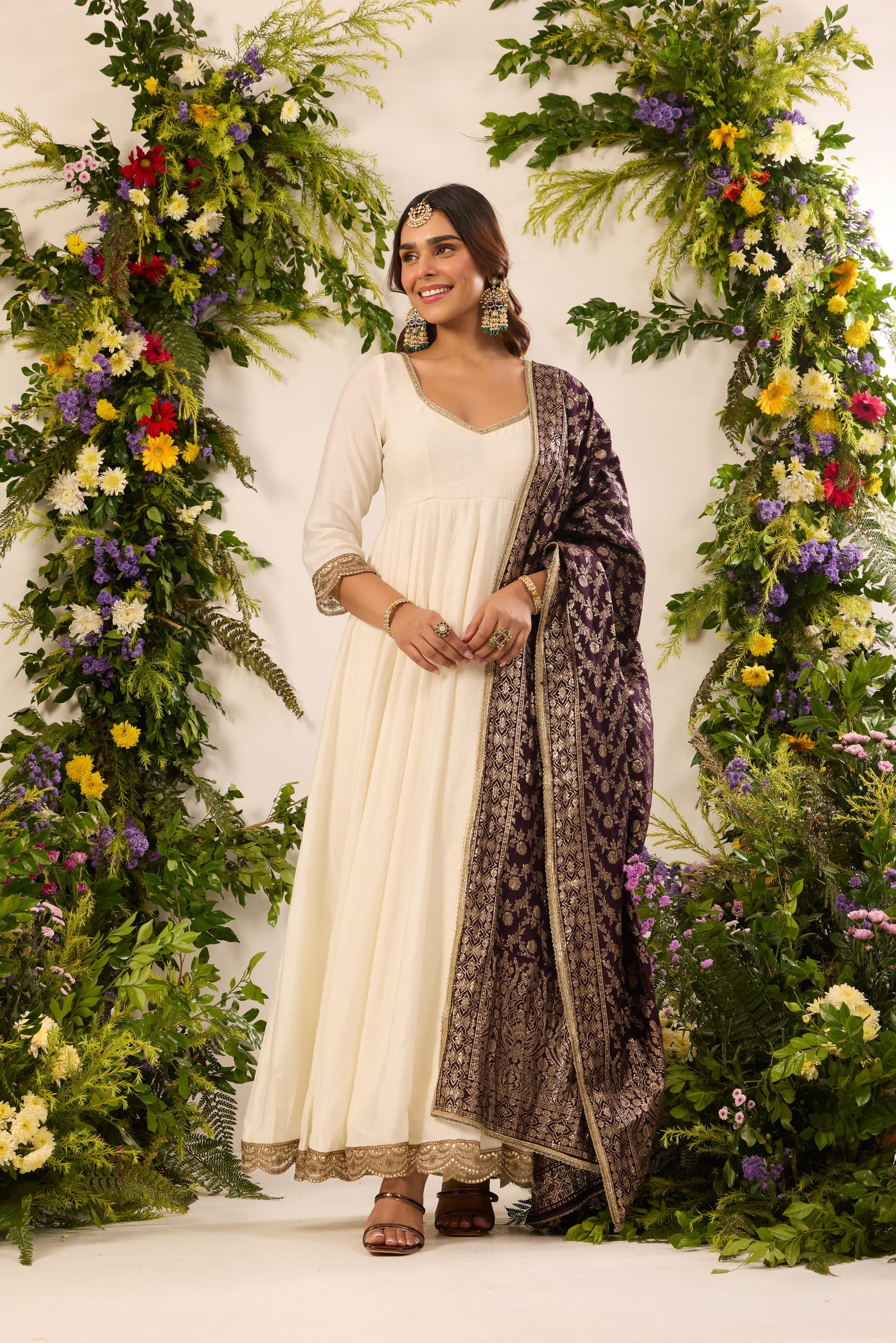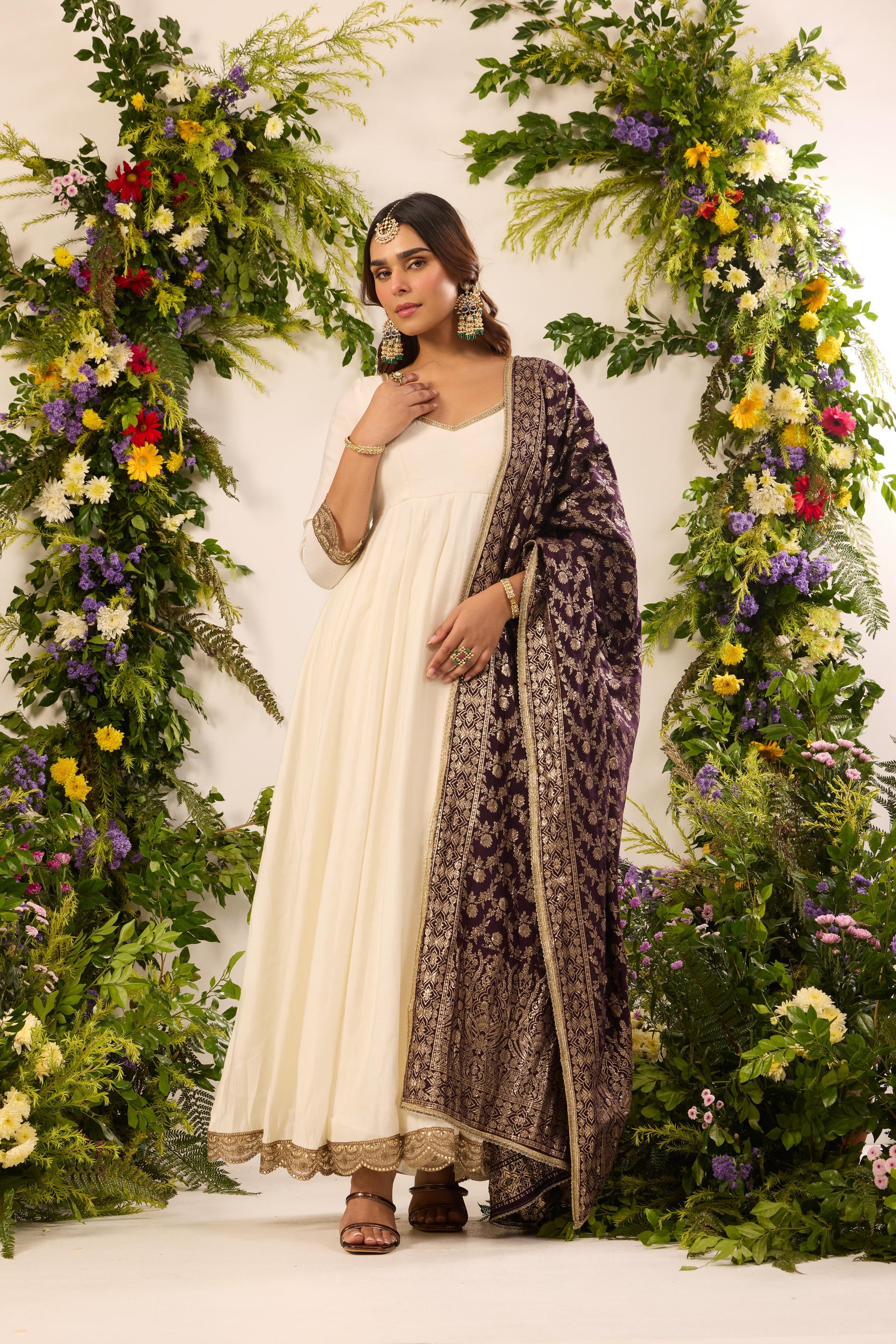 Mastaani Classic Ivory Anarkali Set - Purple Dupatta