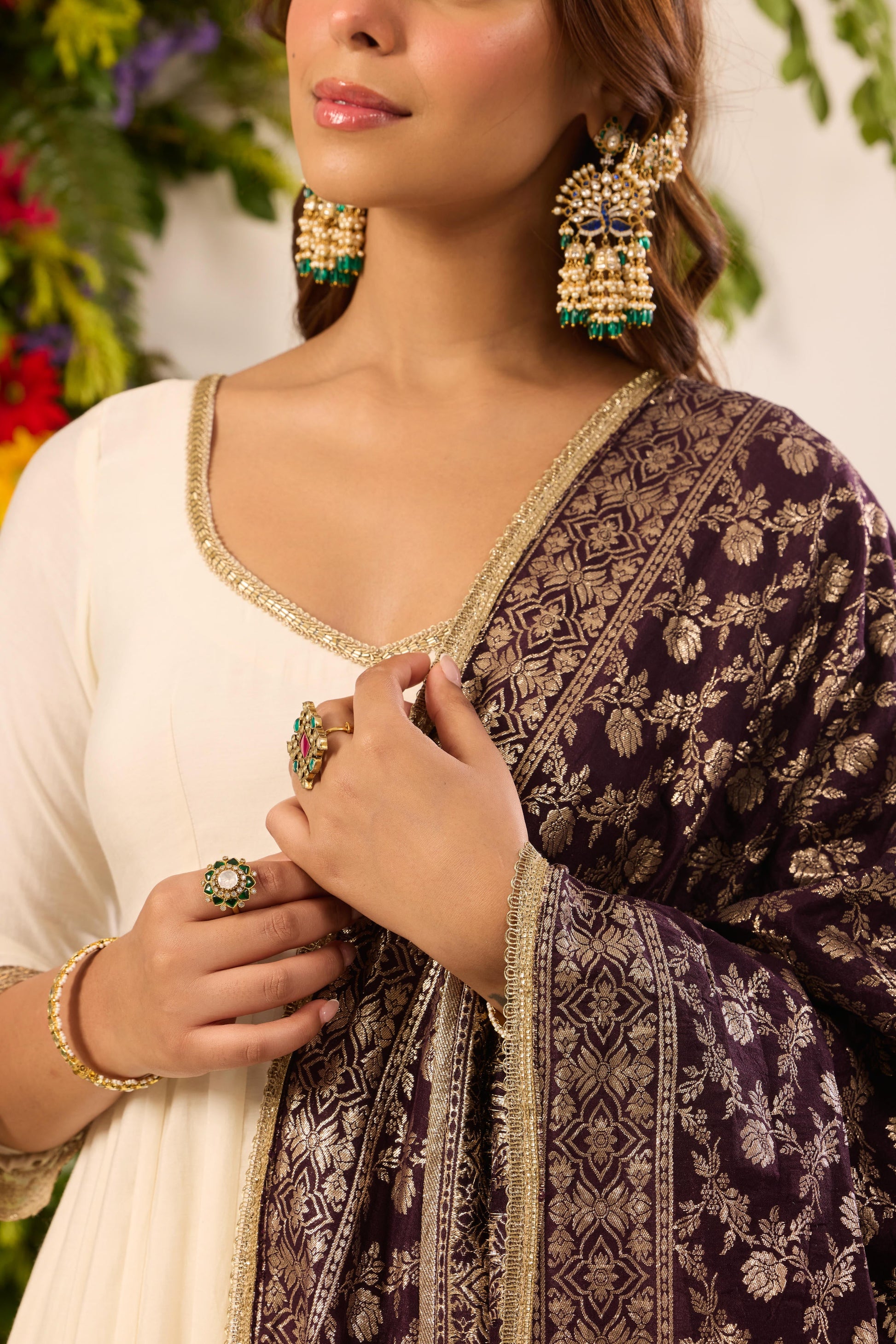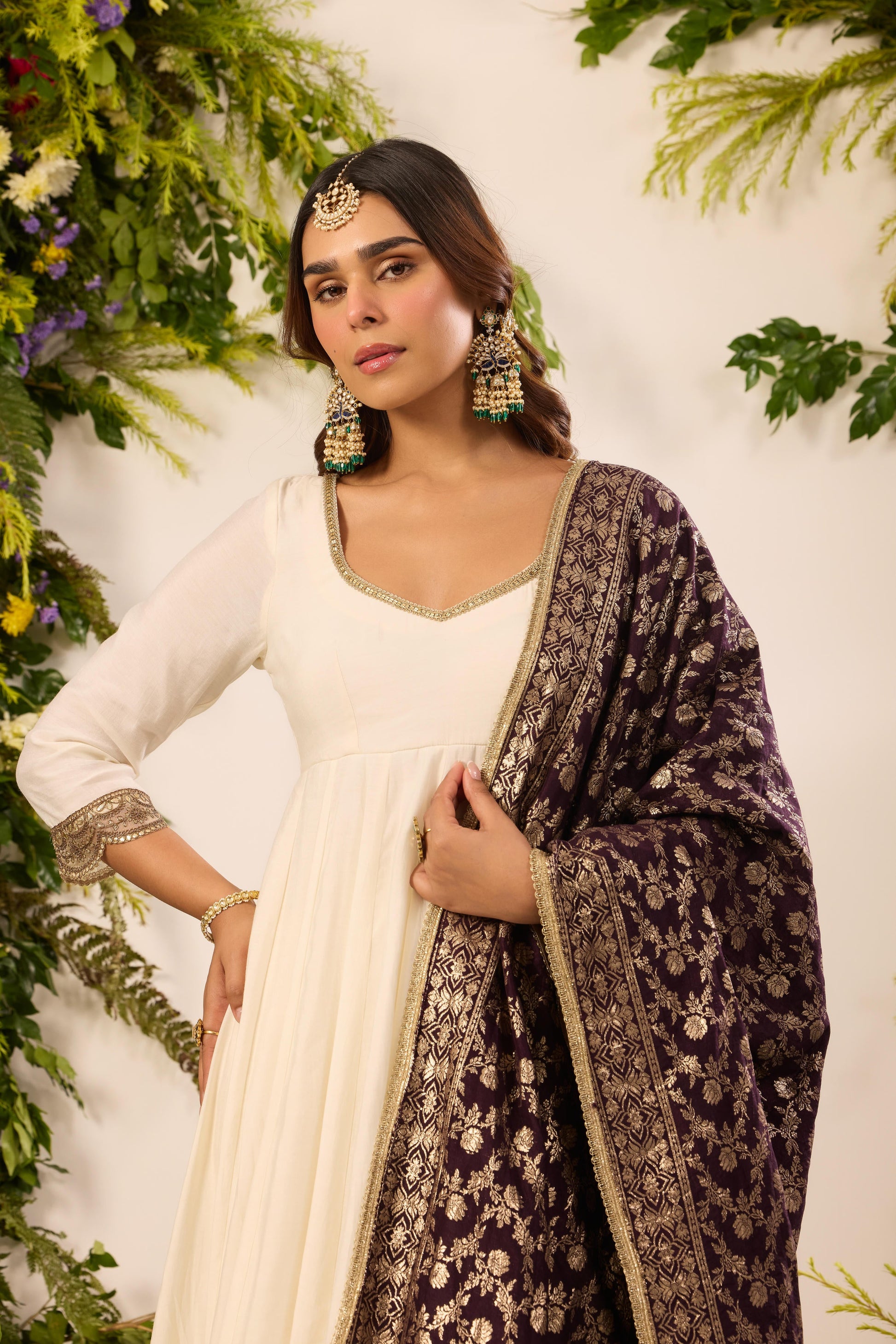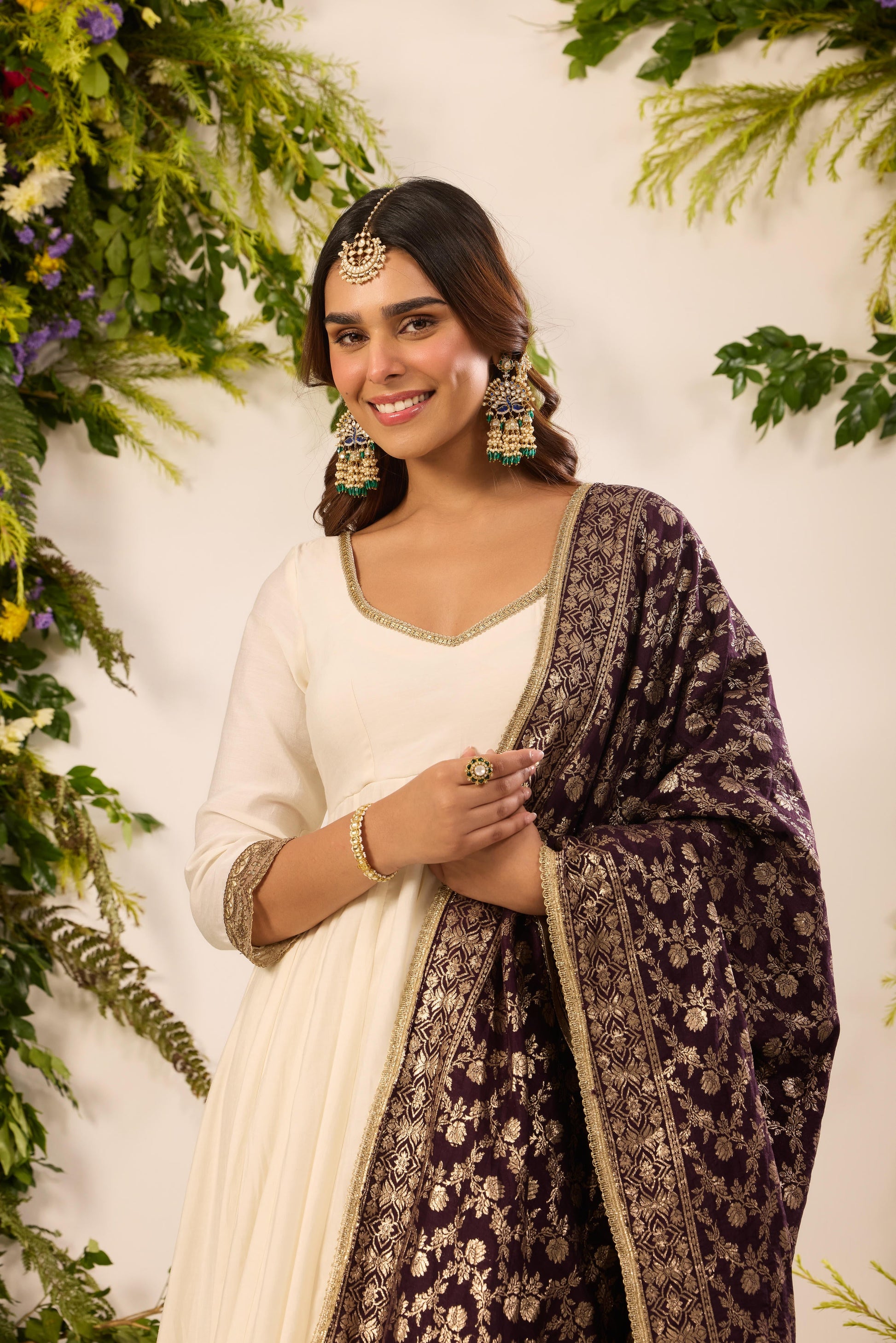 Mastaani Classic Ivory Anarkali Set - Purple Dupatta