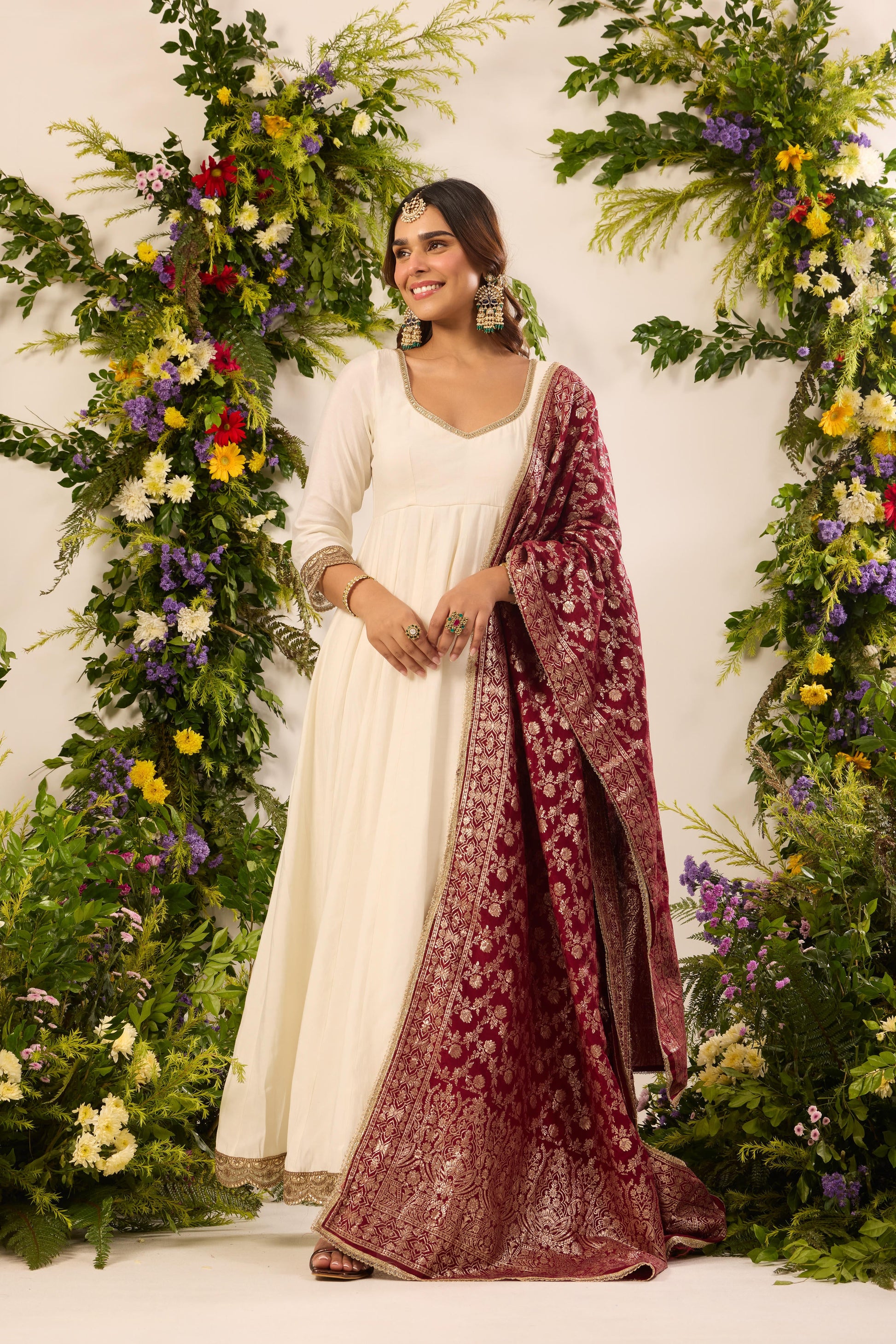 Mastaani Classic Ivory Anarkali Set - Red Dupatta