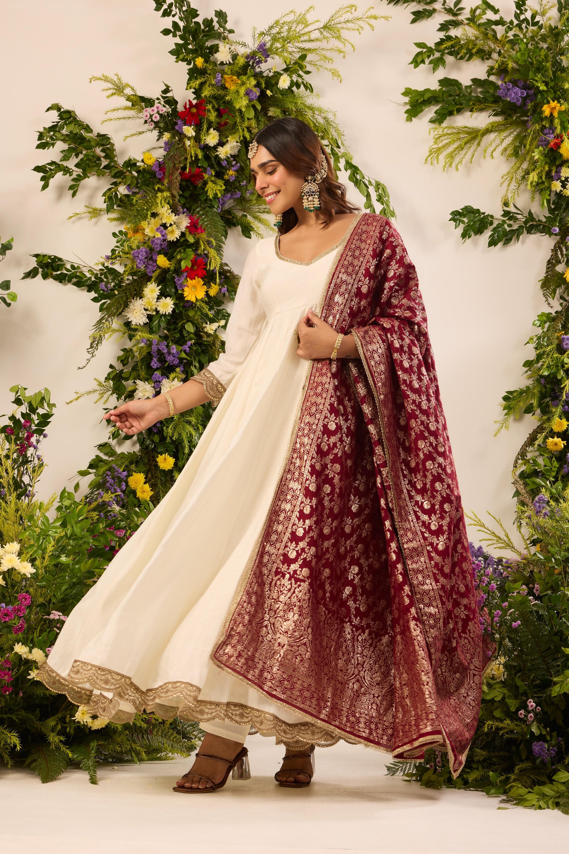 The Classic Ivory Anarkali Set is crafted in chanderi fabric with a paneled kali cut that creates a voluminous, flowy silhouette. The neckline and sleeves are delicately edged, while the hemline is finished with an antique border that adds heritage charm.