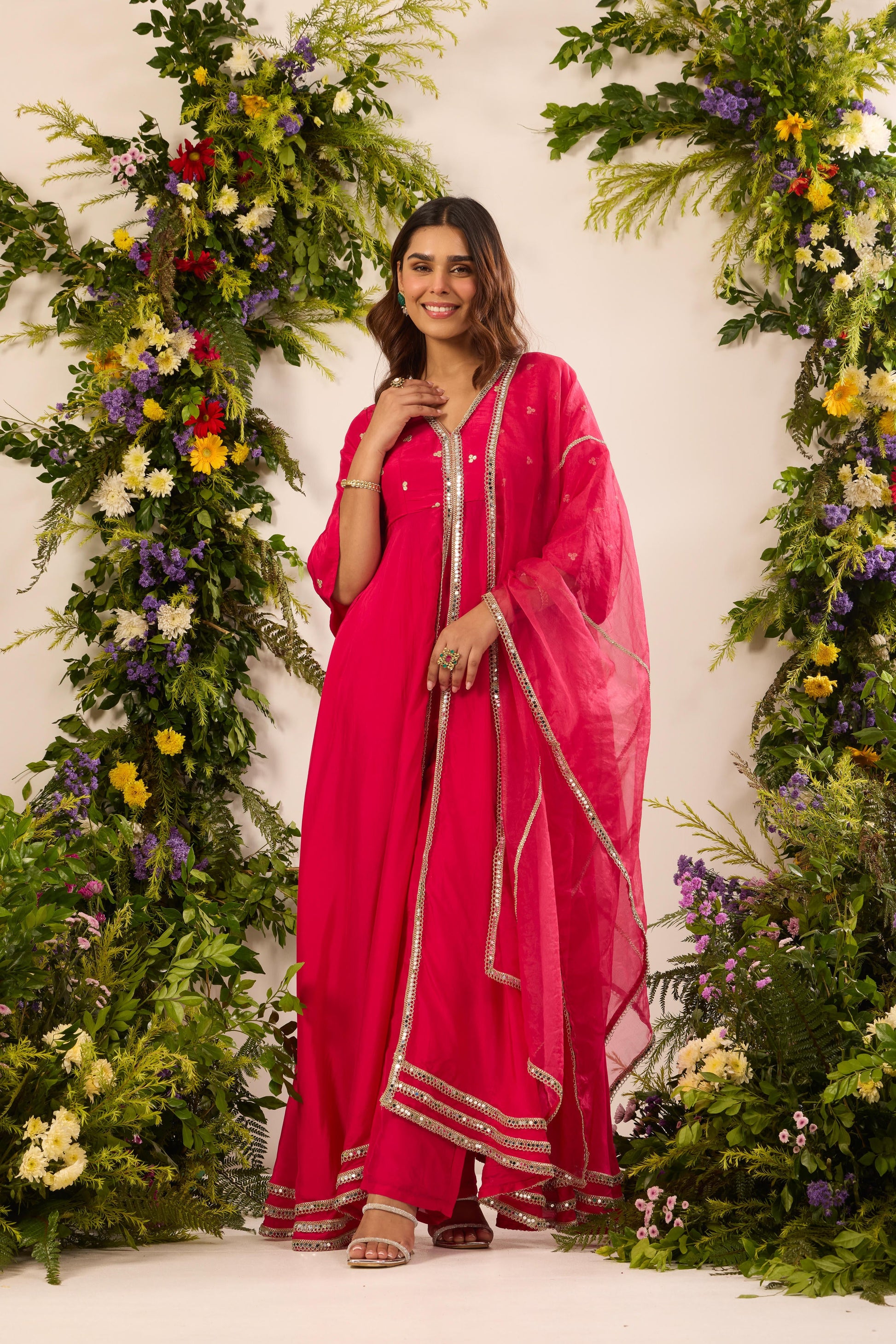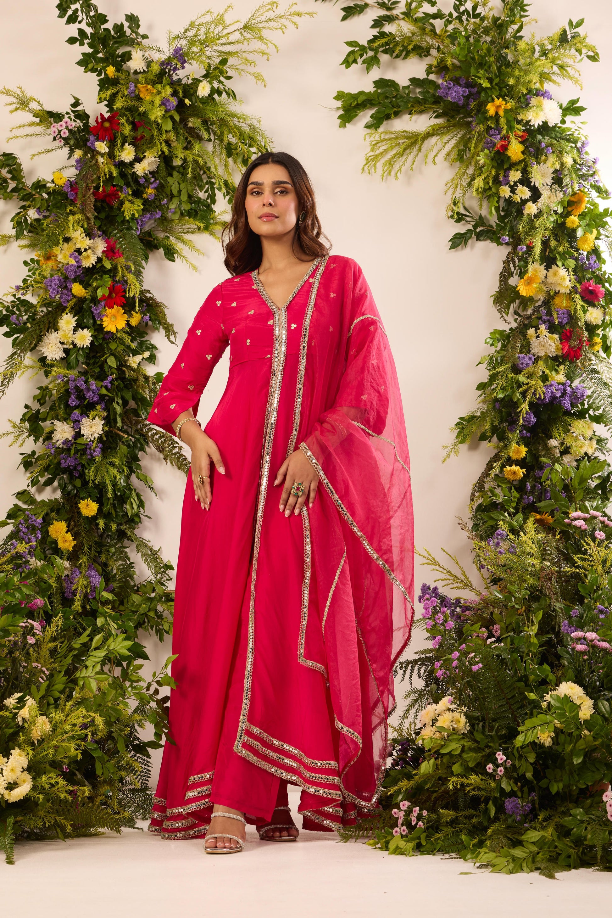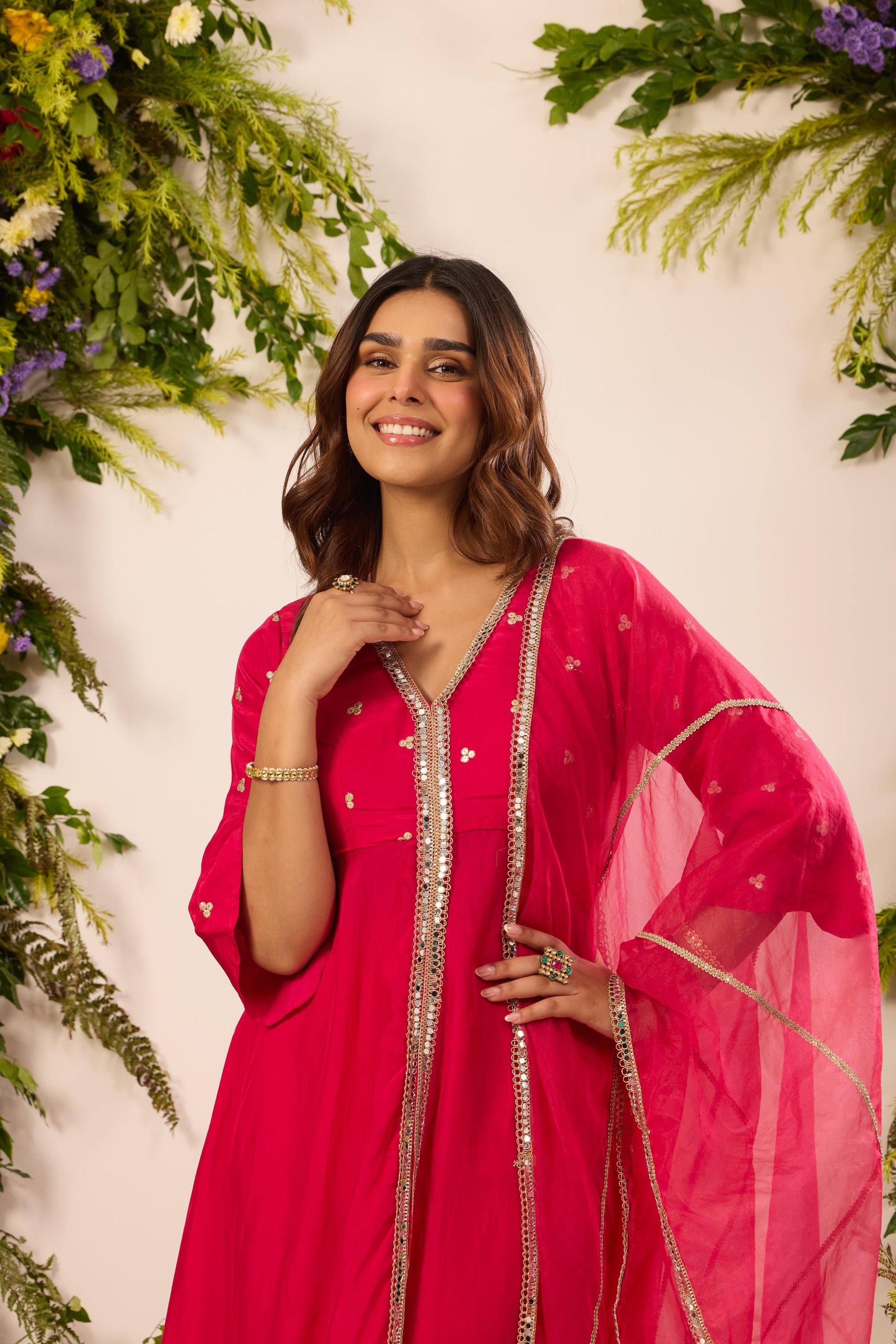 The Rani Jewel Anarkali Set is crafted in opada silk with scattered sequin embroidery for a refined sheen. The anarkali comes with a flattering front slit silhouette, accentuated by mirror-work lace detailing along the neckline, sleeves, and hemline.