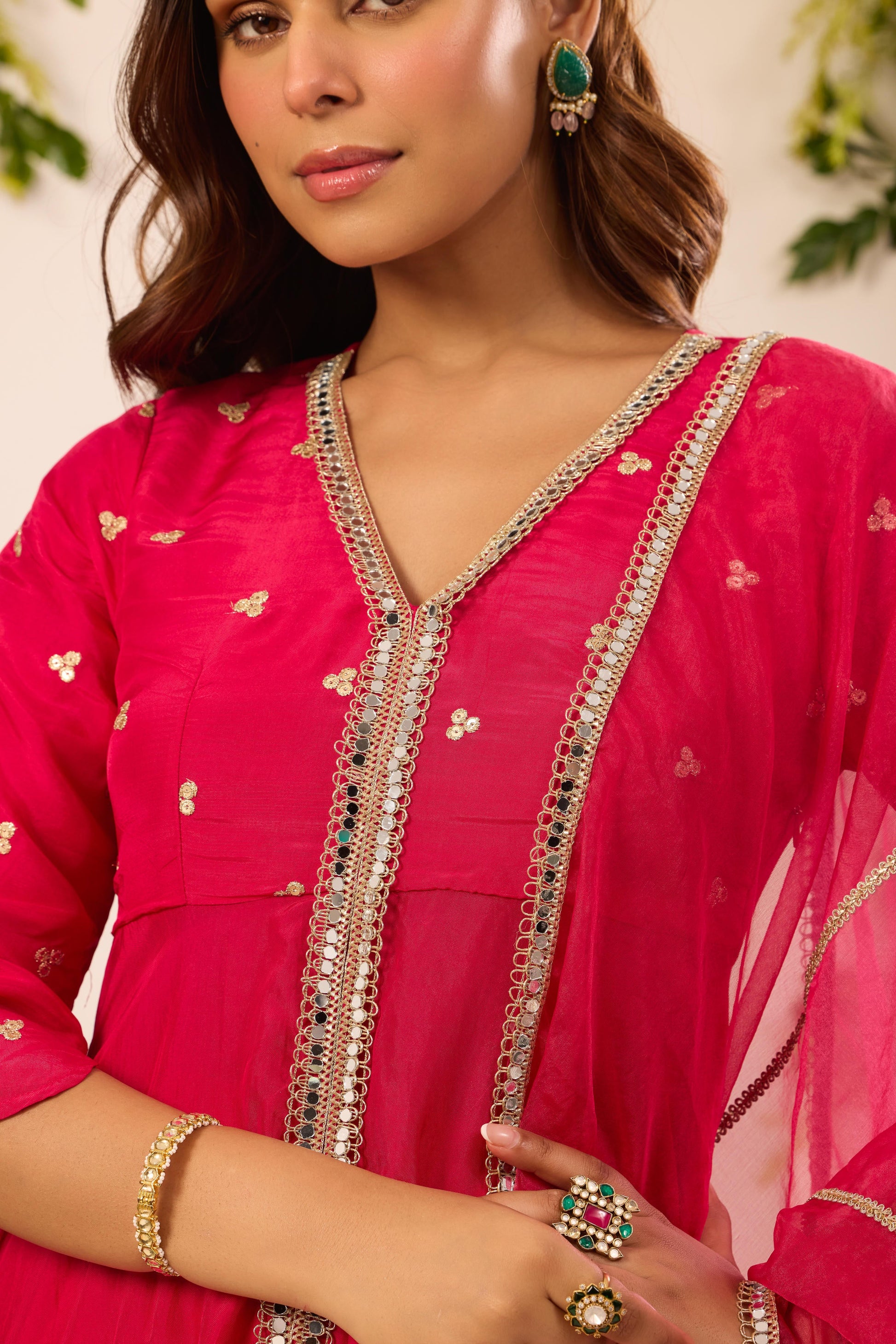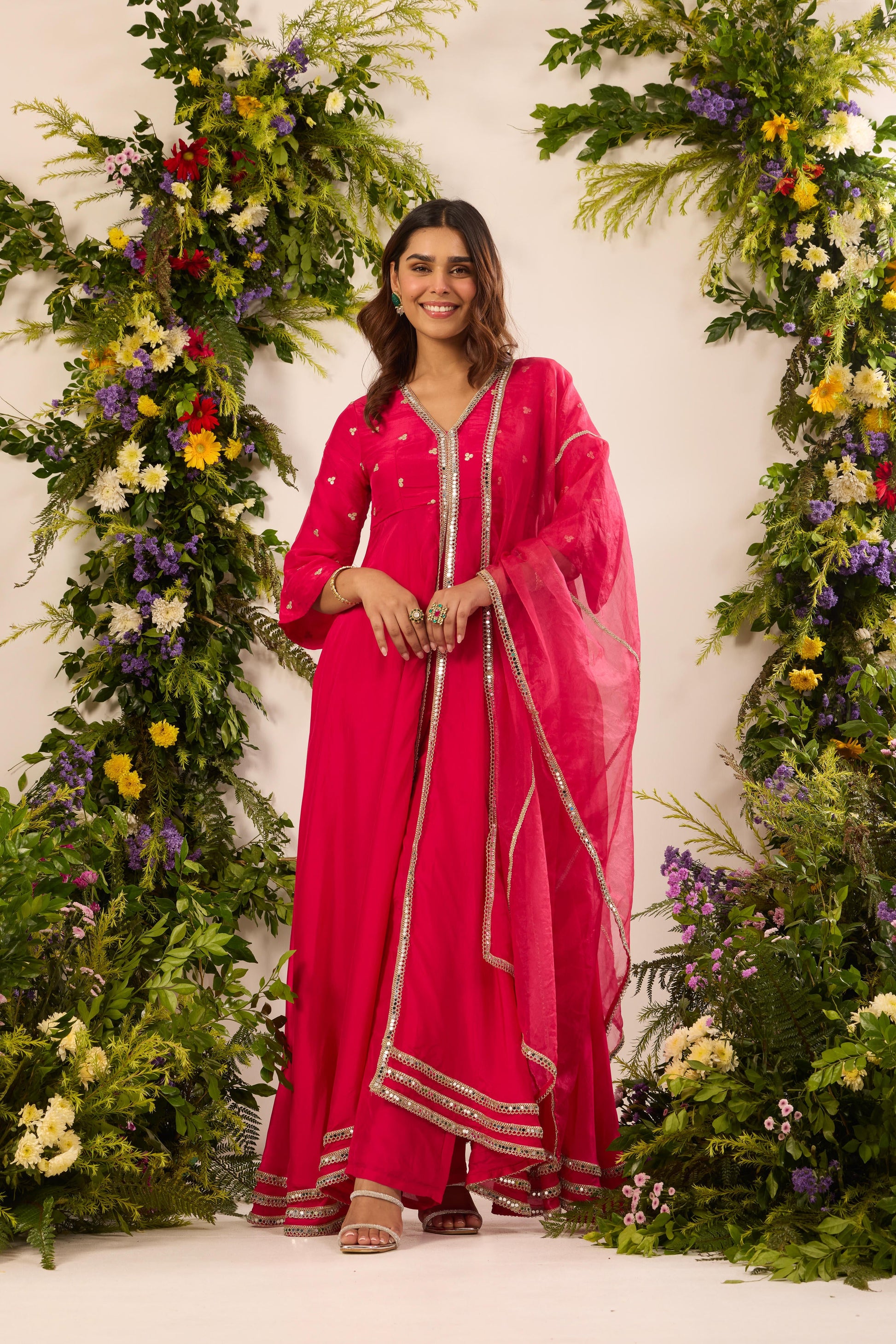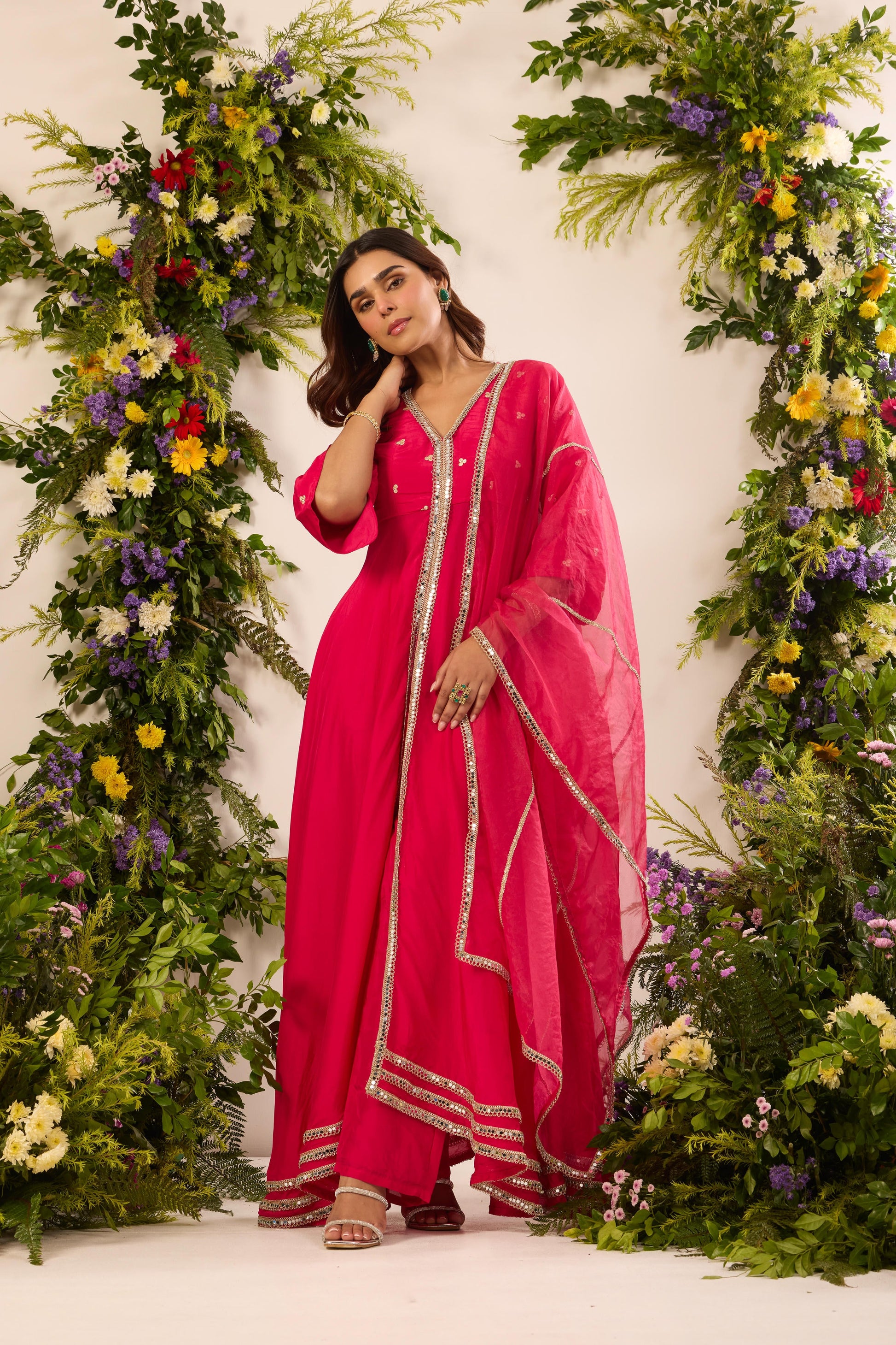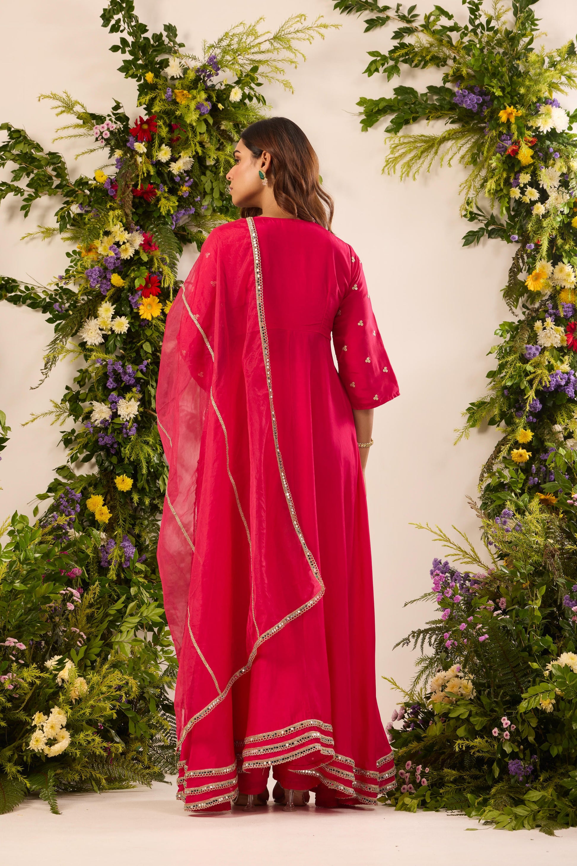 The Rani Jewel Anarkali Set is crafted in opada silk with scattered sequin embroidery for a refined sheen. The anarkali comes with a flattering front slit silhouette, accentuated by mirror-work lace detailing along the neckline, sleeves, and hemline.