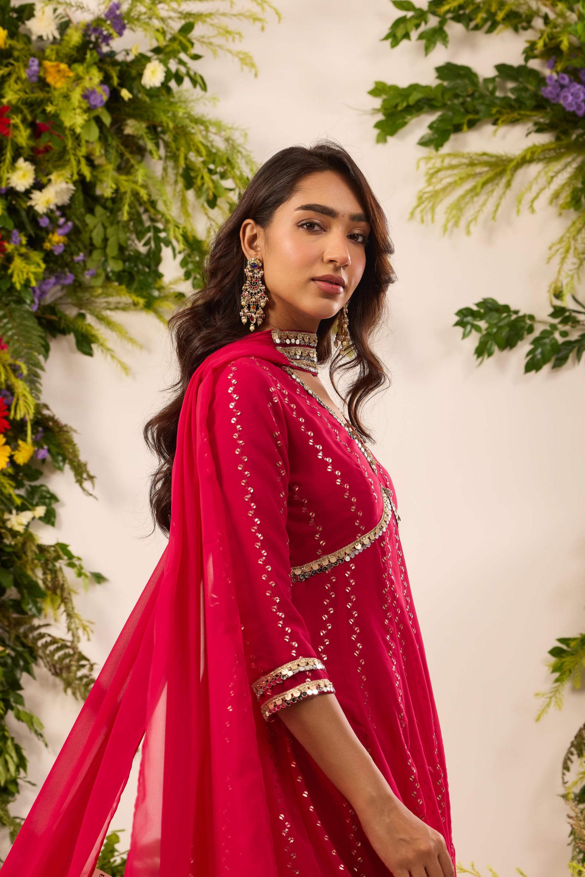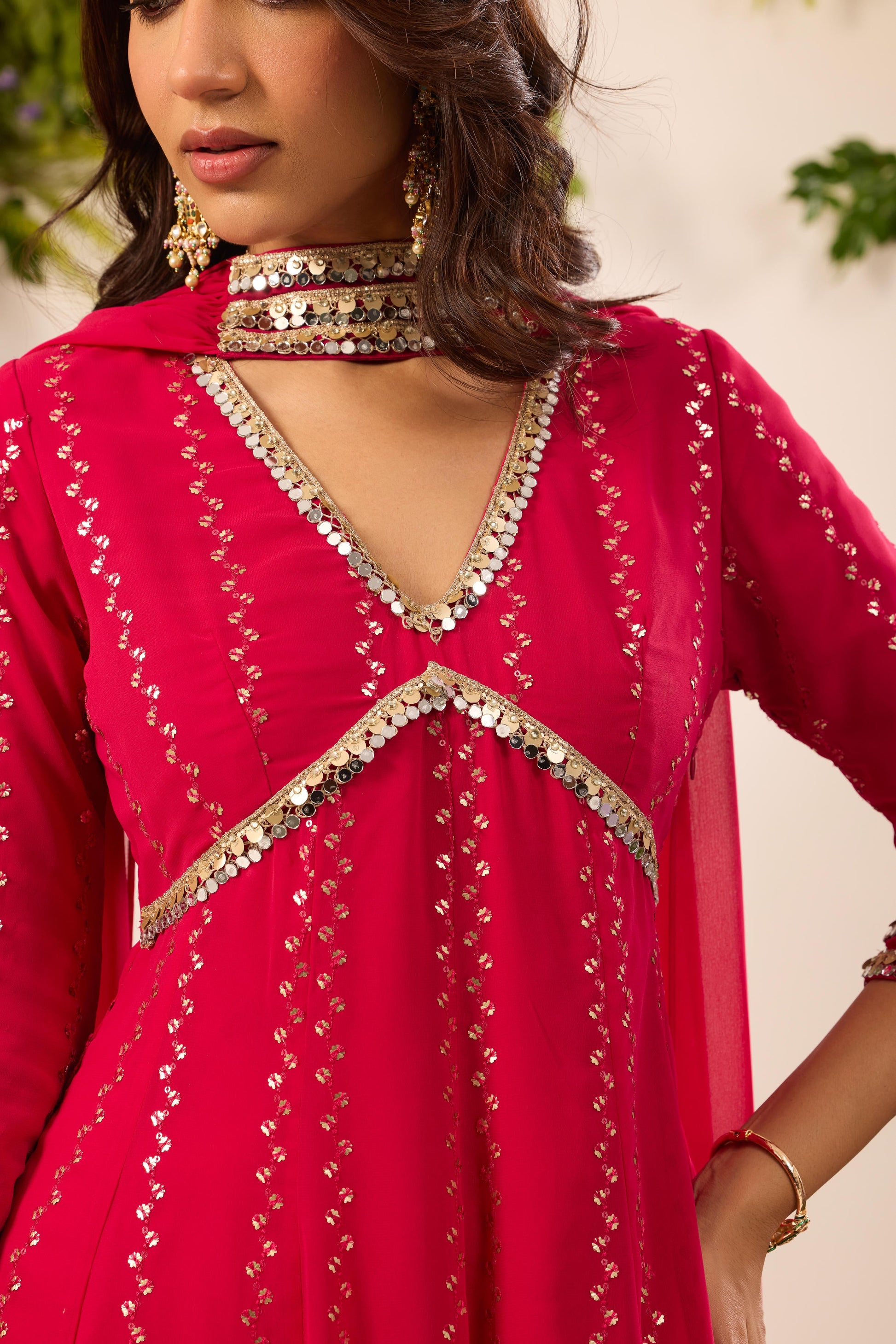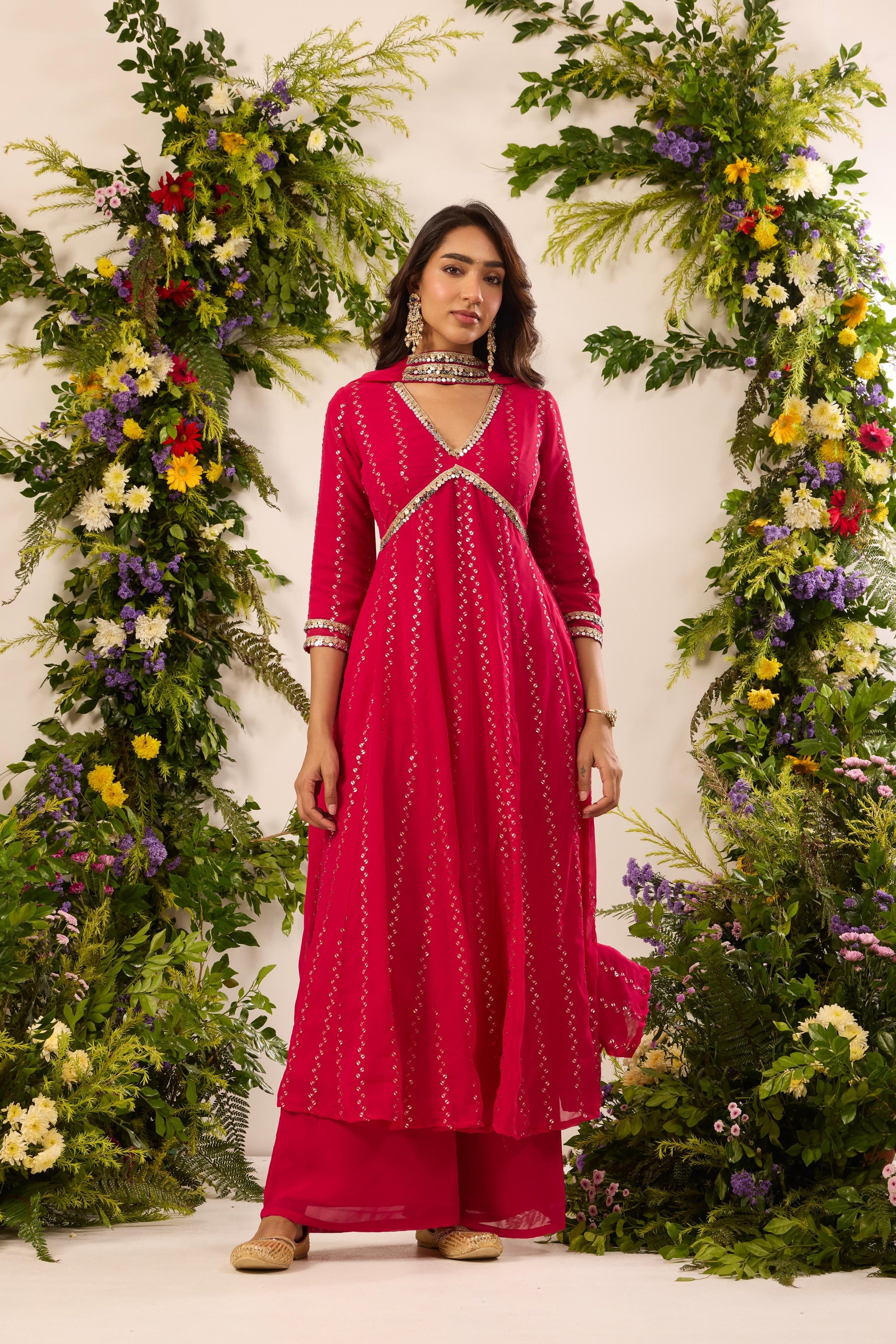 The Mastaani Rani Mirror Anarkali Set is crafted in georgette with tonal embroidery and all-over mirror-work lace that adds festive sparkle. Designed with a deep V-neckline and three-quarter sleeves, the silhouette flows into a full, flared cut for dramatic movement.