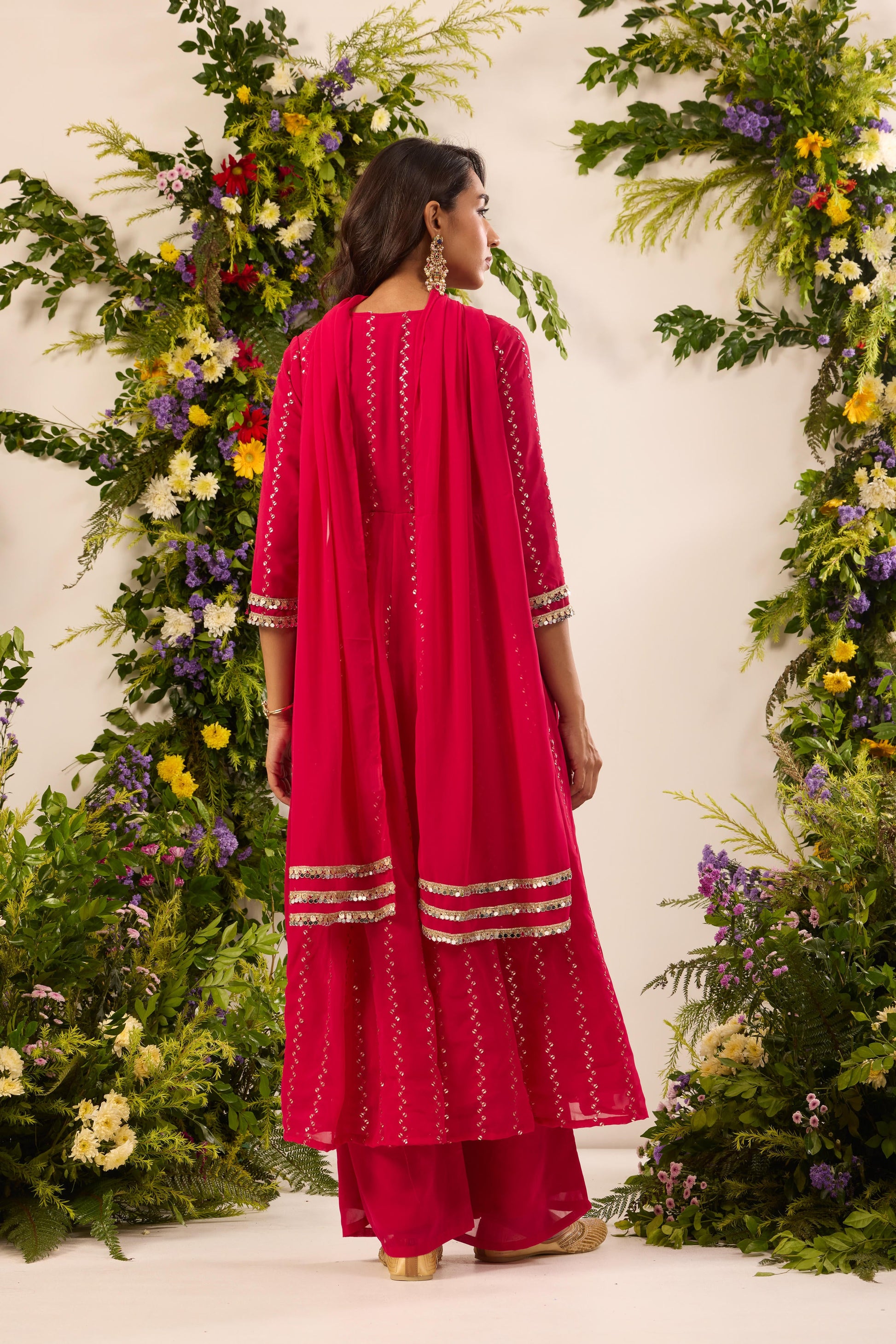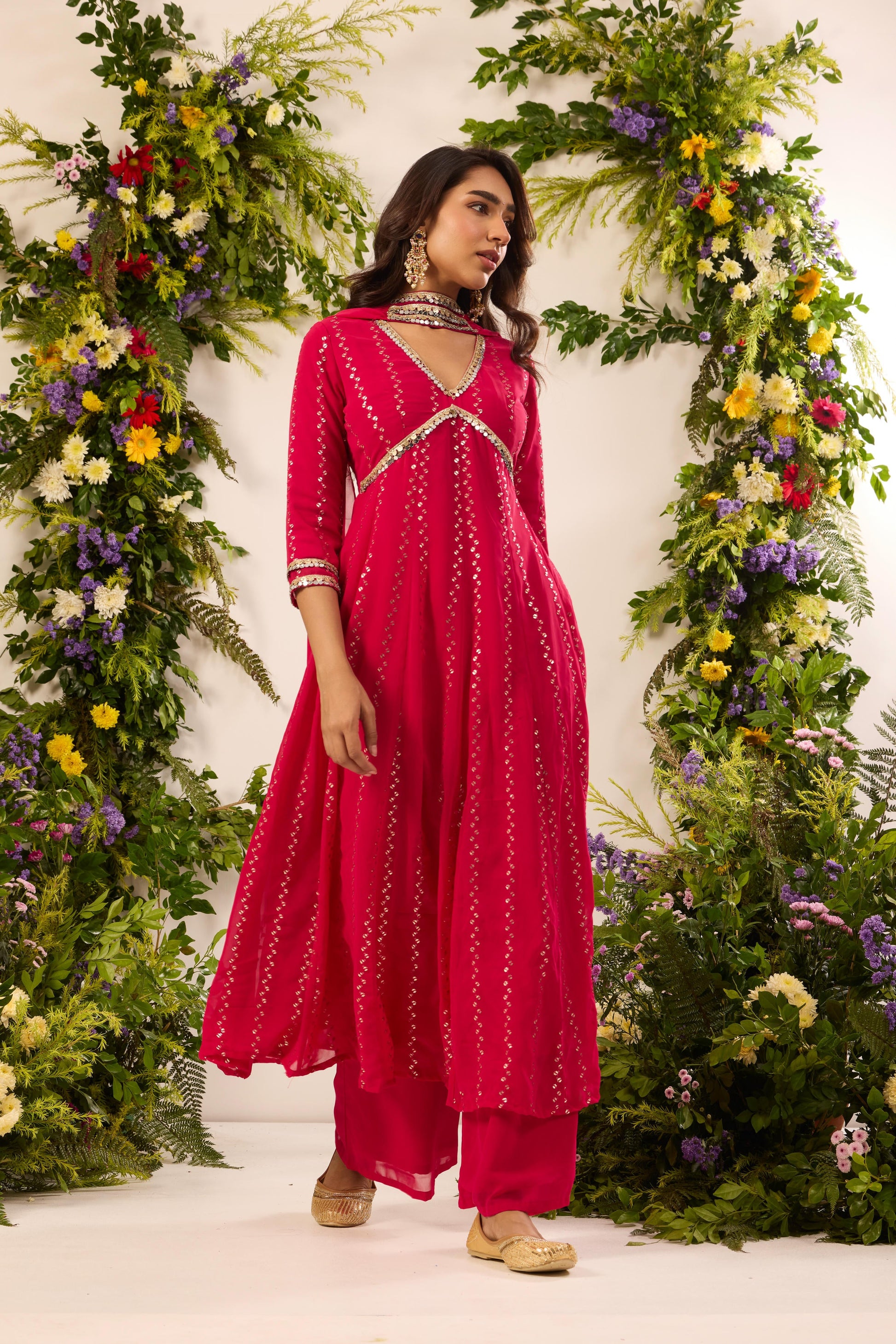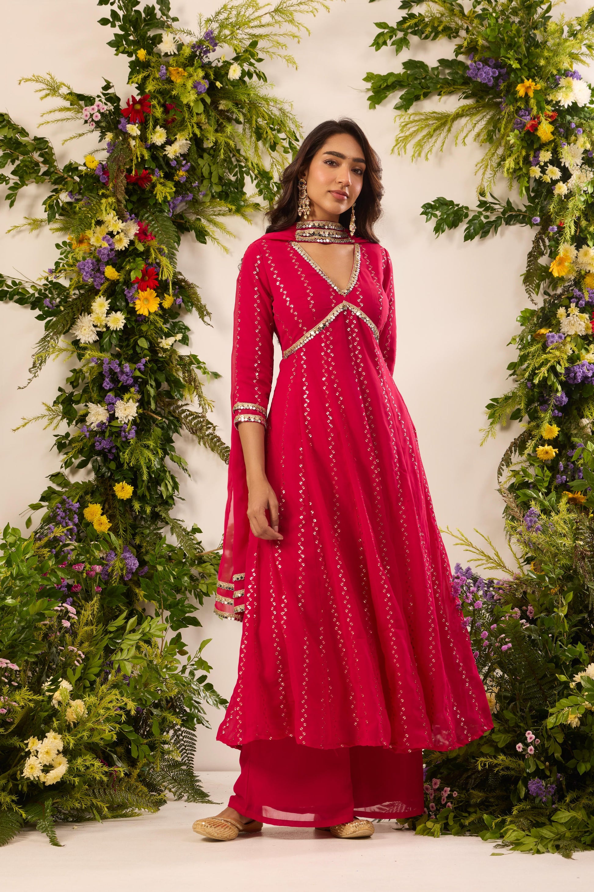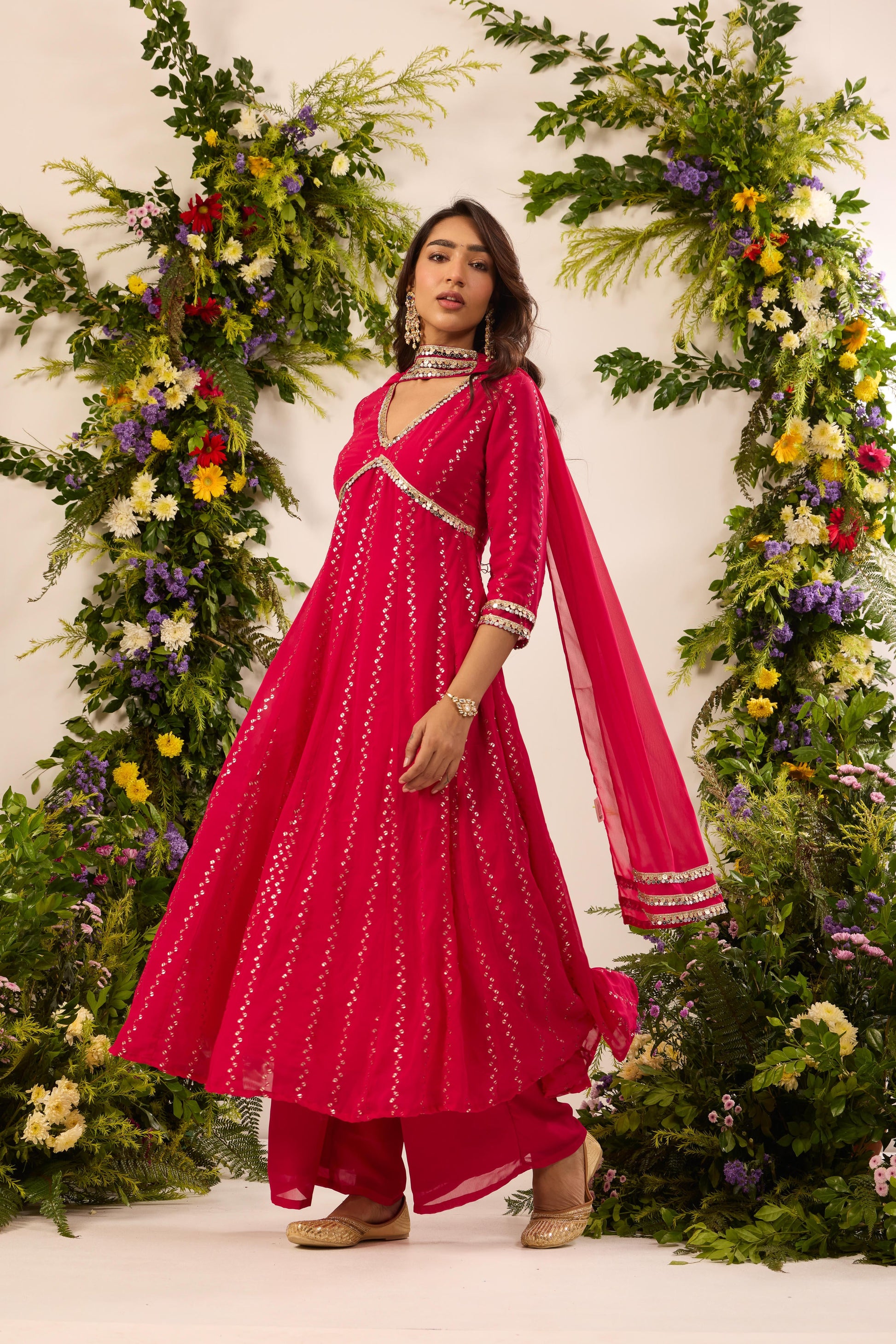 The Mastaani Rani Mirror Anarkali Set is crafted in georgette with tonal embroidery and all-over mirror-work lace that adds festive sparkle. Designed with a deep V-neckline and three-quarter sleeves, the silhouette flows into a full, flared cut for dramatic movement.