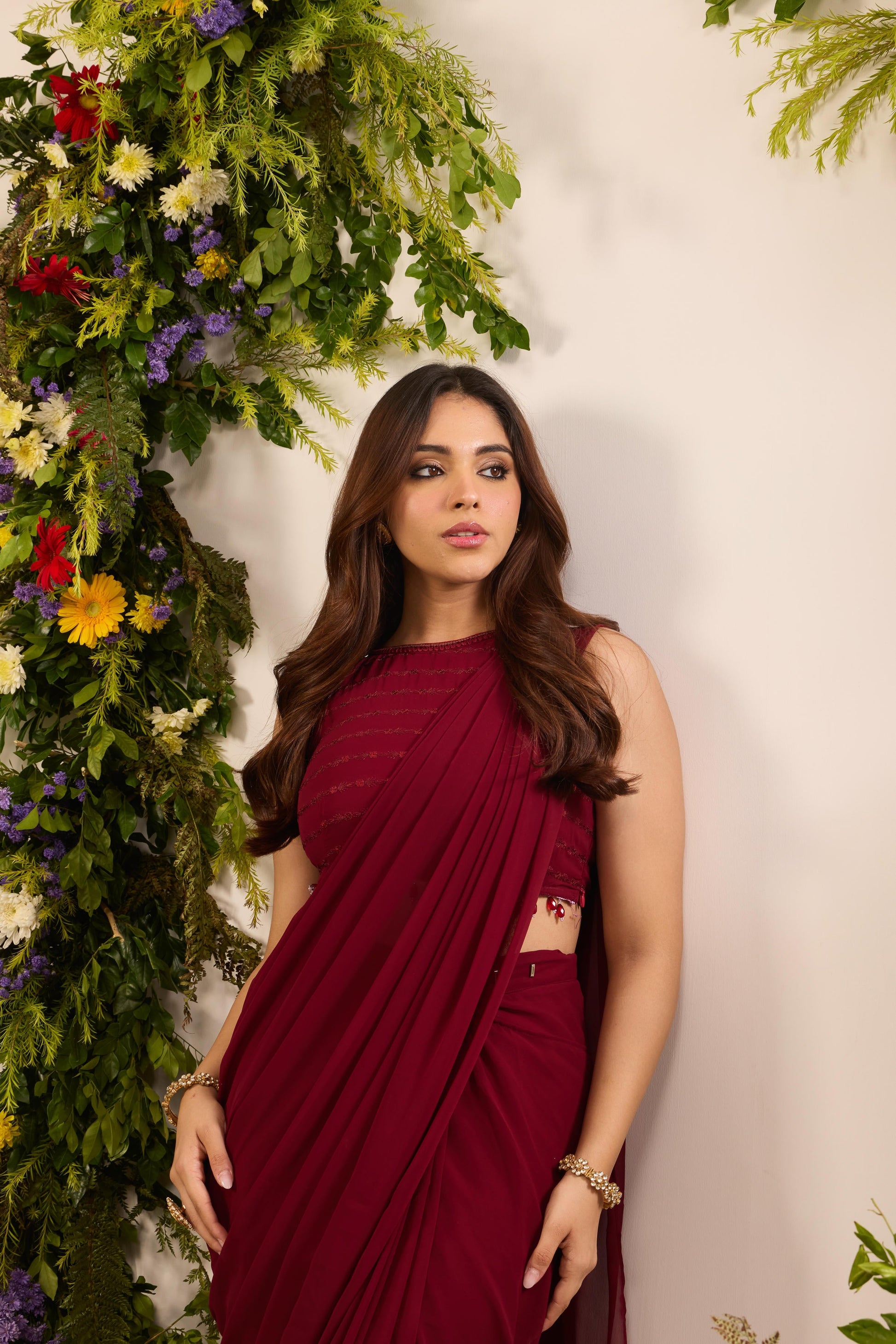 The Mastaani Ruby Drape Saree Set blends classic elegance with contemporary ease. Crafted in rich georgette, the pre-draped saree flows effortlessly, offering comfort without compromising on sophistication.