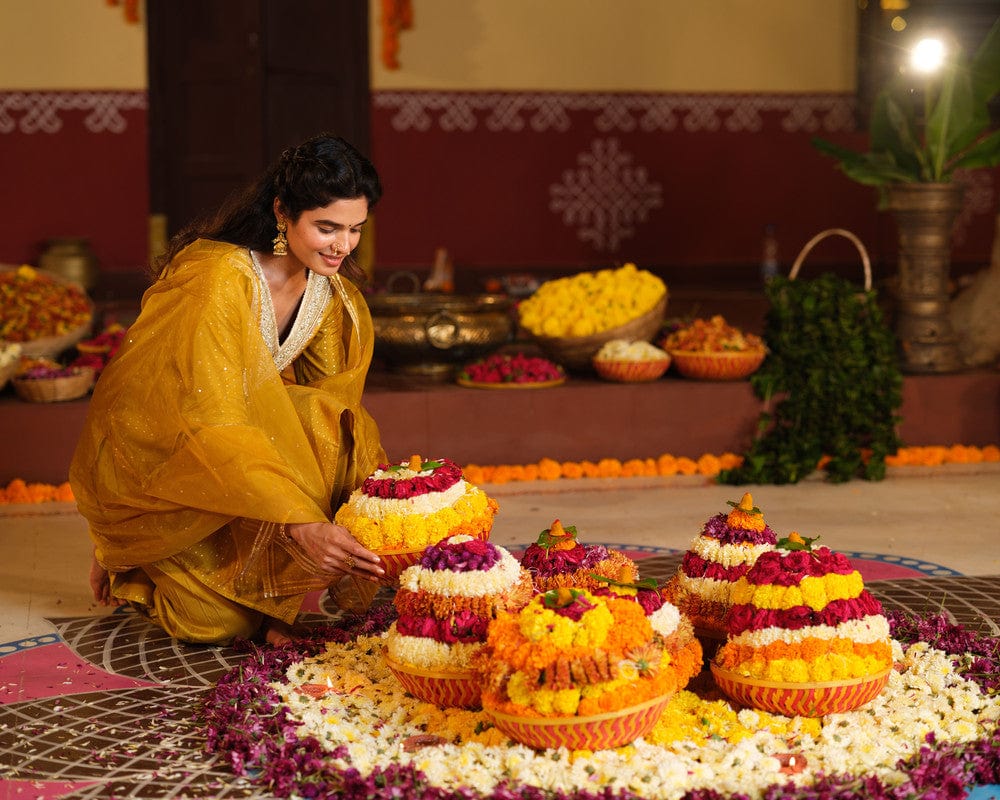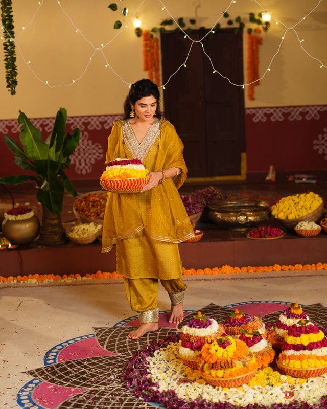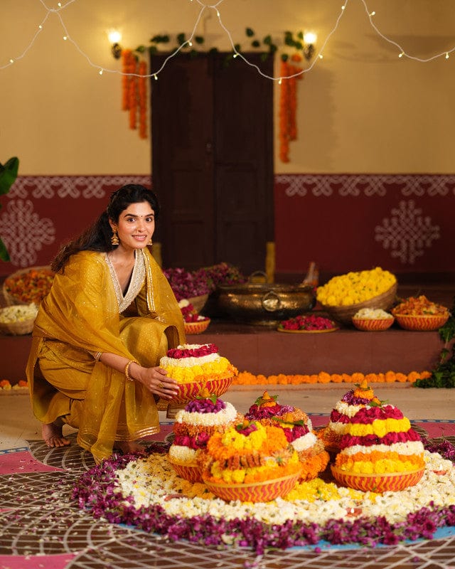 Exquisite Kurta Set designed for Bathukamma celebrations Crafted from luxurious Chanderi fabric Features intricate embroidery and shimmering silver thread work Pull-on kurta with a flattering V-neck and straight silhouette Calf-length design with elegant 3/4th sleeves and lace fabric cuffs Convenient side slits for comfort and ease of movement Paired with chic hem-cuffed pants in the same Chanderi fabric Ankle-length pants with a mid-rise cut and partial elastic waistband Regular fit without sacrificing style Solid color enhanced by beautiful silver thread work Ideal for any festive occasion Easy care: normal wash, avoid bleach, wash light colors separately Embrace elegance and tradition with this stunning kurta set