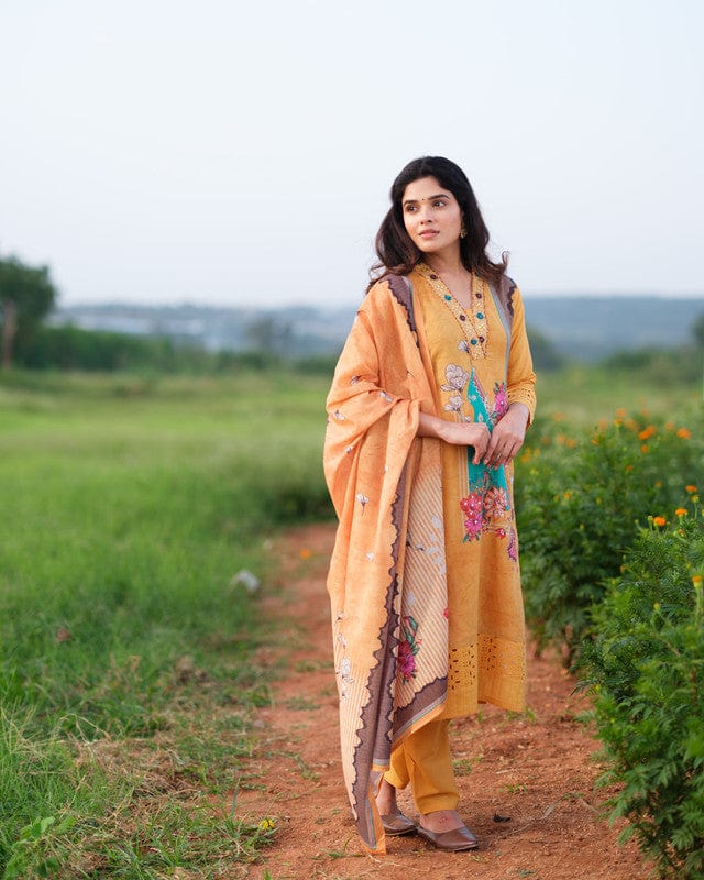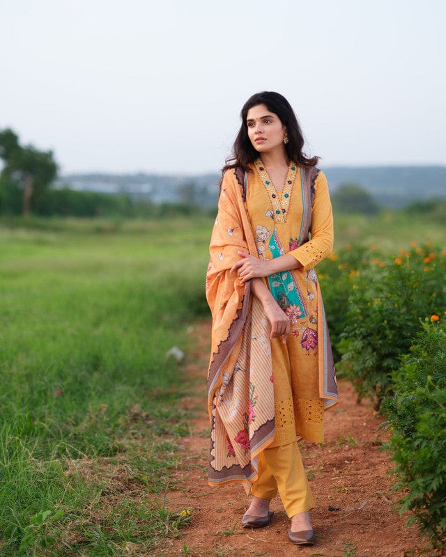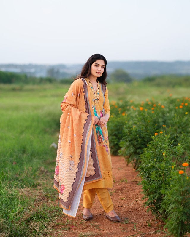 Mustard 3/4th Slevees Cotton Floral Calf Length Kurta Set - With Dupatta