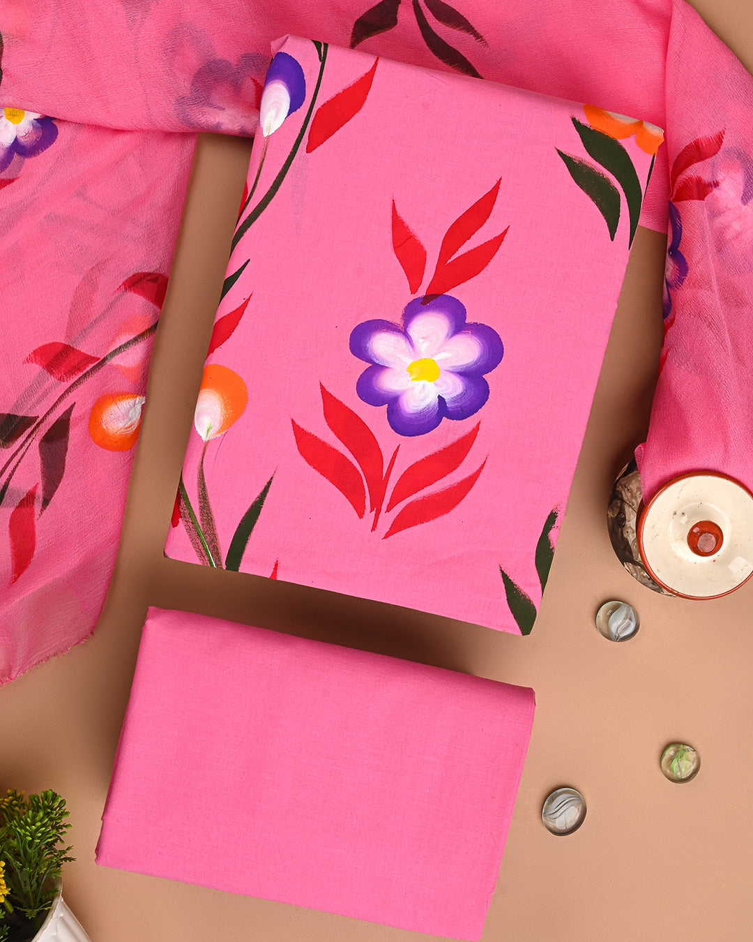 New Hand Printed Cotton Suit With Chiffon Dupatta CFCOTCH52