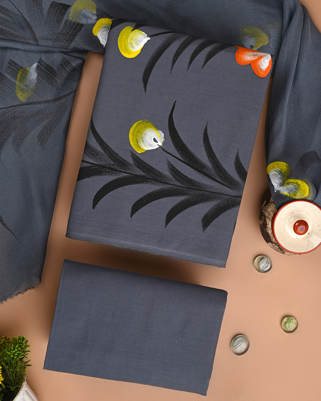 New Hand Printed Cotton Suit With Chiffon Dupatta (CFCOTCH53)