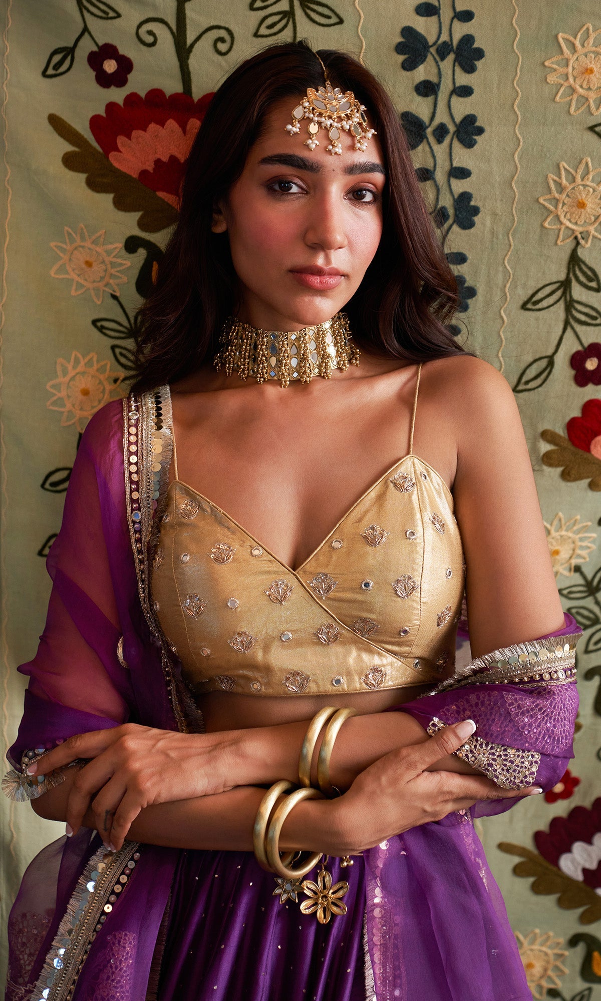 Noorani Embroidered Purple Lehenga With Strap Golden Blouse And Dupatta ( Set Of 3)