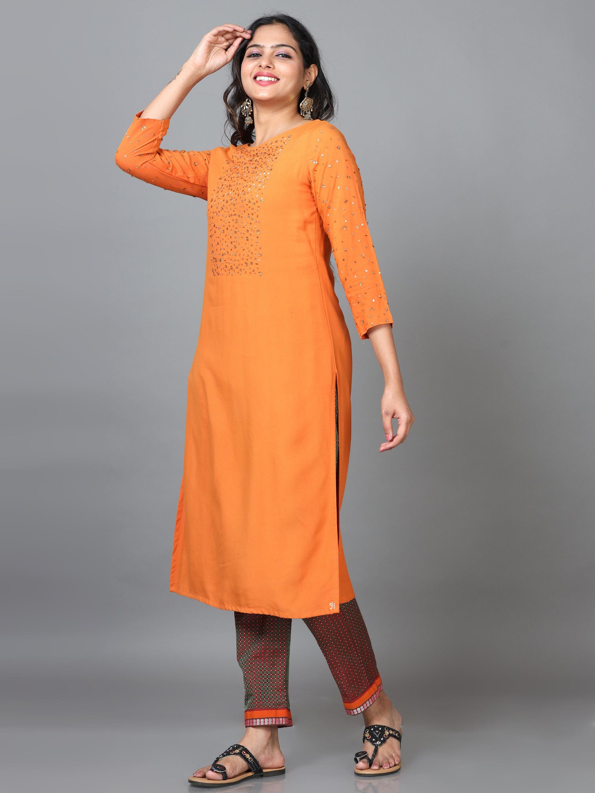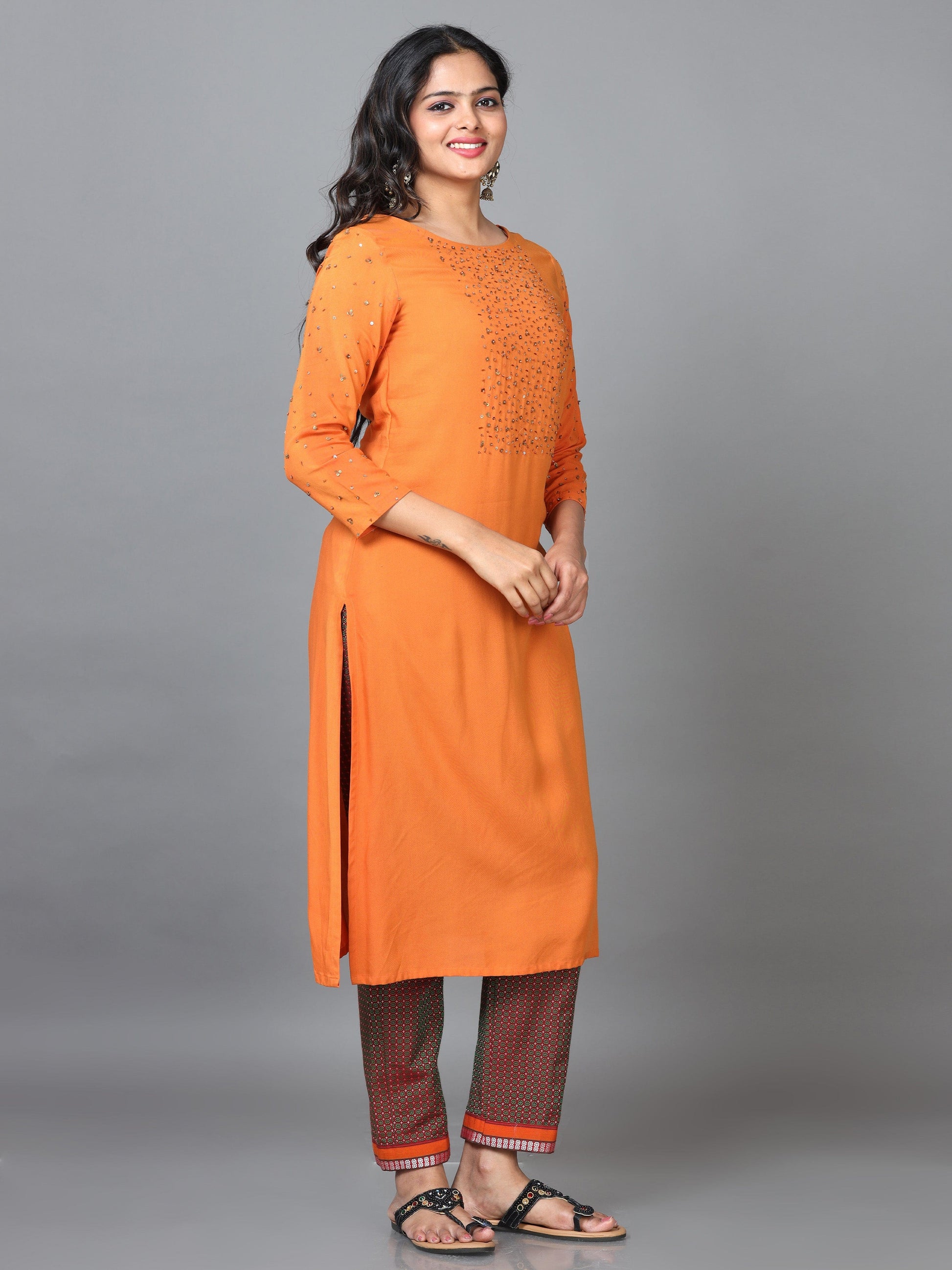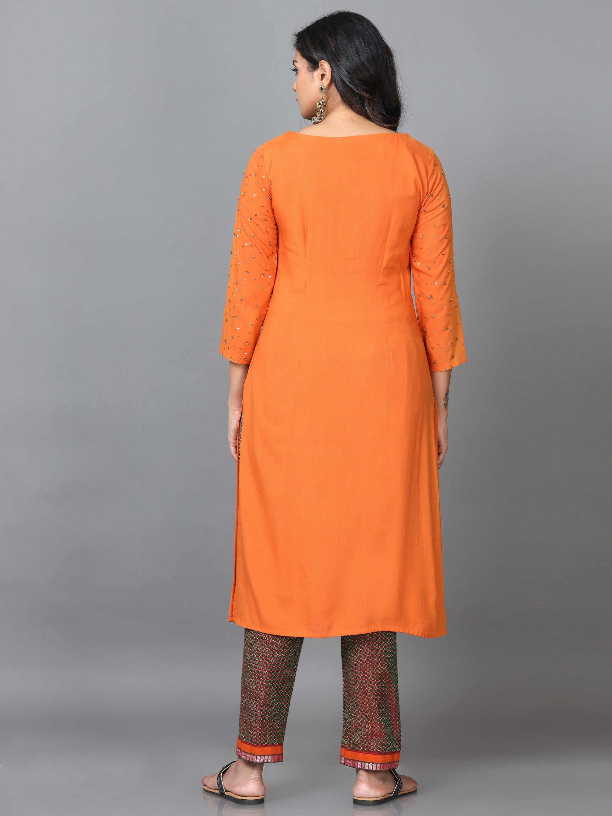 Orange 3/4 Sleeve Rayon Solid Straight calf-long Kurta Set